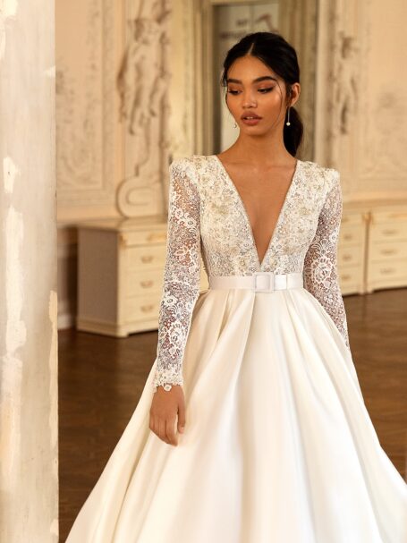 Romance, Plus SizeFelicity is a lace wedding dress with long sleeves and an extravagant low neck. This ball gown combines different lace patterns which make it eye-catching. An exuberant corsage is vastly decorated with lace patterns. A combination of lace and veiling looks splendid.