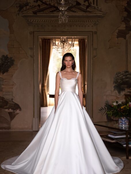 PalermoA skin-tight gown with sweeping train, sweetheart neckline and off-the-shoulder long fitted regal sleeves. All covered in sequins and crystal pendants Parvin features spectacular embroidered patterned lace. Accessorized with a fantistic satin overskirt, it takes on extra volume for a grand down-the-aisle entrance.