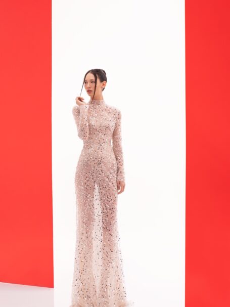 With the 22131, elegance is just a step away. Its sparkle, tulle fabric and a-line silhouette make it the perfect companion for any grand evening.