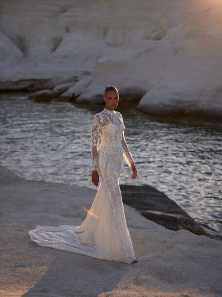 Classic bridal styles don’t mean outdated! The high-neck bridal gowns embellished with jewels, lace, and appliques can be a true statement of powerful feminine energy! A real fashionista knows that if you want to make a statement, you need to reveal your assets. Go for an enchanting sequined Brooke gown with a mock neck, long sleeves, brave high slit, and low back. Another way to WOW the crowd is to combine high necklines with a mini hemline, like a stunning closed dress Romie.