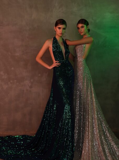 Glam VibesThe 19102 evening gown promises an evening of allure and admiration. Its rich mikado silk, sparkle, tulle and a-line silhouette make it a true masterpiece.