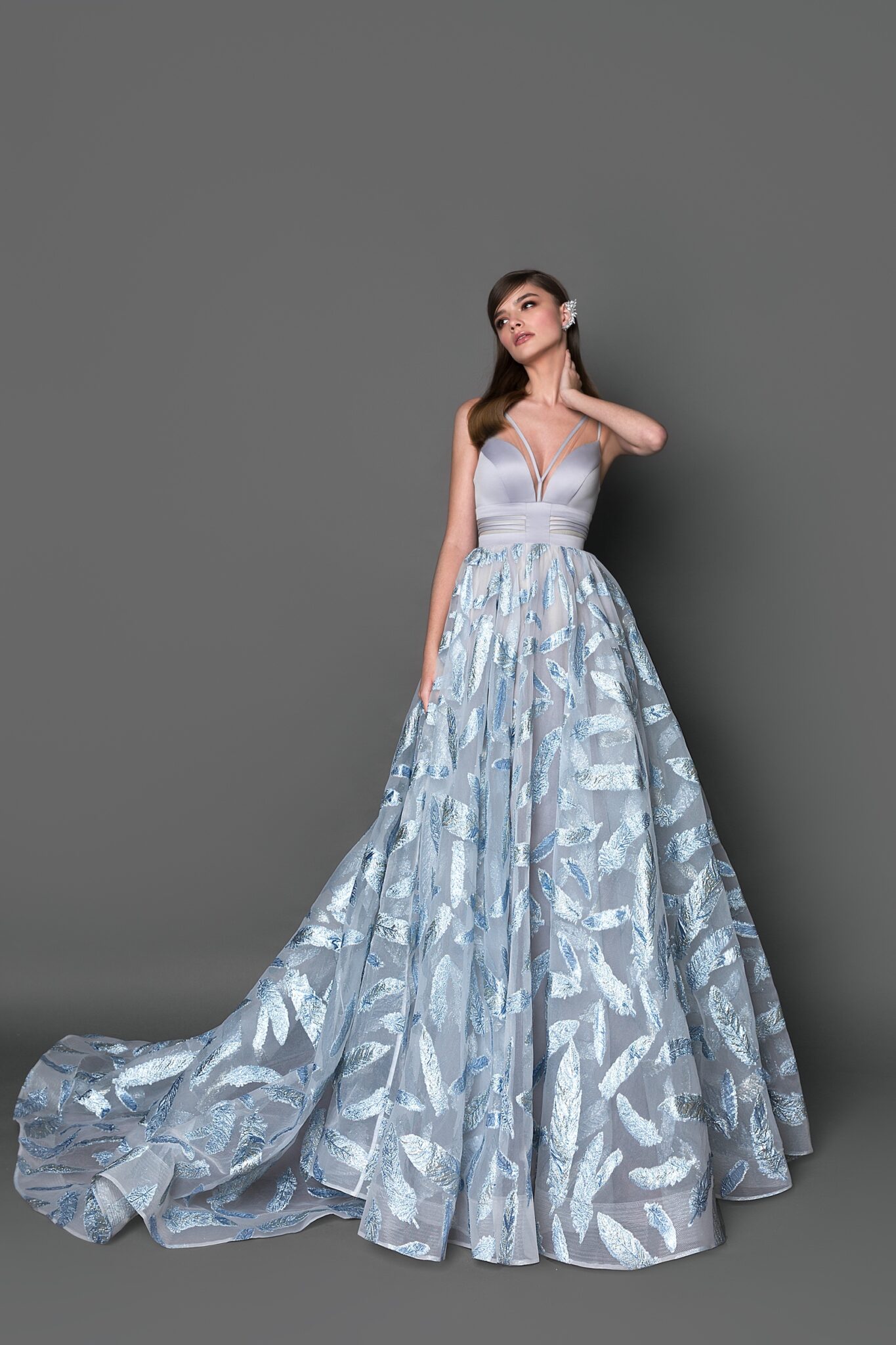 Glam VibesThe 19102 evening gown promises an evening of allure and admiration. Its rich mikado silk, sparkle, tulle and a-line silhouette make it a true masterpiece.