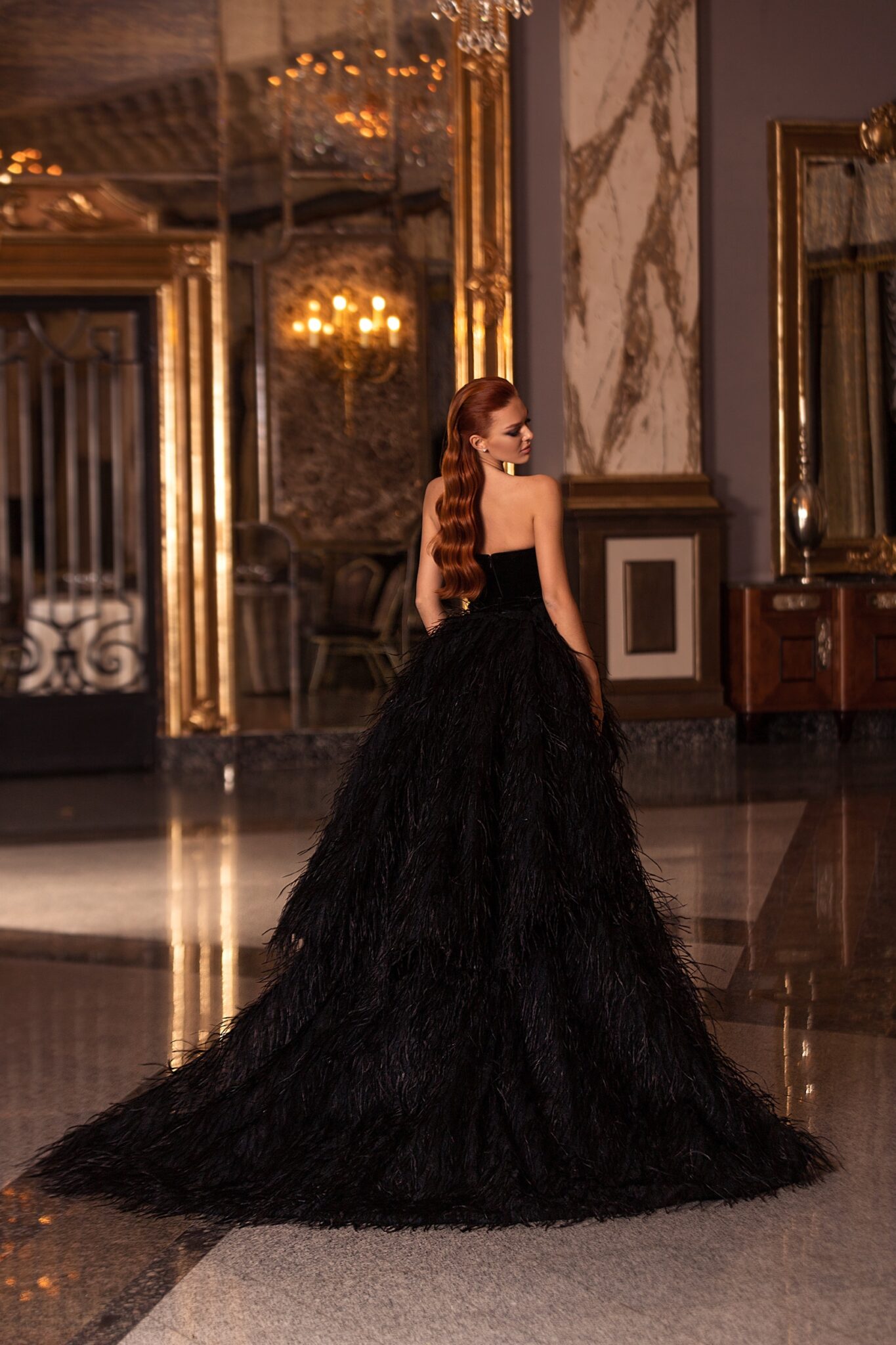 EuphoriaWith the 20208, make every entrance grand. The luxurious feathers, velvet paired with its fitted with overskirt silhouette makes it an unparalleled piece of art.