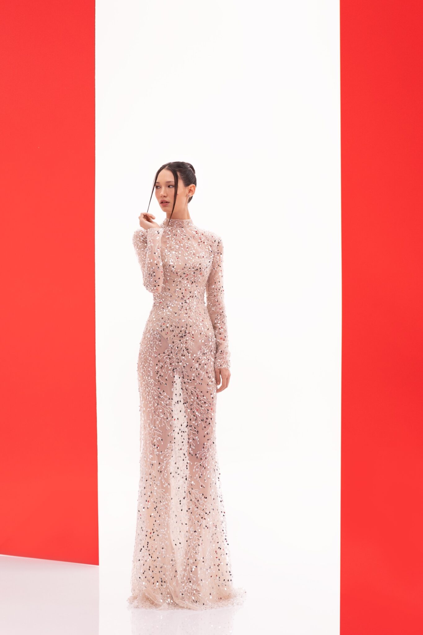 SS2022 Evening CollectionA blend of traditional elegance and modern design, the 22121 evening gown in its sparkle fabric is a sight to behold. The sheath silhouette adds to its majestic aura.
