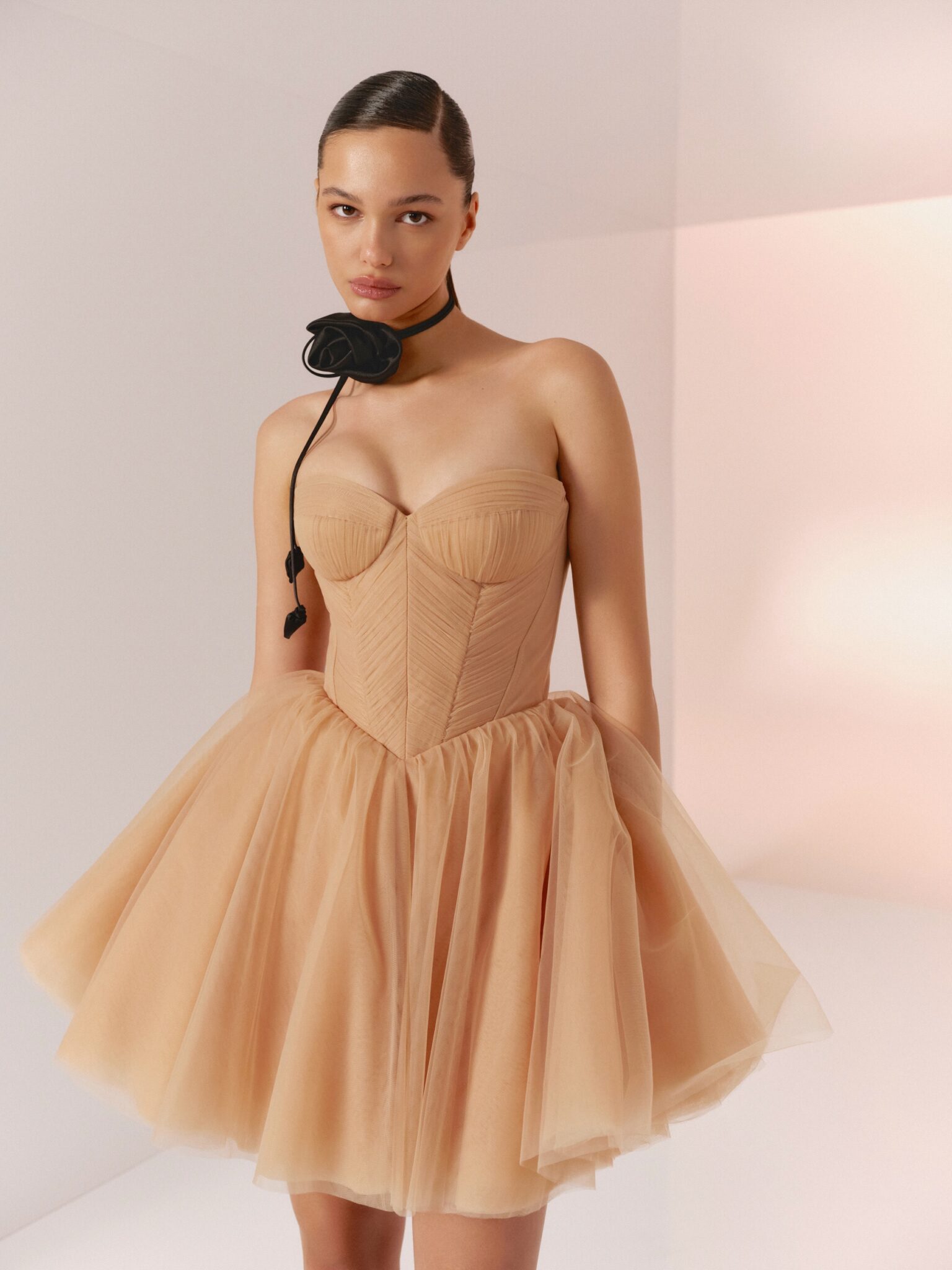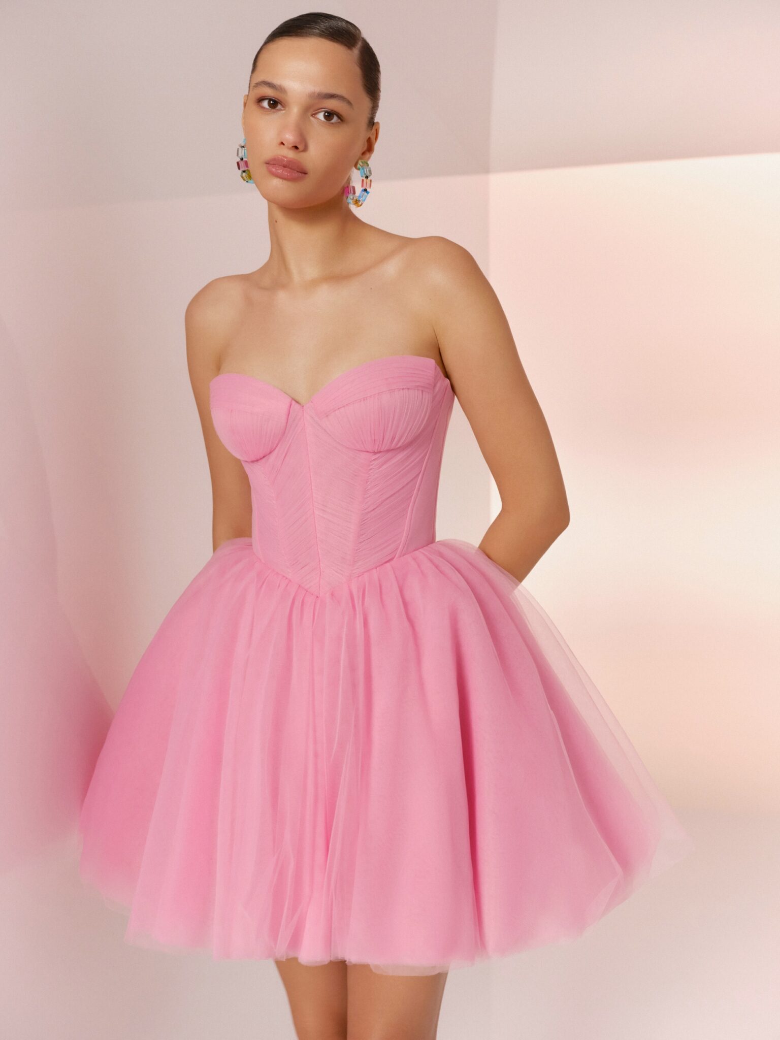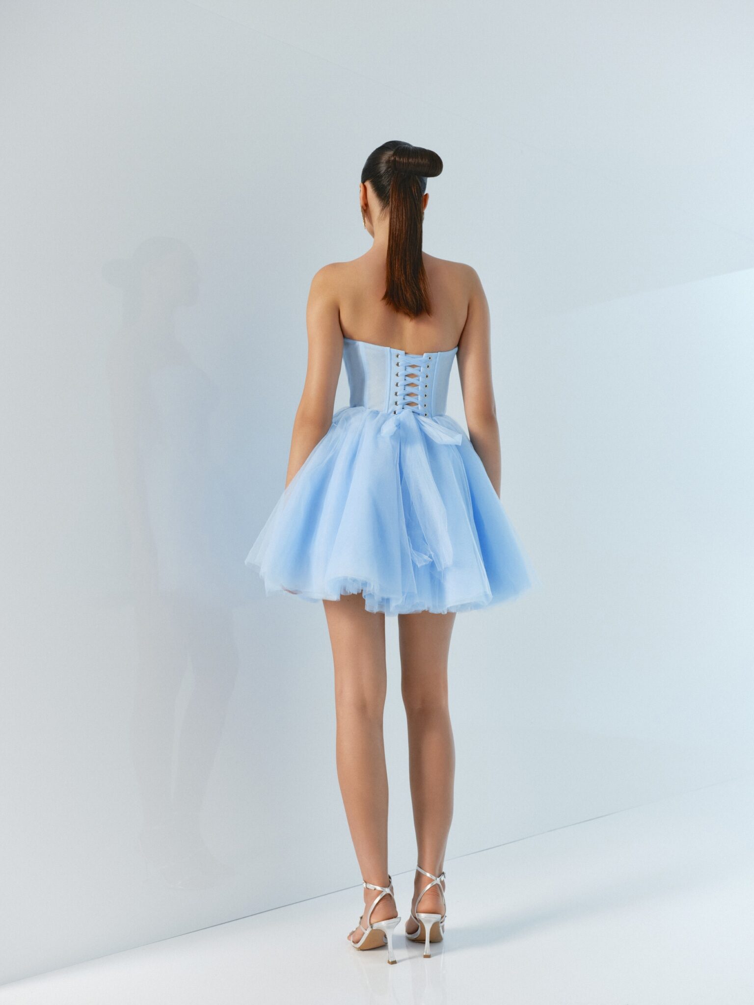 BridesmaidsMake a grand entrance in this short dress in pink, blue, cappuccino, lavender, black, yellow and green color options. The sweetheart neckline is both flattering and chic, and the tulle fabric drapes beautifully. The lace-up corset and the long detachable train with ruffles bring a touch of glamour, making it perfect for either a party or a wedding.