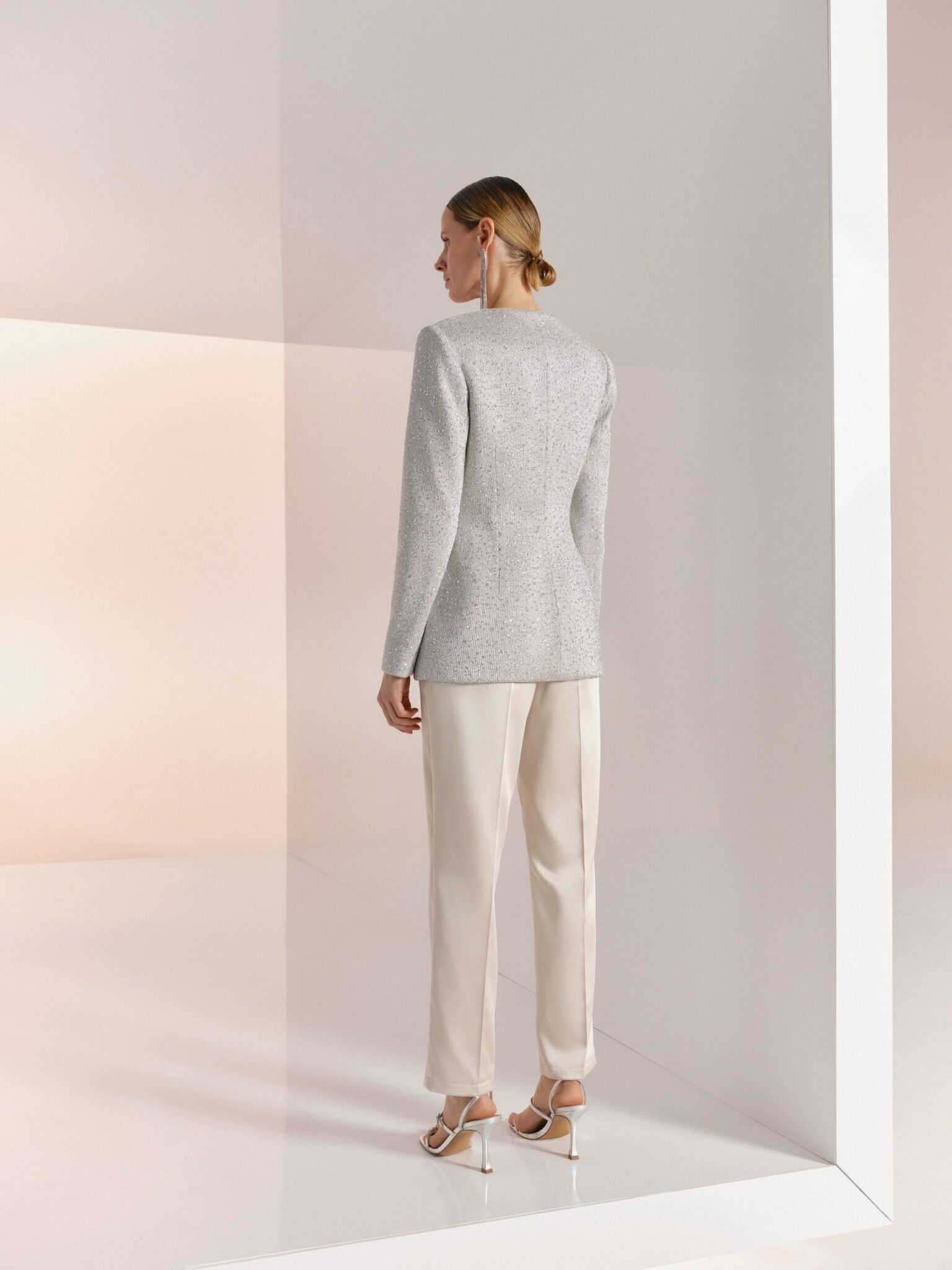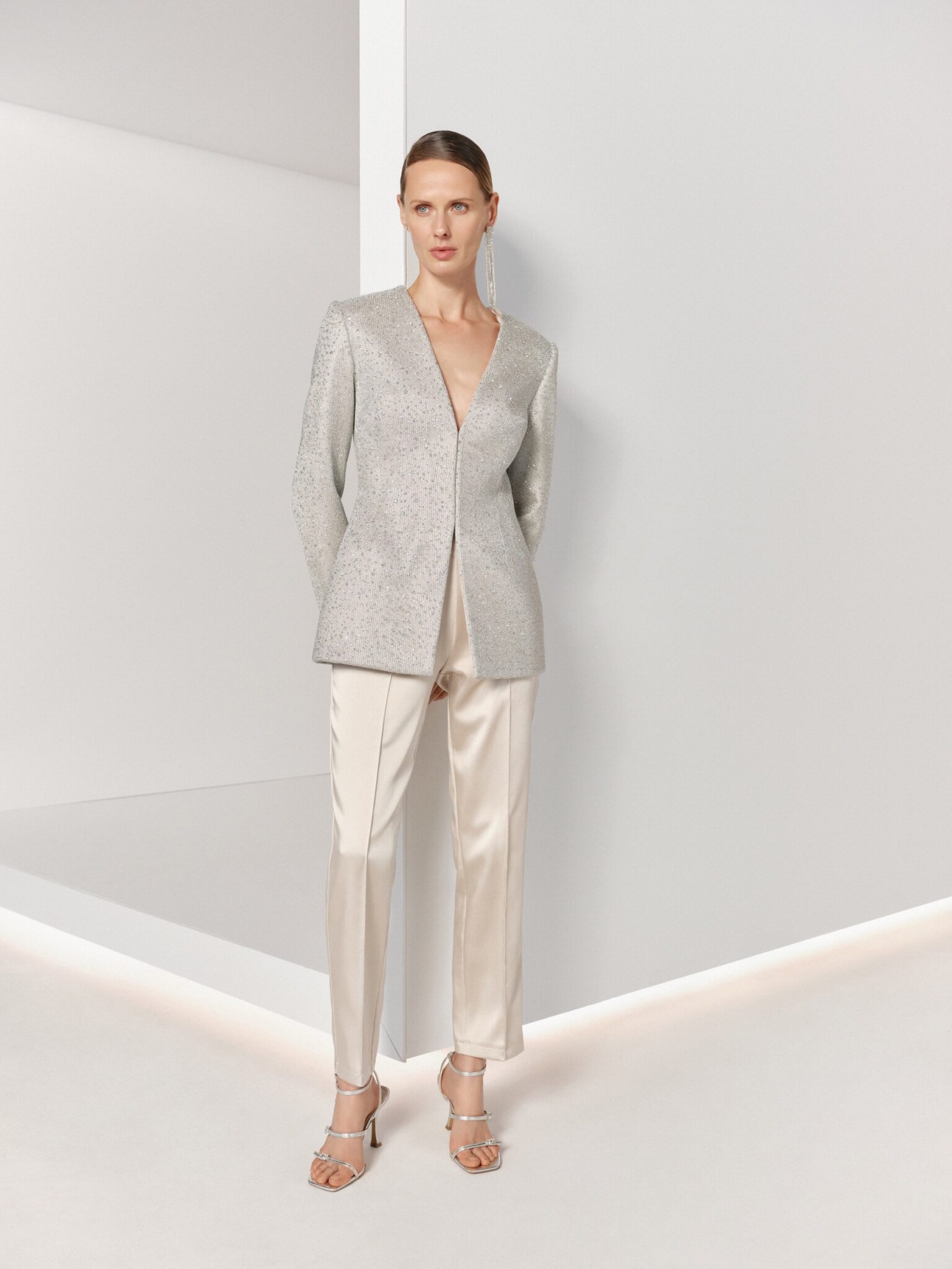 BridesmaidsThis stylish suit, composed of a fitted jacket crafted from solid glitter mesh and straight silk pants, exudes sophistication with its V-neckline and comes in versatile and chic colors like silver and black. Elevate your ensemble with this suit that seamlessly blends glamour and modern elegance.