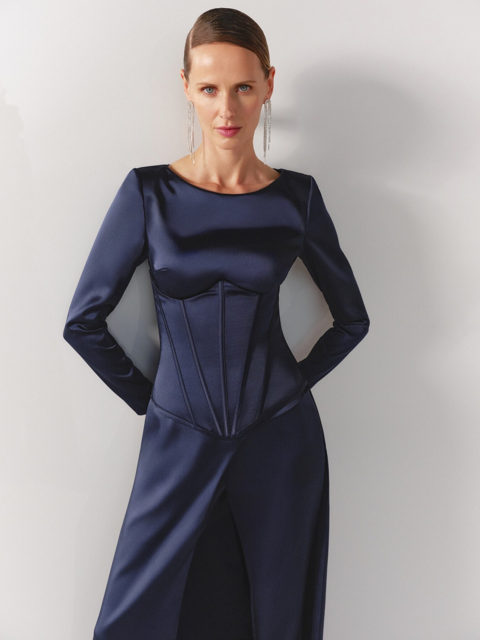 BridesmaidsThis suit ensemble seamlessly blends sophistication and style, boasting a lace-up corset atop a dress with a graceful boat neckline, paired with slim straight pants—all crafted from luxurious silk fabric. Choose between the classic and timeless navy or black options for a chic and refined look suitable for any occasion.