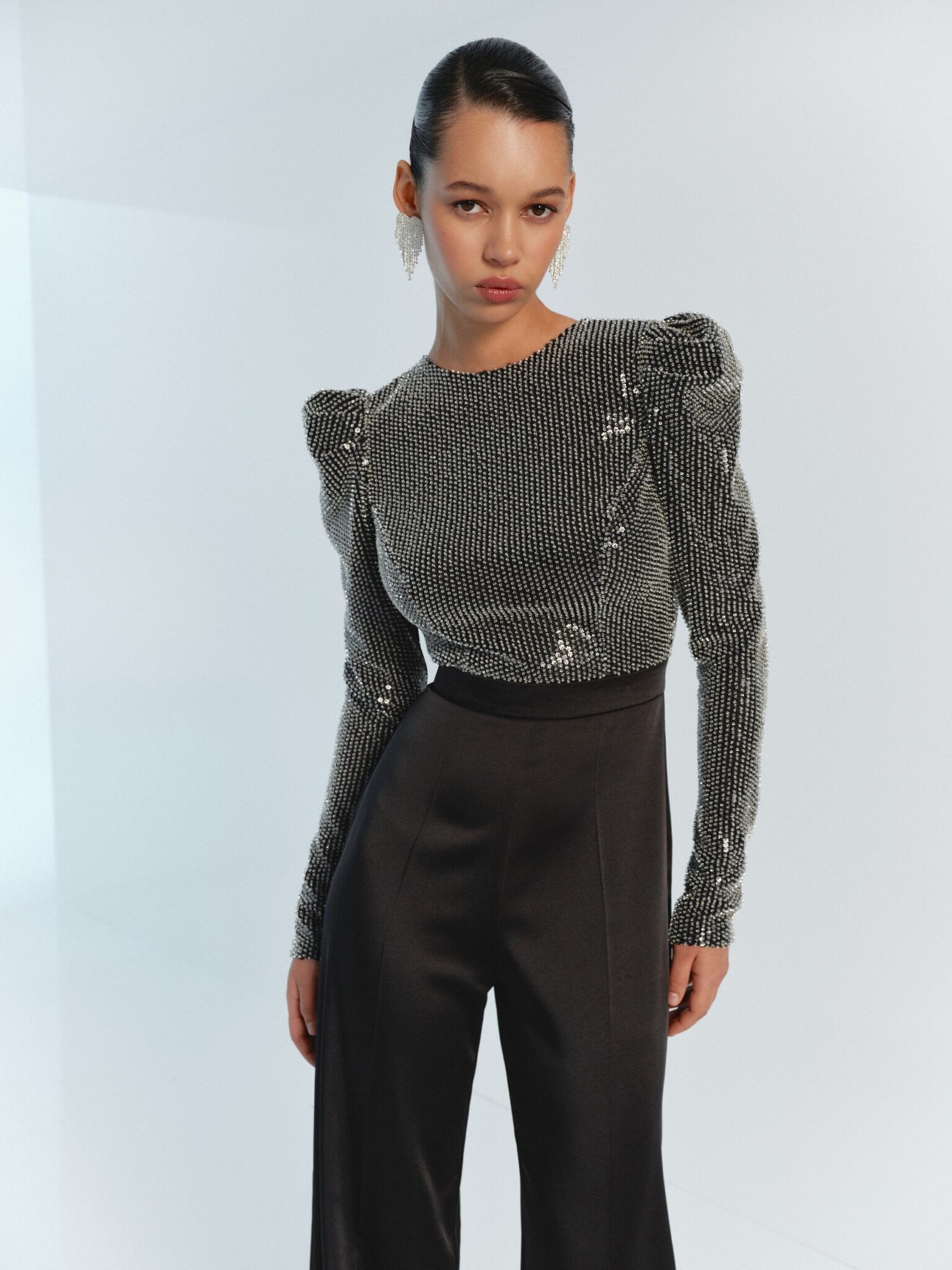 BridesmaidsStep into the spotlight with this jumpsuit that comes in a stunning black and ivory color options. Make a statement in this backless jumpsuit that seamlessly combines chic and comfort with palazzo pants, crafted from a luxurious suit fabric, featuring a stunning corset made of beaded fabric and elegant long sleeves. Embrace glamour and sophistication in one with this unique jumpsuit perfect for glamorous evening out or as an elegant wedding guest outfit.