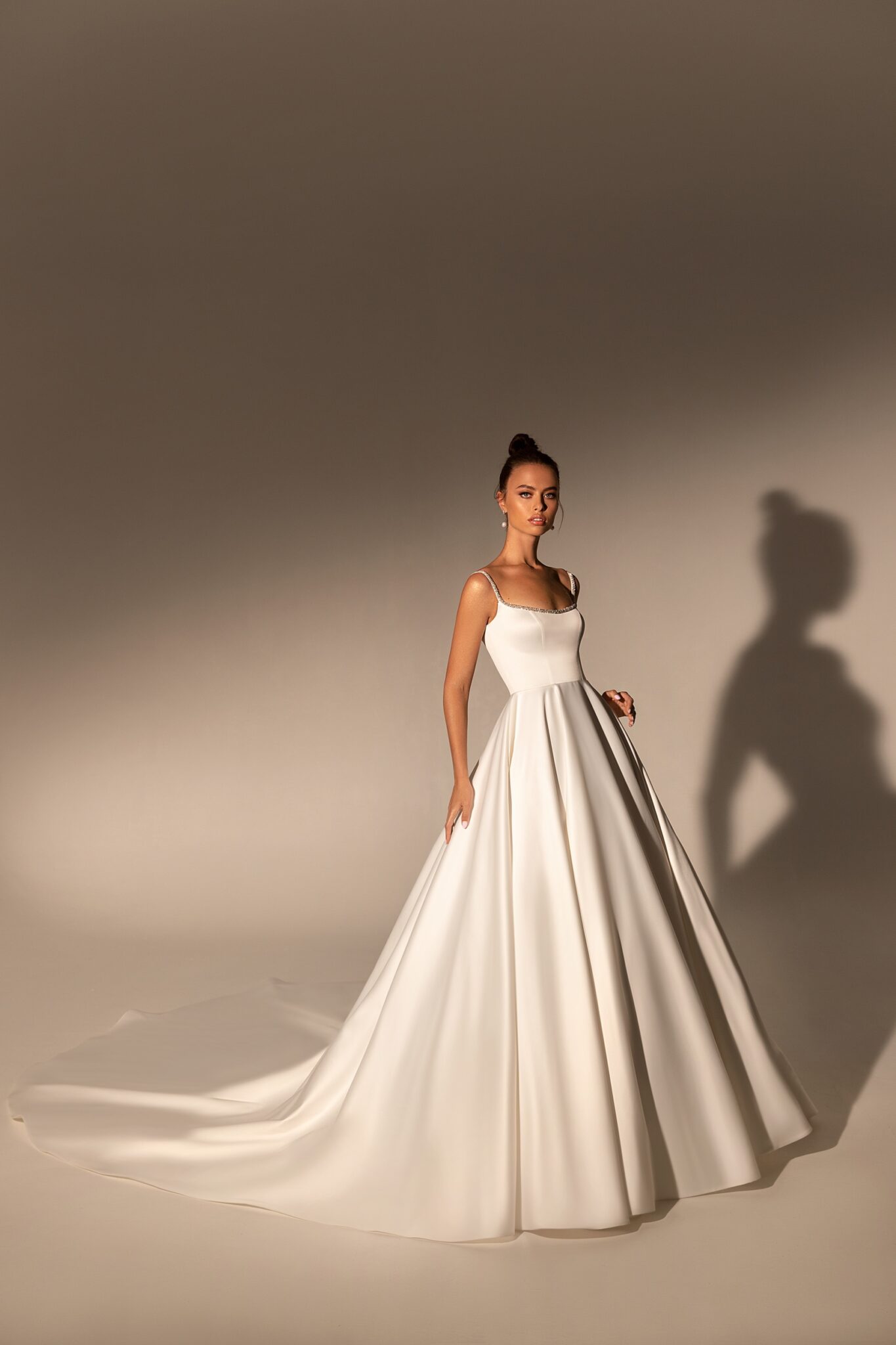 MuseA fantastic A-line wedding gown with neckline embroidered with glitters. Gorgeous wedding dress is made of satin. Exquisite train finishes the look.