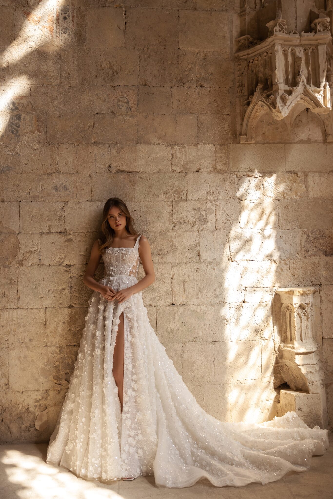 Love Spell, Plus SizeElevate your bridal style with this mesmerizing A-line wedding dress. Crafted with intricate 3D floral lace, it exudes grace and romance. The square neckline adds a touch of modern sophistication, while the high slit on the leg adds a hint of allure. As you walk down the aisle, the dress gracefully showcases every step, enhanced by the captivating long train that leaves a lasting impression. This dress is perfect for the bride who seeks a blend of elegance and boldness, ensuring all eyes are on her on this momentous day.