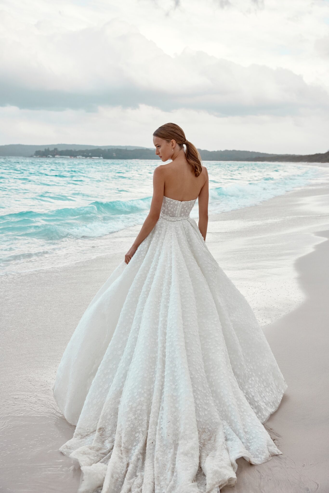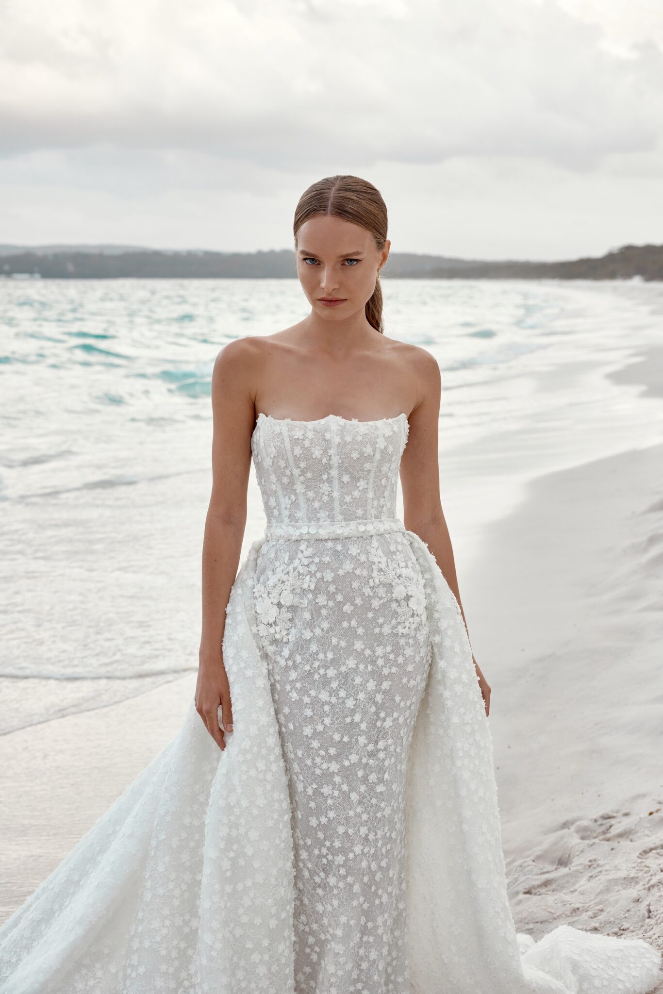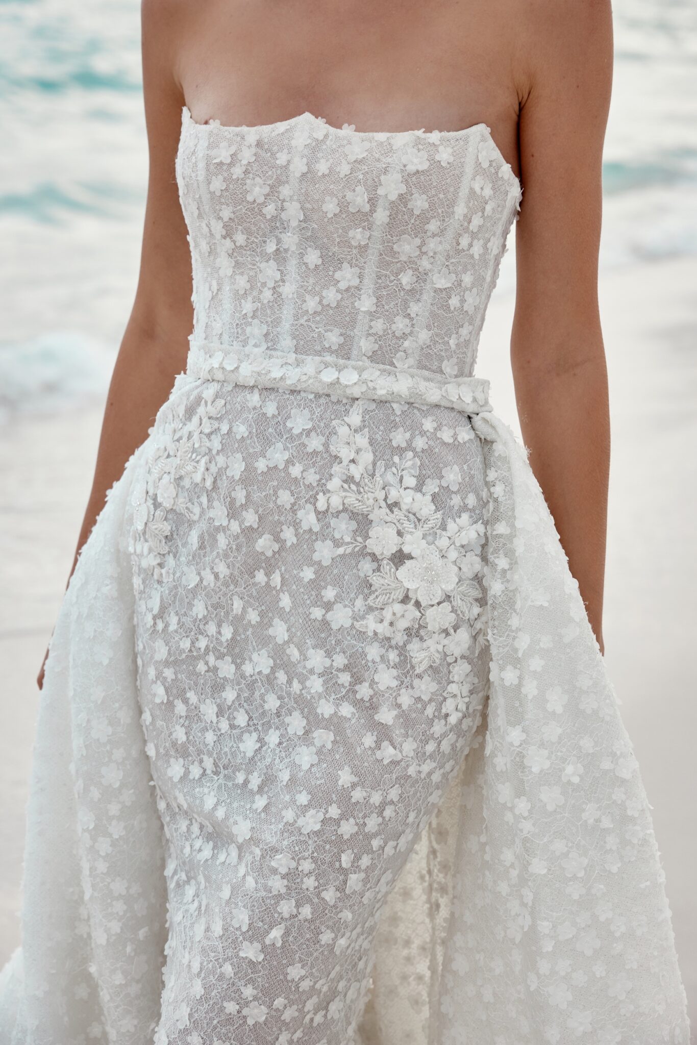 Atelier signature editionThis stunning wedding gown effortlessly combines classic elegance with a touch of whimsy. A fit and flare silhouette crafted from intricately beaded lace, adorned with exquisite 3D floral appliques. Its strapless neckline exudes timeless charm, while the detachable overskirt, with a cascading train in the same fabric, adds an enchanting element of drama.