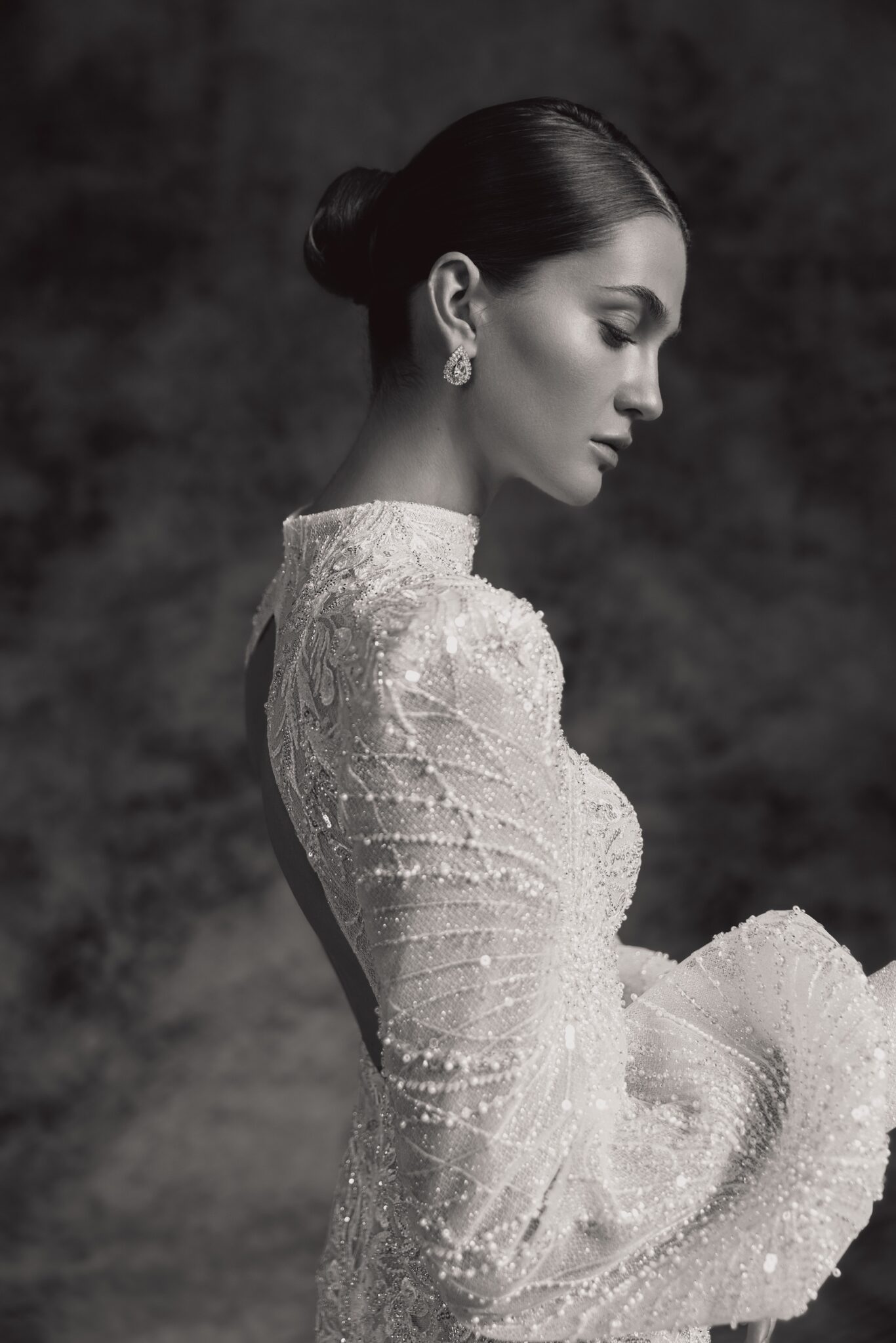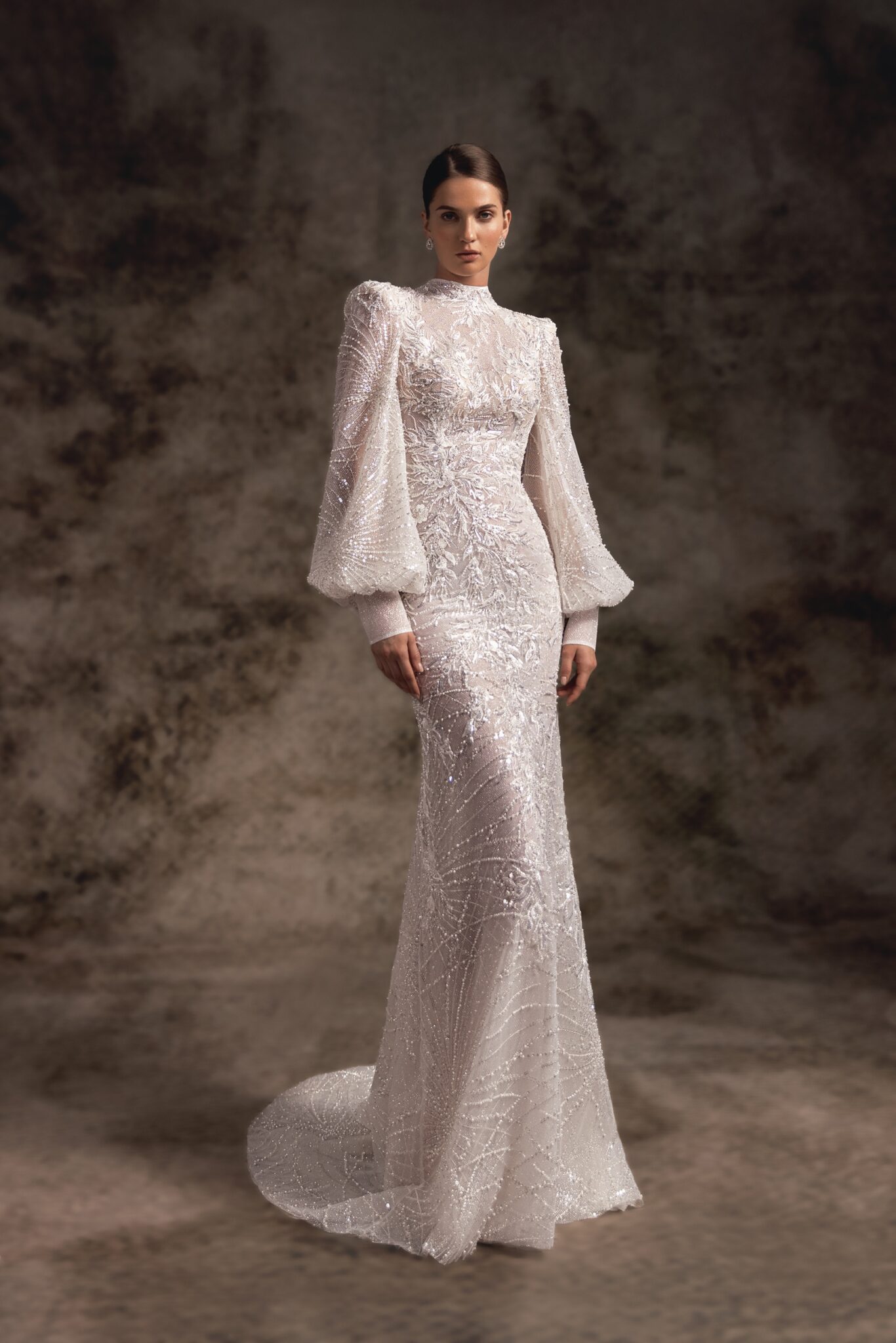 Notte d'OperaAlana is a sparkly illusion low-back fitted wedding gown made of delicate embroidered lace with long strong-shouldered lantern sleeves and high neck neckline. Exquisite embroidered web-patterned lace makes this stunning dress an elegant option for the glam and modern bride.
