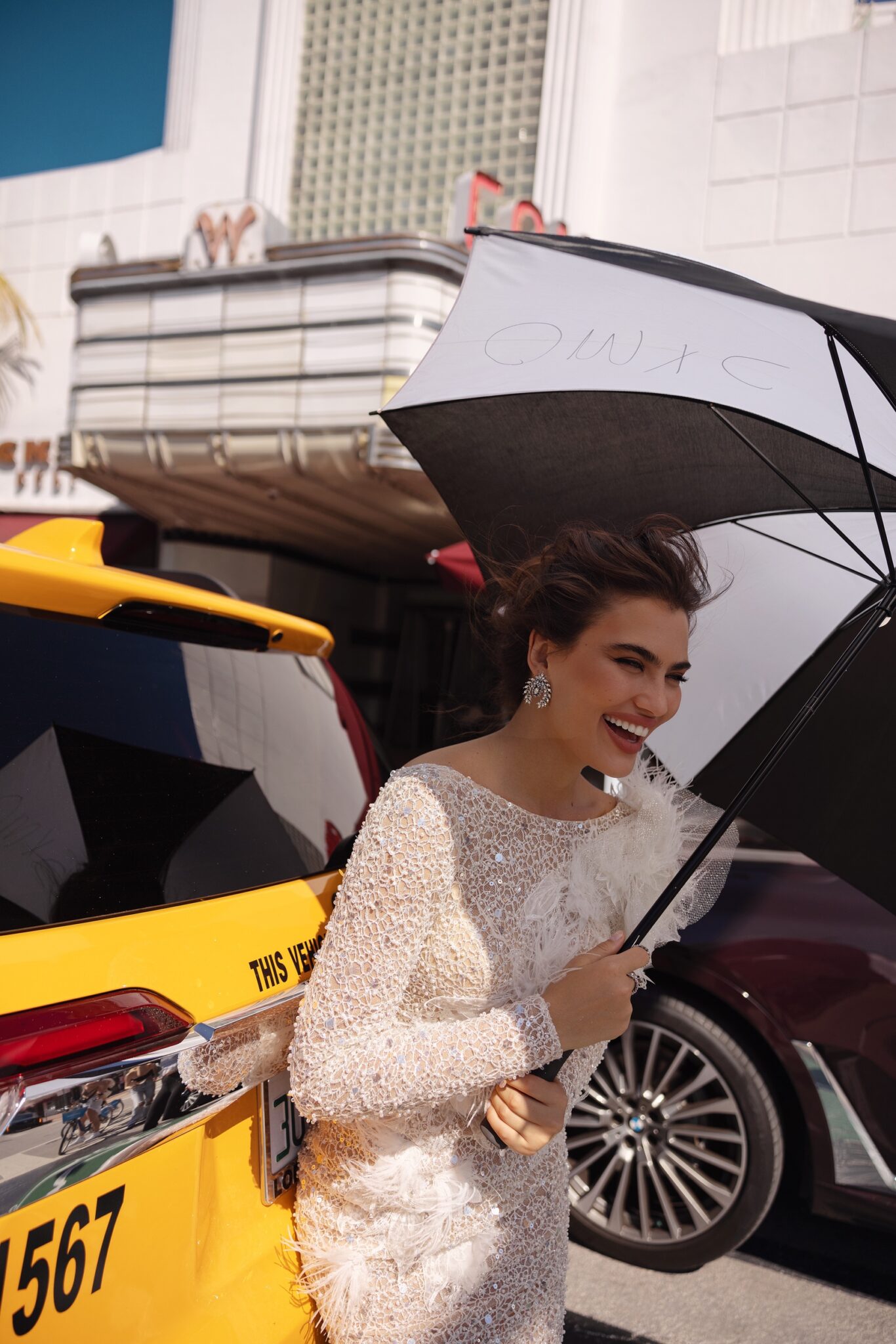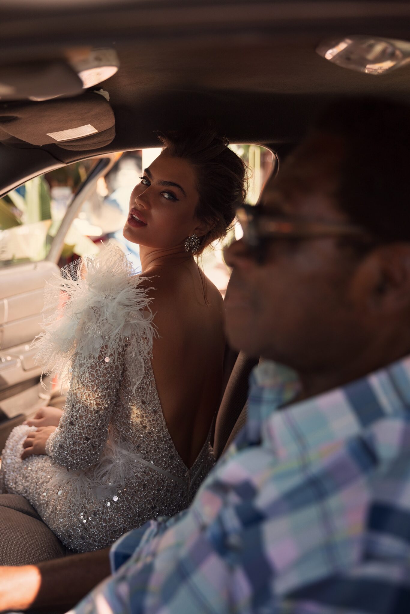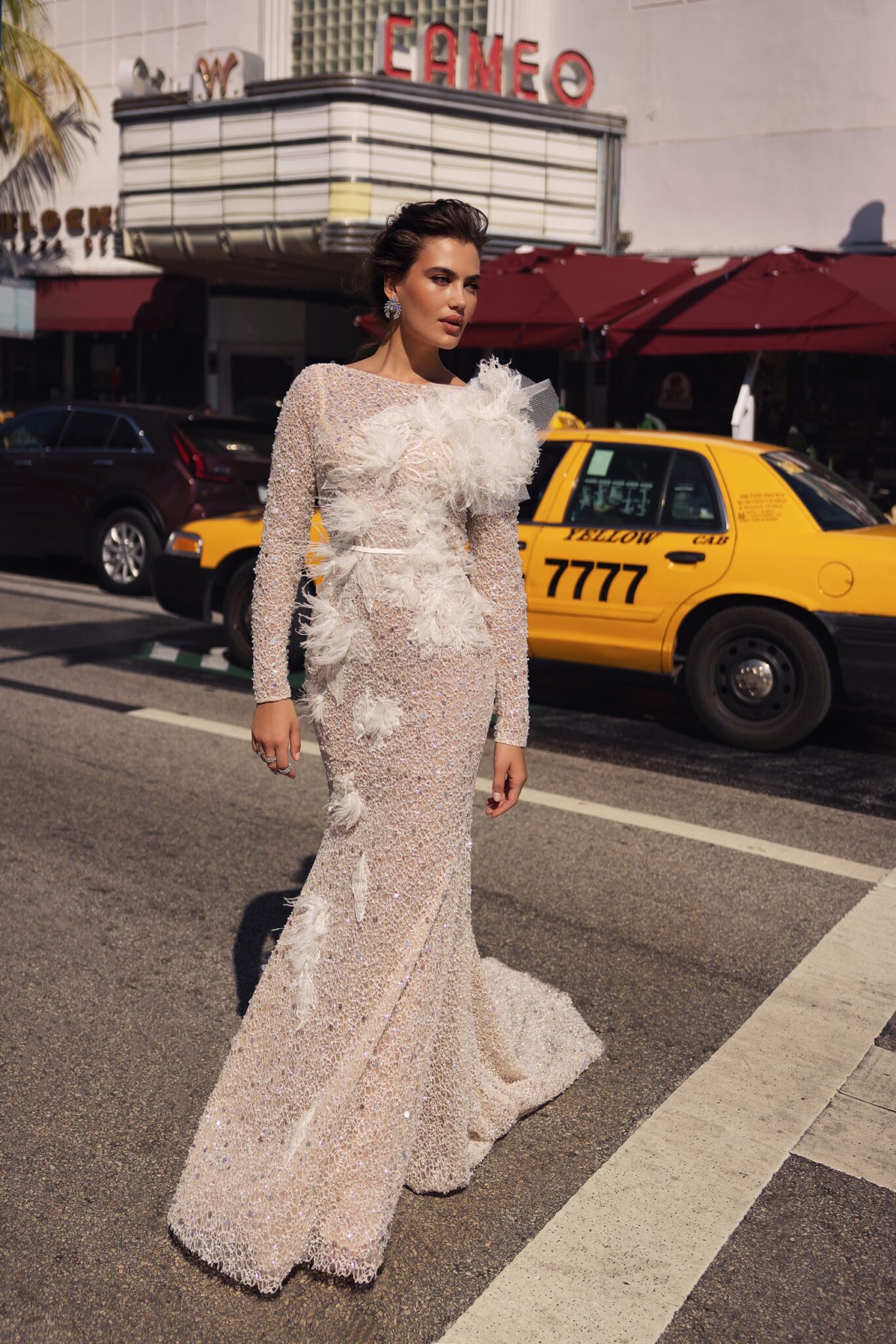 Miami BlissThis stunning piece features intricate details and luxurious fabrics that will leave everyone breathless. Crafted from the finest silk and adorned with delicate sequins and beading, this dress is a work of art. The fitted silhouette hugs your curves in all the right places, creating a flattering and feminine look while the high neckline and long sleeves create an air of sophistication and elegance. But what really sets this dress apart is the stunning feather floral applique that cascades down the skirt. This intricate detail is a true showstopper, adding a touch of romance and femininity to the design. Perfect for the modern bride who wants to make a statement, this dress is sure to turn heads and leave a lasting impression.