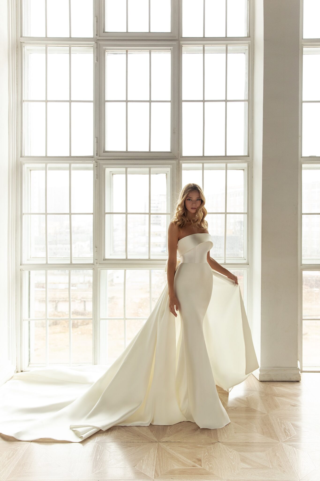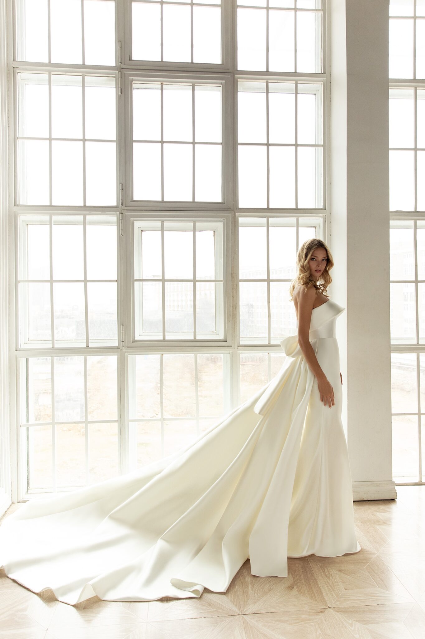 A royal wedding gown with a fabulous train. A sheath dress is made of glossy fabric. The silhouette accentuates the figure of the bride. A strapless bodice is decorated with a falbala that highlights a decollete. Extra-low bodice bares a bride’s back. A fantastic additional skirt is embellished with a big bow and passes into a long train and.