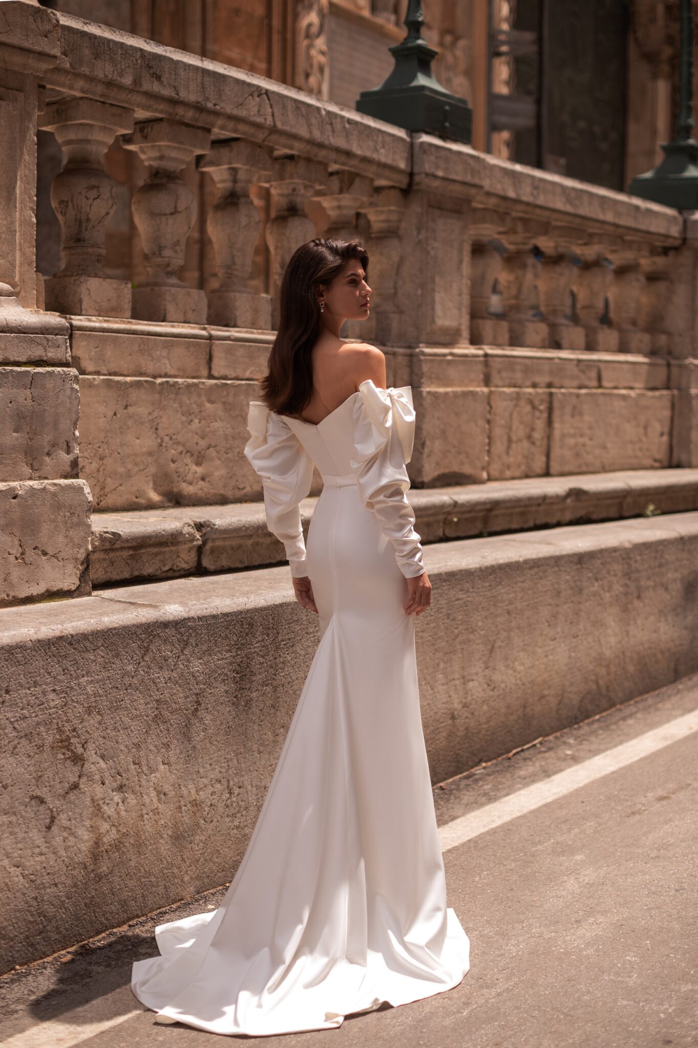 Made 4 LoveFemininely structured mermaid gown featuring soft satin sweetheart neckline corset with draping and voluminous long dpoped sleeves with oversized bows that rest on the shoulders. Clean, creamy asymmetric satin skirt with delicate chapel train embellished with soft folds and thigh-high slit is as striking as it is sexy.