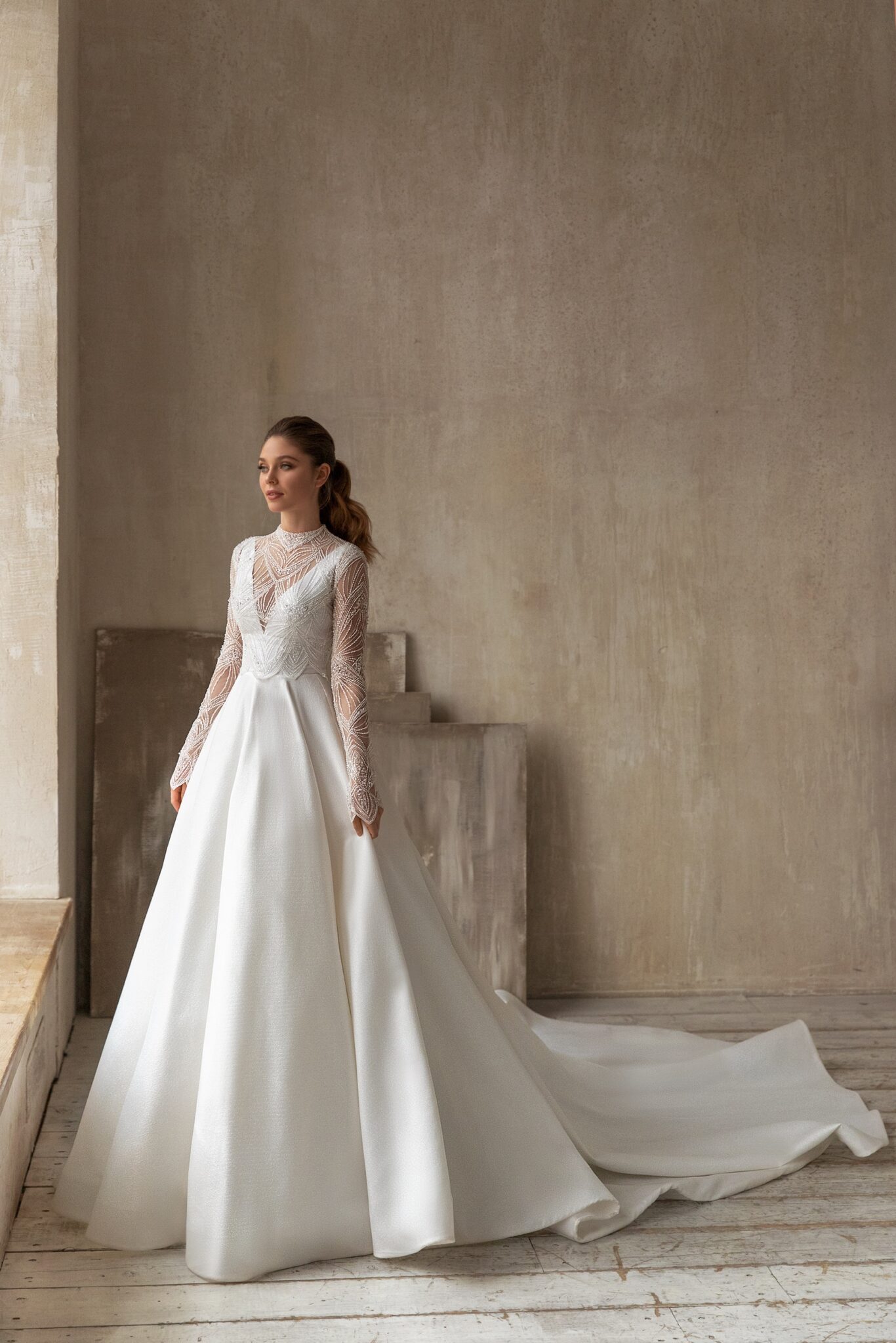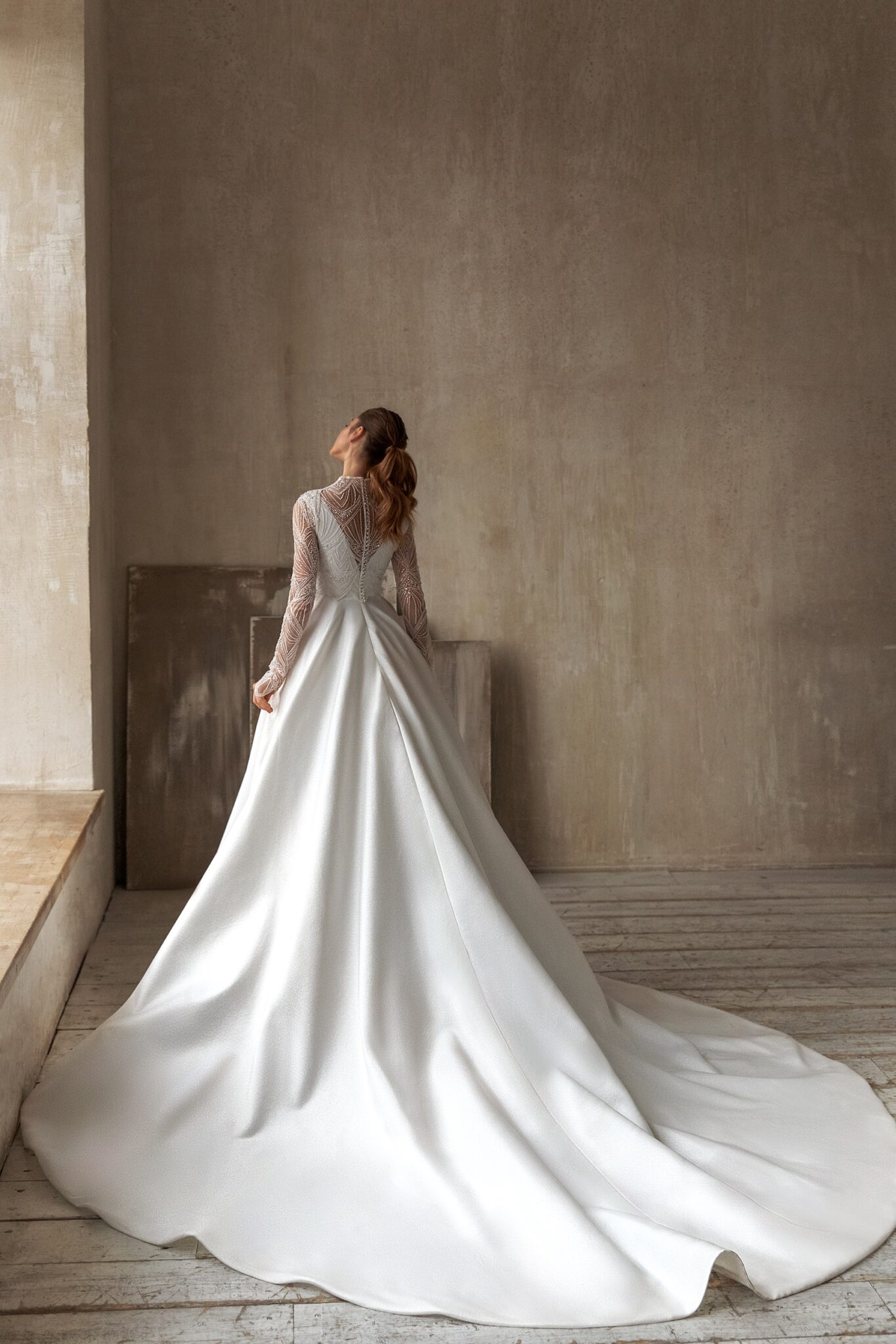 Less is more 2021Classic A-line dress with a magnificent skirt that passes into a fantastic train. The dress on wide straps is made of satin. The upper part is decorated with a V-shaped low neck and a seductive neckline at the back of the wedding gown. A loose skirt looks fantastic. The total look can be embellished with a bolero that is made of shining crystals and beads that conduct a geometrical pattern.