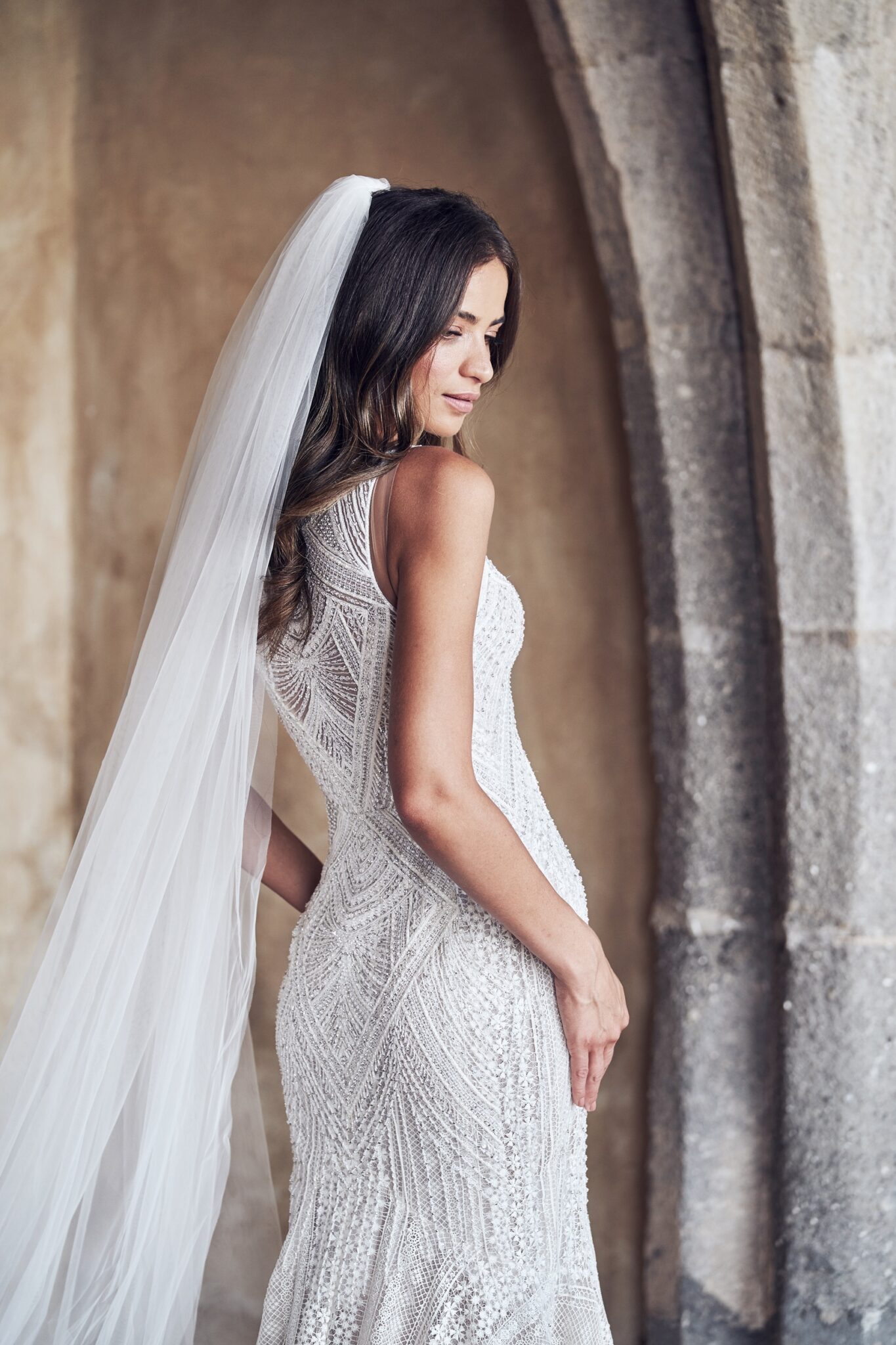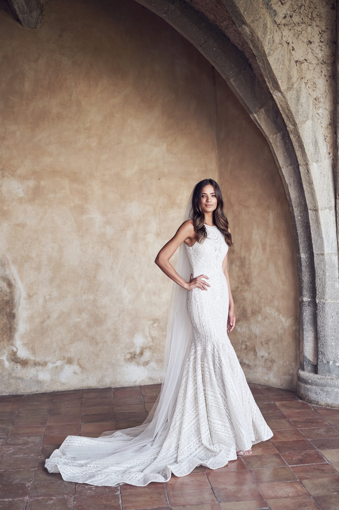Love storiesAmber bridal gown is characterized by geometrical patterns made of lace and beads. Tight skirt runs into a loose tail. The round neck hole makes this look elegant.