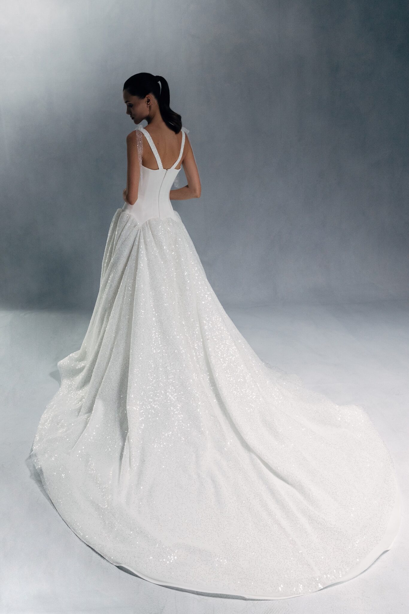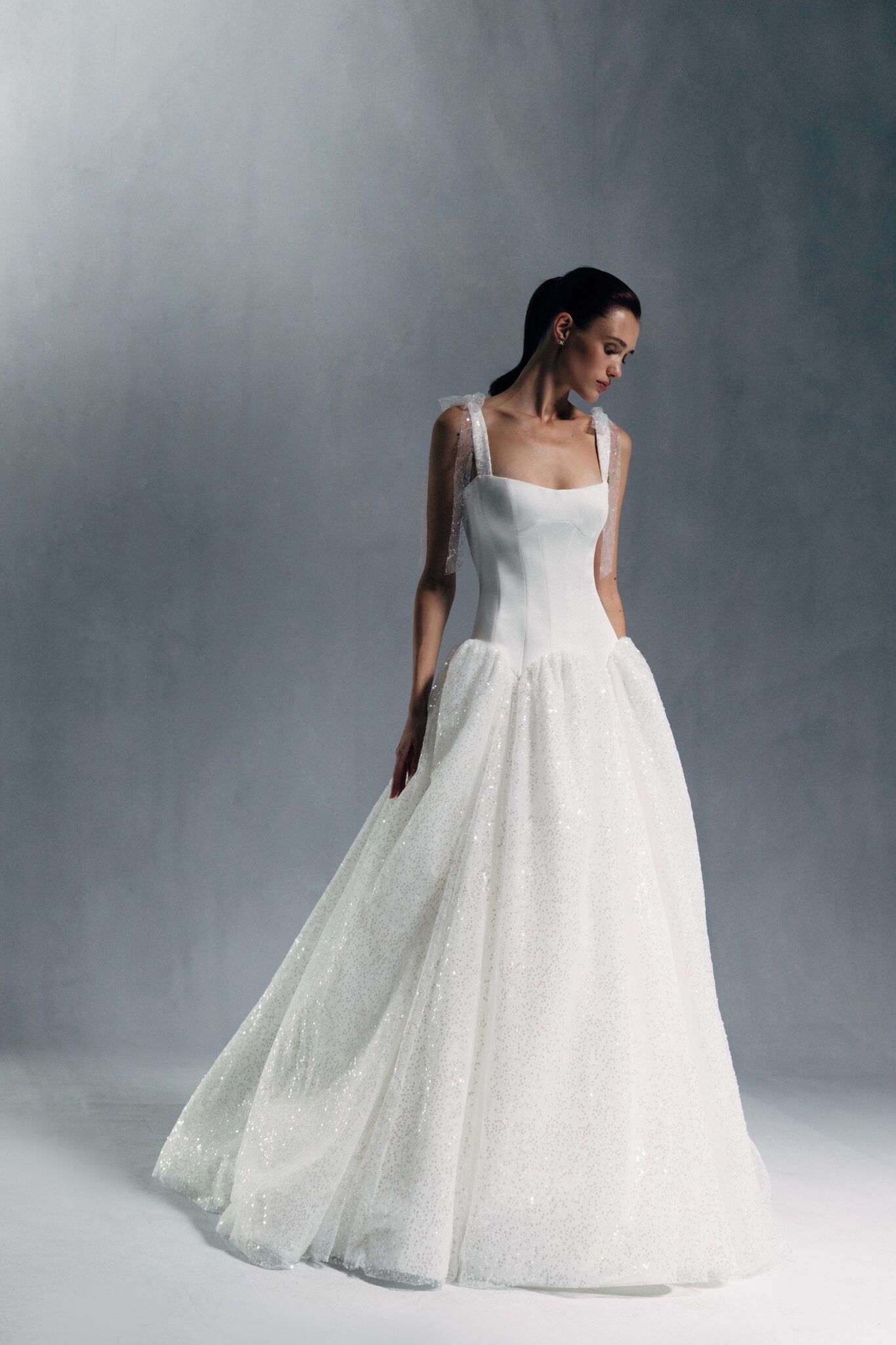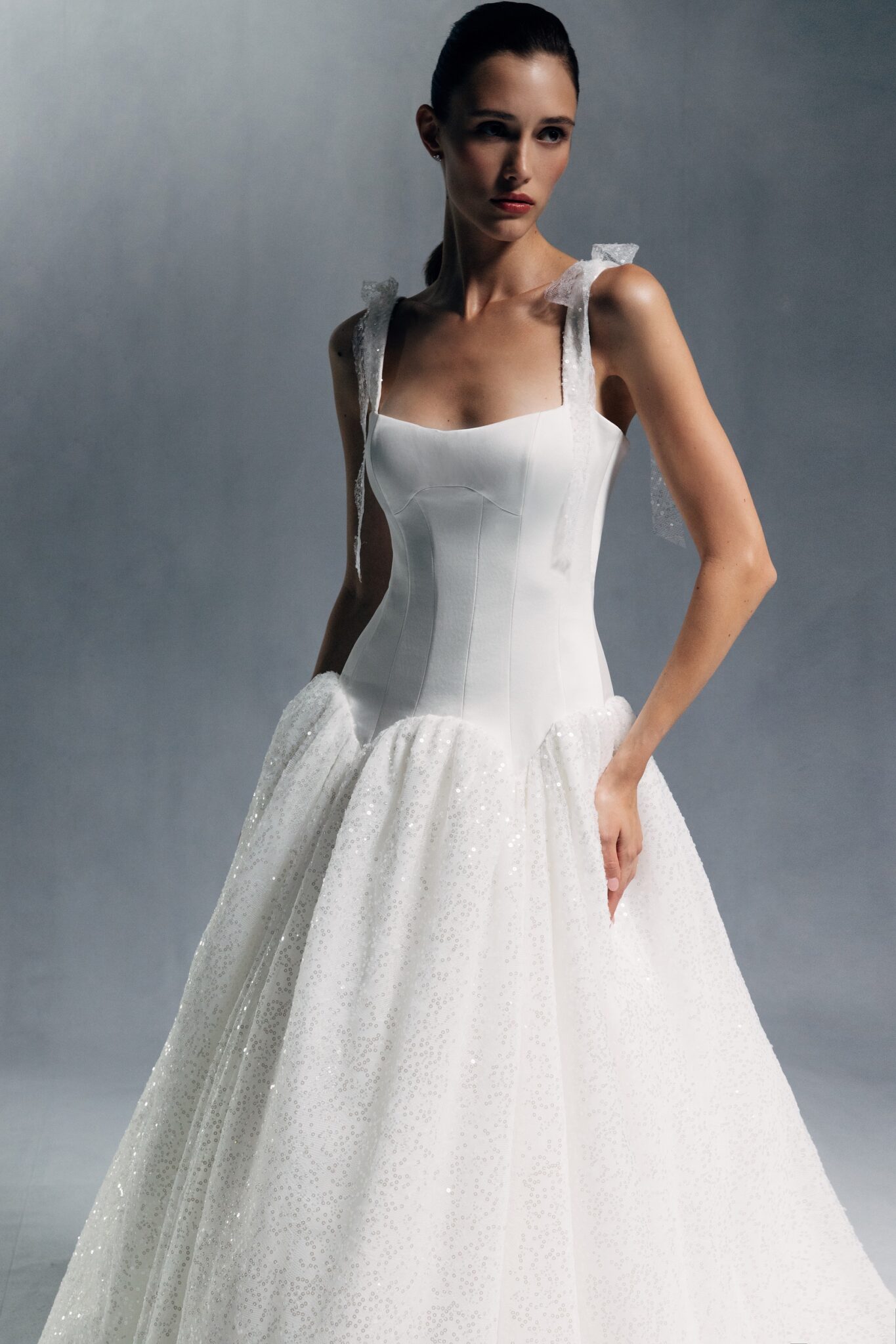 Special EditionA sophisticated corset gown with a straight neckline and wide straps, adorned with beaded mesh bows. The waist is emphasized with a symmetrical basque, leading into a fully beaded, voluminous skirt.