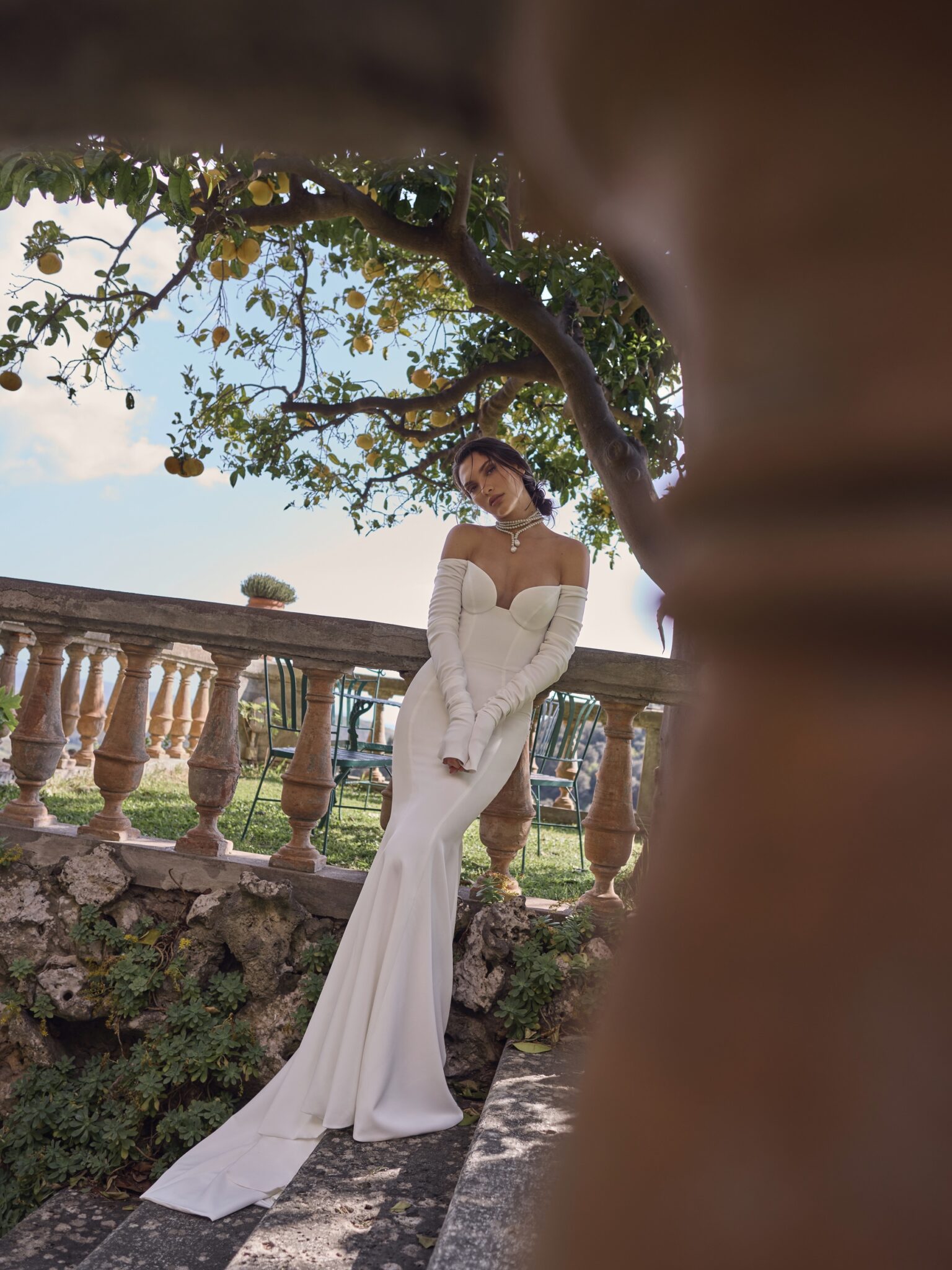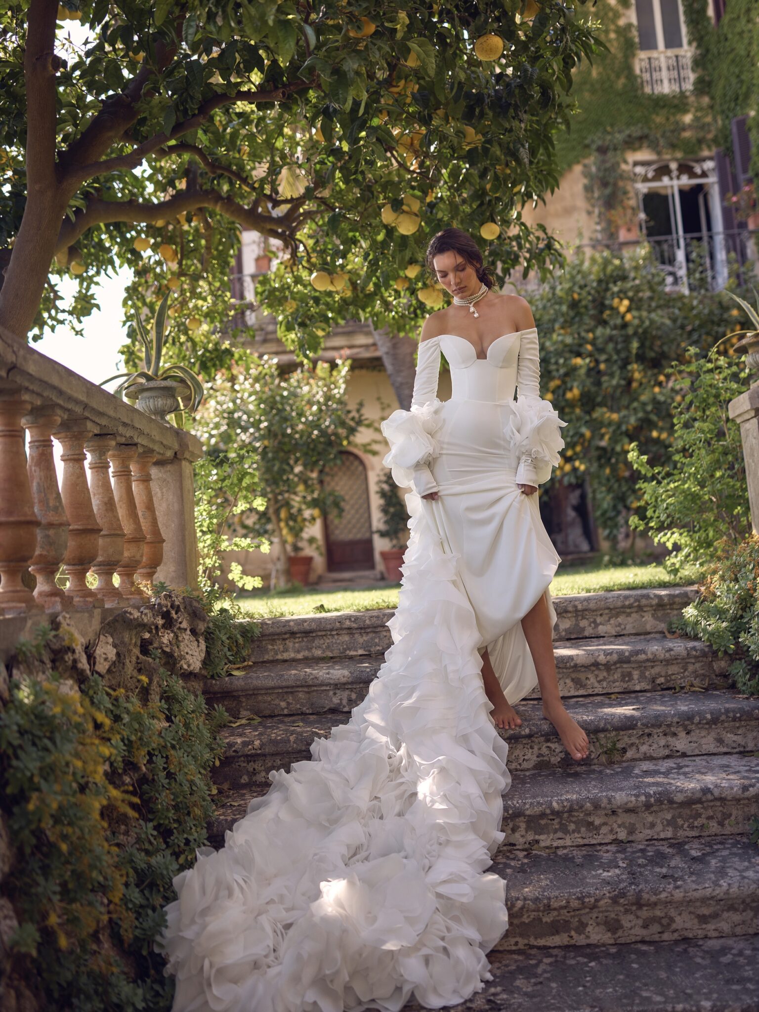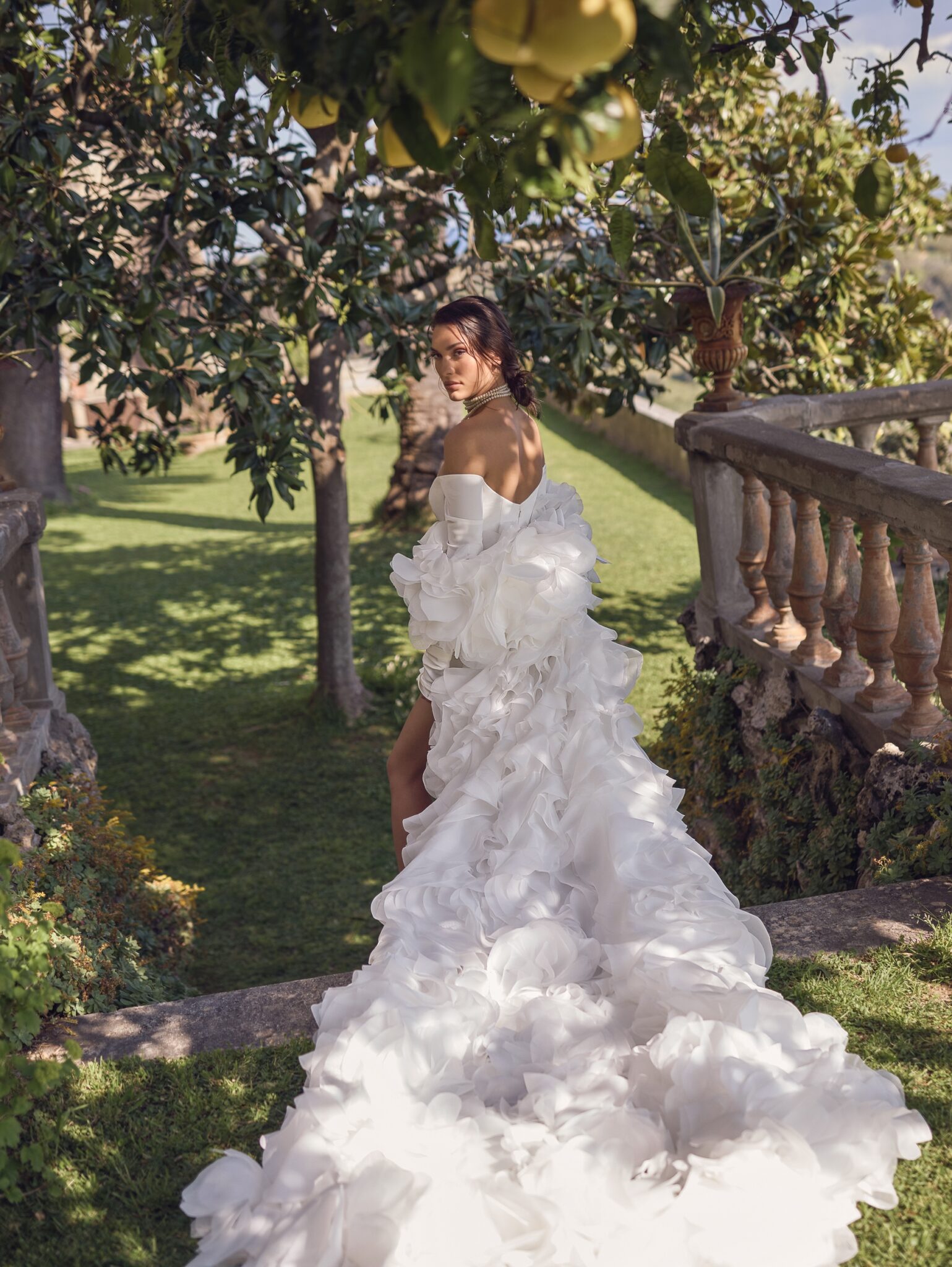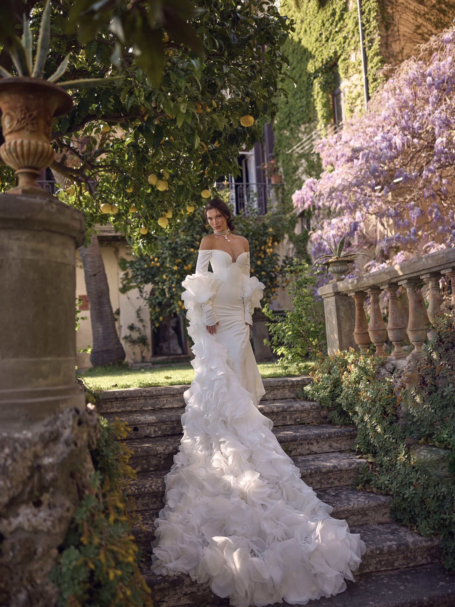Amore in FioreArcadia Dress is captivating blend of minimalism and romance, this dress crafted from structured suiting fabric that beautifully sculpts the silhouette. The off-shoulder design with a heart-shaped neckline exudes modern sophistication, while the detachable organza cape adorned with voluminous, hand-crafted flowers adds a dramatic flair. Each floral detail is meticulously made by hand, making this gown a true couture masterpiece. A perfect choice for brides who want to embrace both sleek elegance and ethereal beauty.
