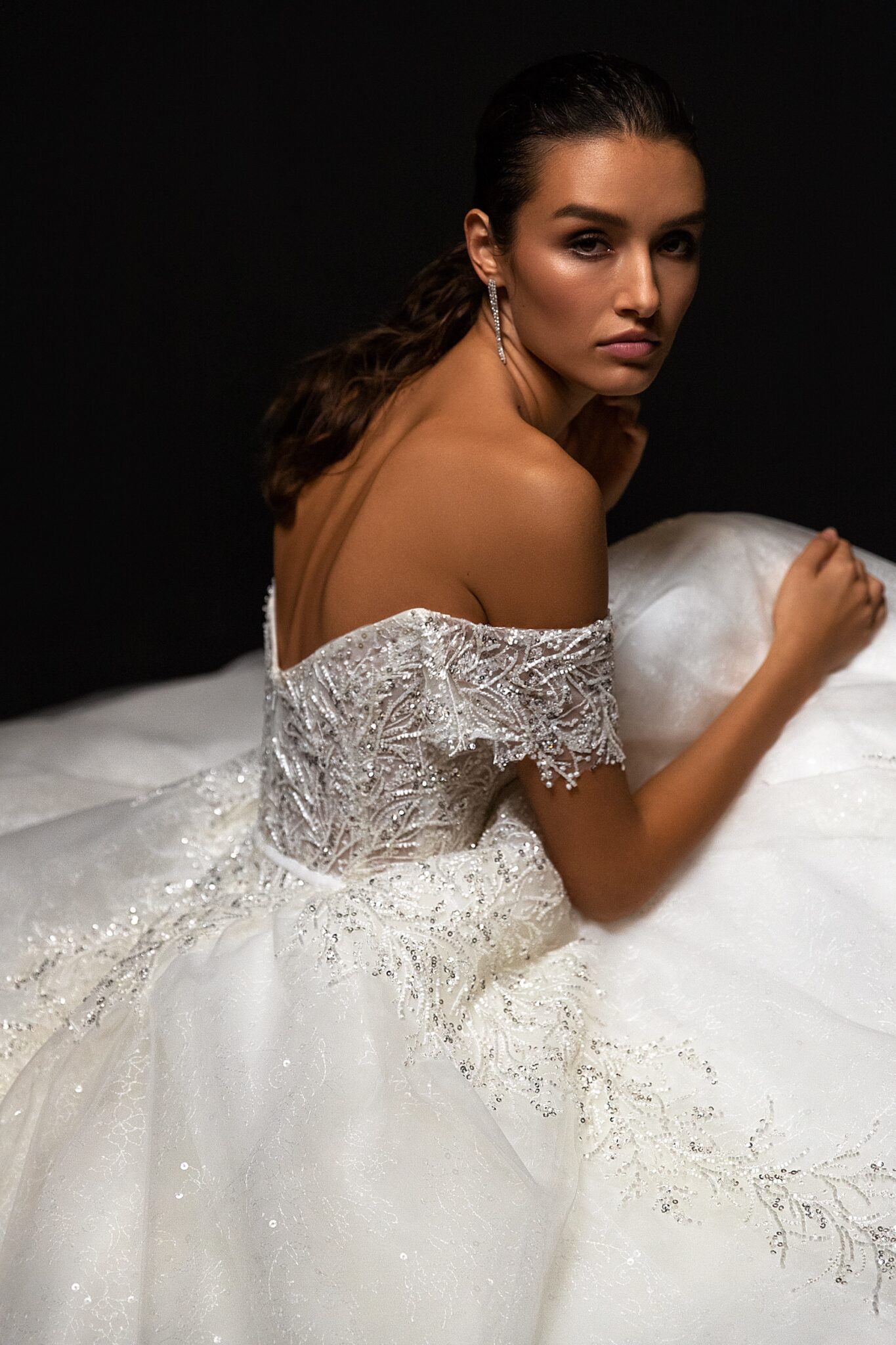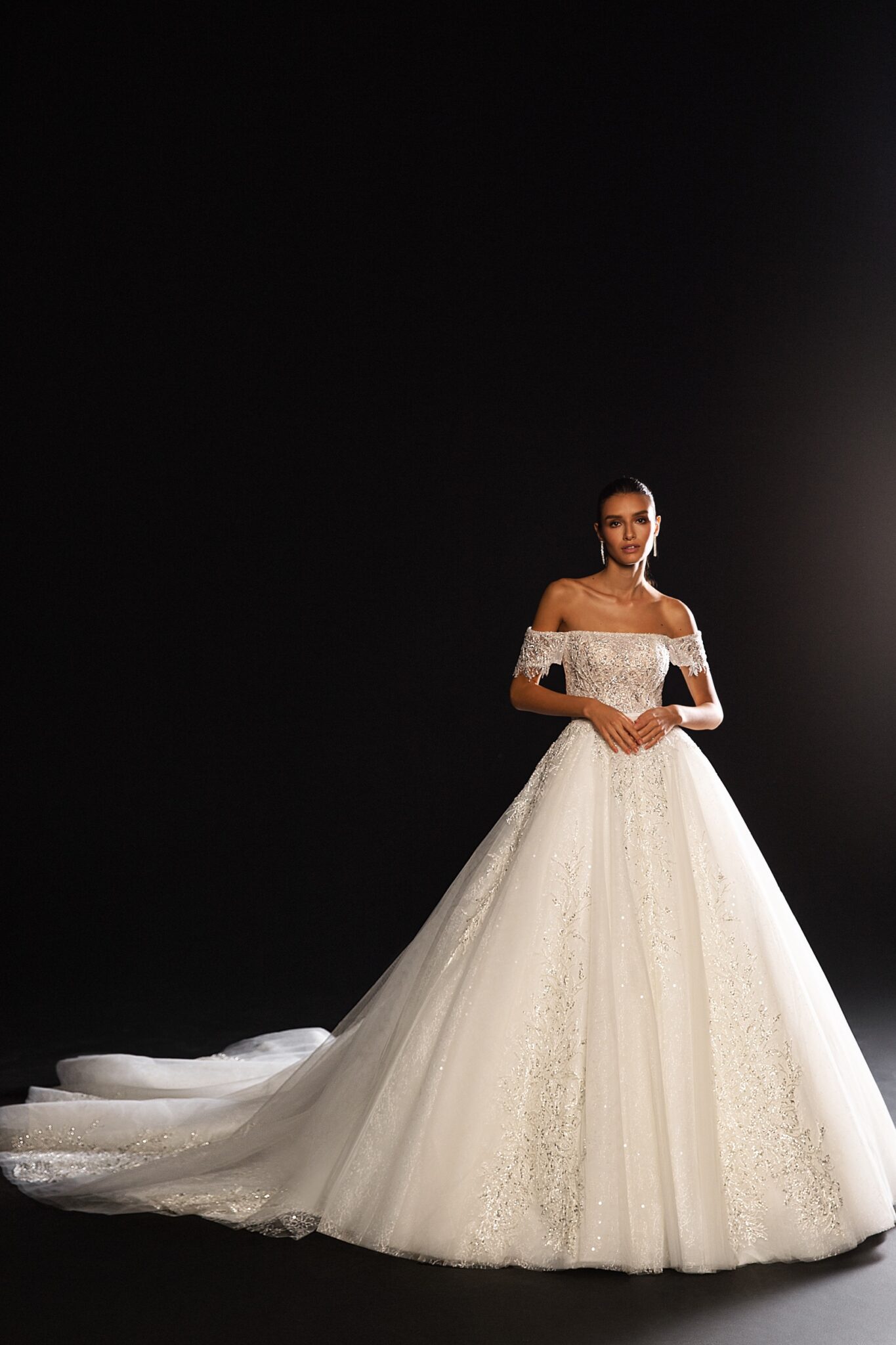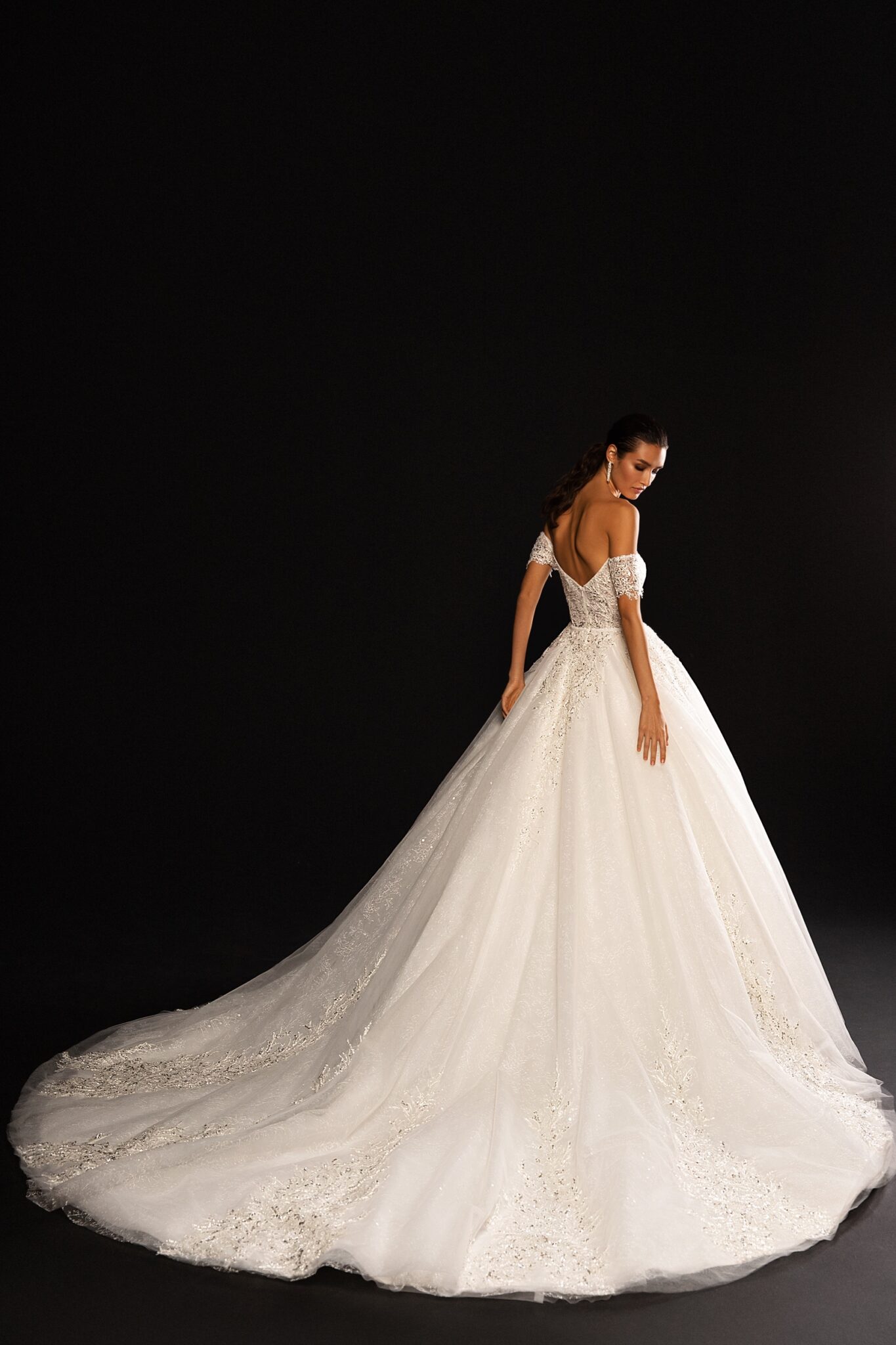 StardustThe ball wedding gown looks truly magnificent. Loose dress with a Straight across neckline is decorated with unique lace. Accurate sleeves adds romanticity to a gown. A fantastic skirt that passes into a gorgeous train.