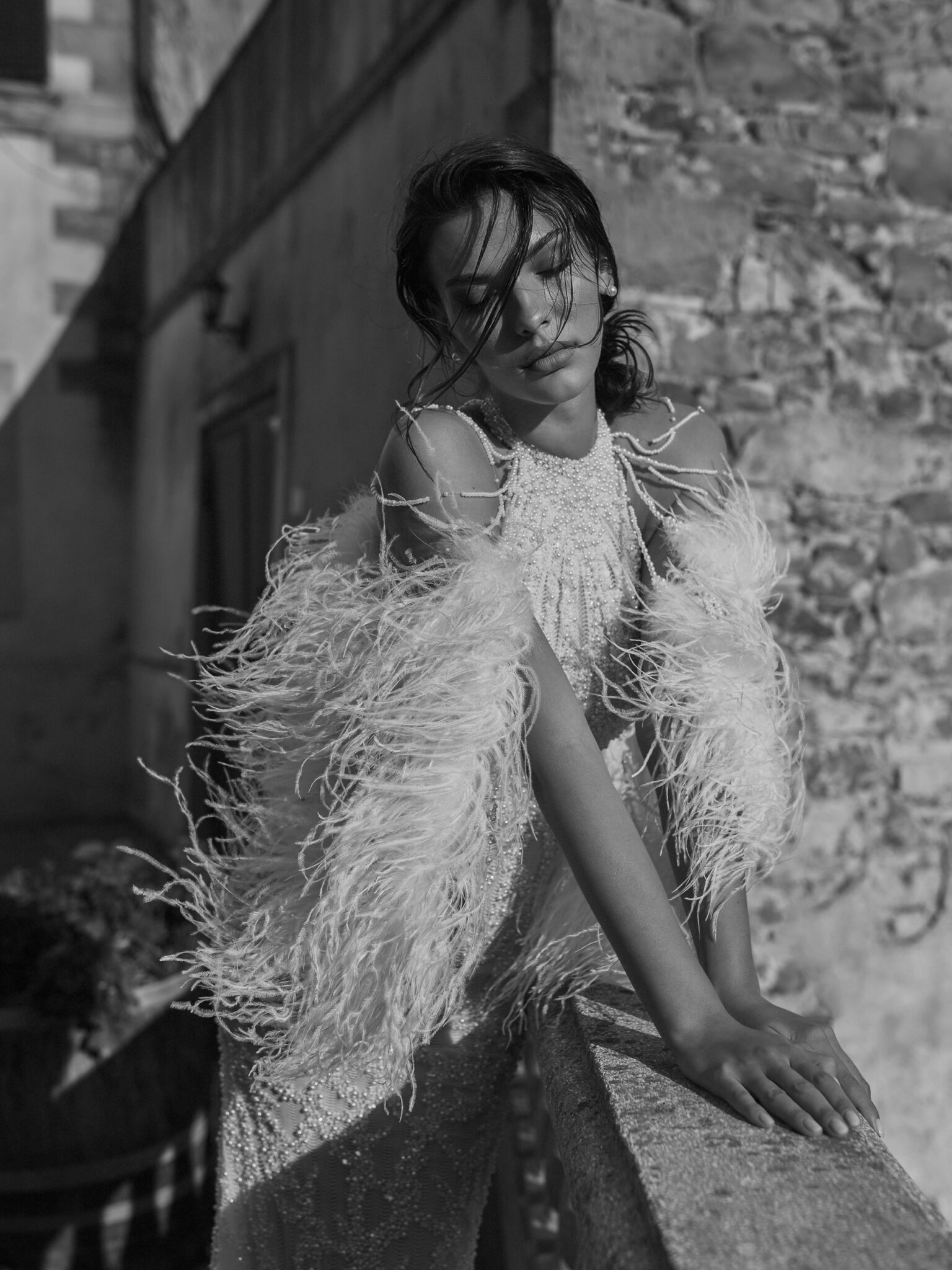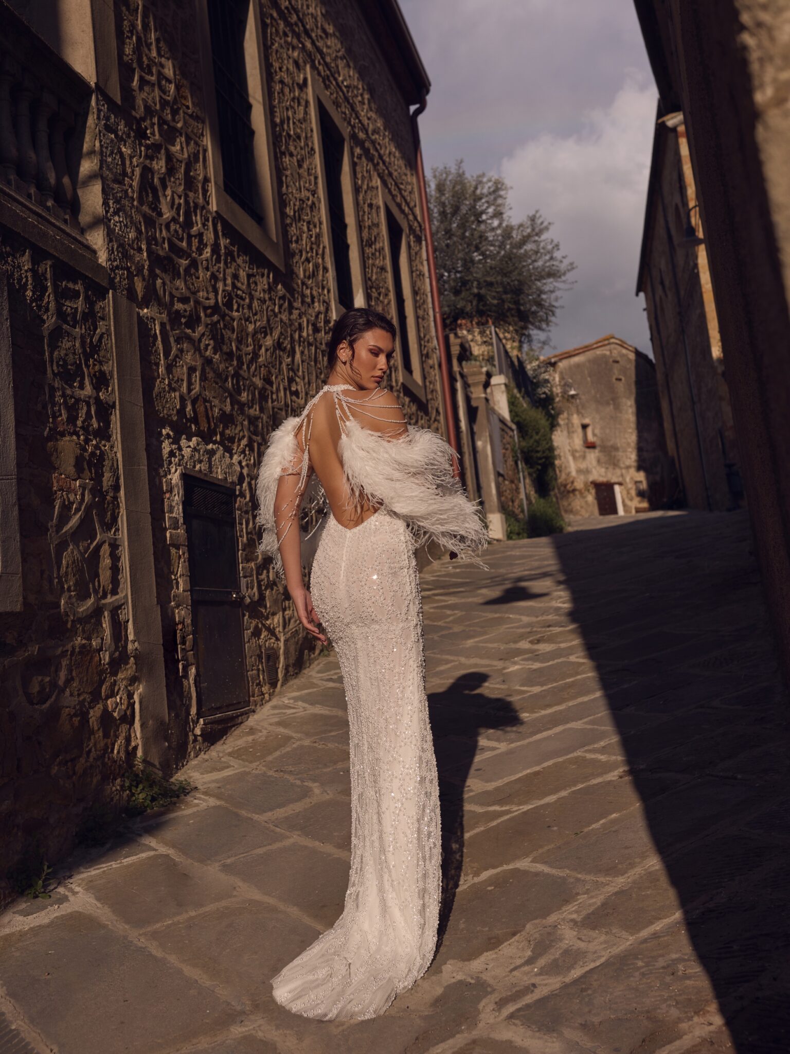 Crafted from shimmering lace, this sophisticated dress features a halter neckline and a fitted shape that accentuates the figure. The bodice is intricately adorned with pearls and crystals, creating a luxurious textured sparkle. A dramatic feathered cape cascades over the shoulders, adding couture flair and vintage elegance. The cape is fully detachable and attaches seamlessly, allowing for an effortless transformation of the look. The gown also includes multiple layers of lining to ensure full coverage while maintaining a lightweight feel. With a fully open back Argos is perfect for the bold bride who wants to shine with timeless sophistication.
