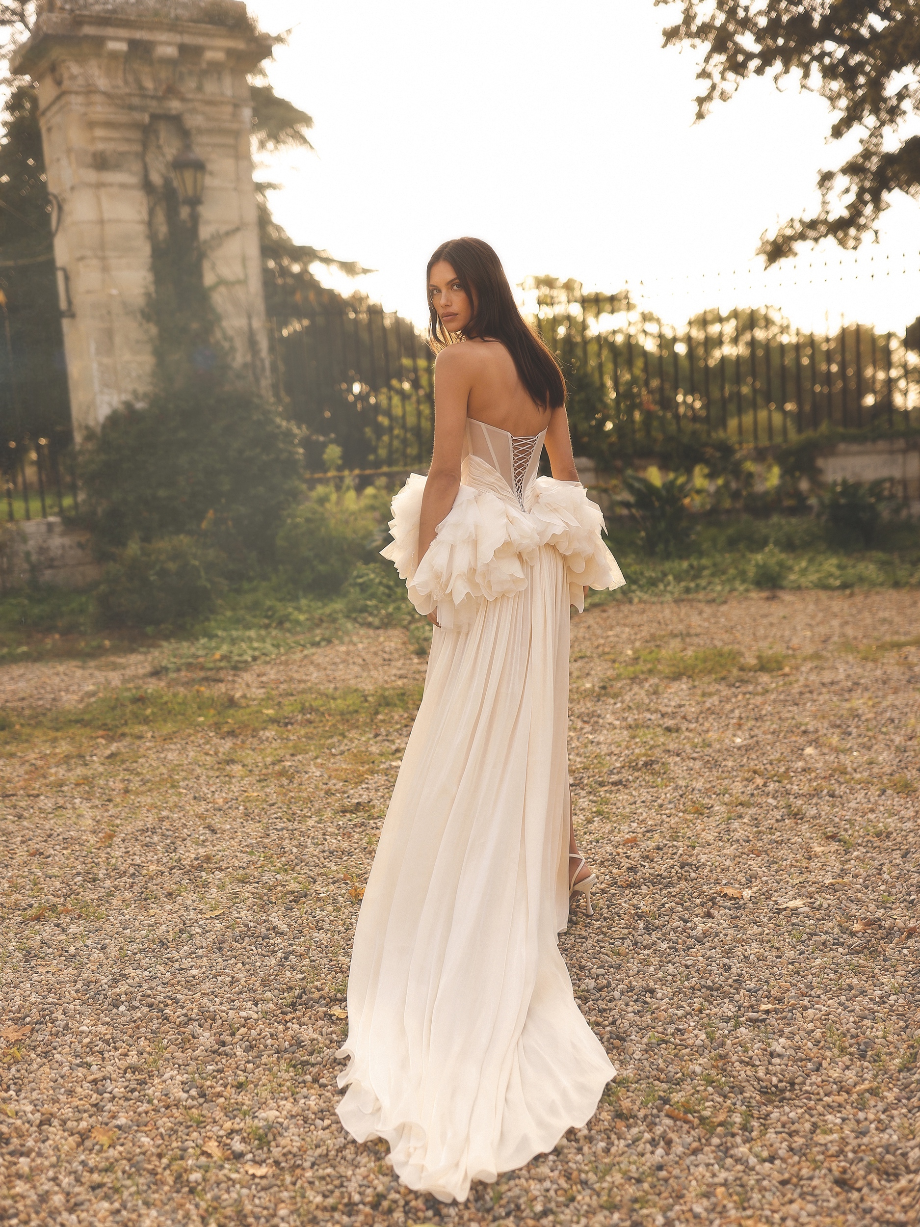Atelier La Femme EditionArmin gown is a bold, ultra-modern interpretation of the bridal look, designed for brides who embrace movement, lightness, and artistic detail. Crafted from airy chiffon organza, the dress flows beautifully with every step, while the mini underskirt made of soft knit fabric provides comfort and subtle coverage. The corset features elegant draping, and the waistline is framed by dramatic, sculptural ruffles in varying shapes and shades – a true couture-inspired accent that brings depth and dimension to the silhouette. The back laces up for a customizable fit, and a small train adds a touch of softness and refinement to the otherwise fashion-forward design.