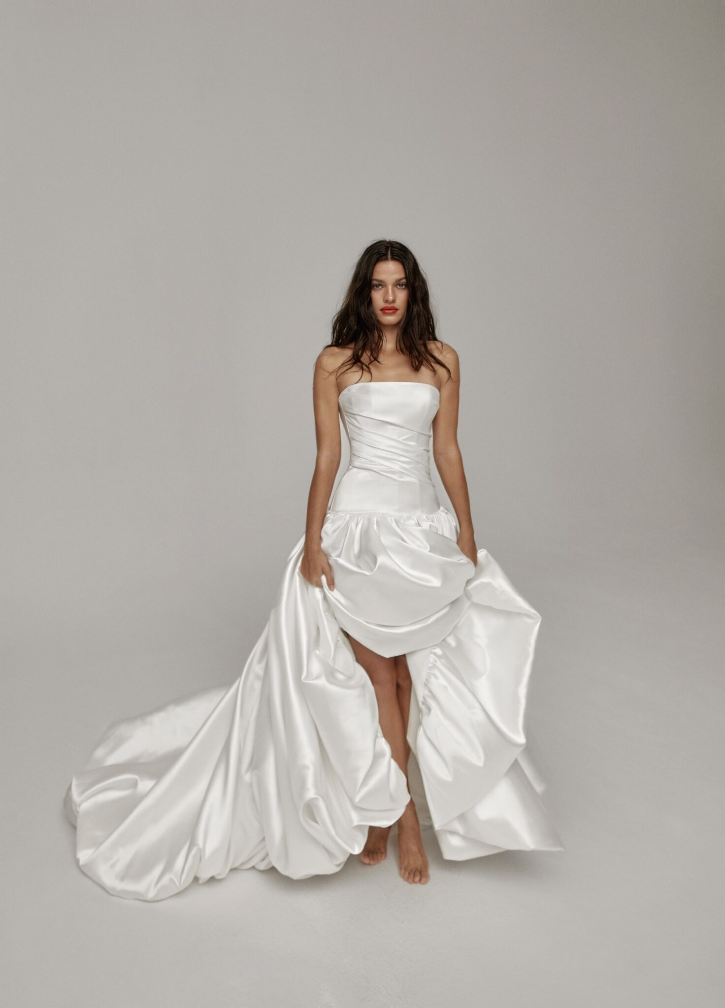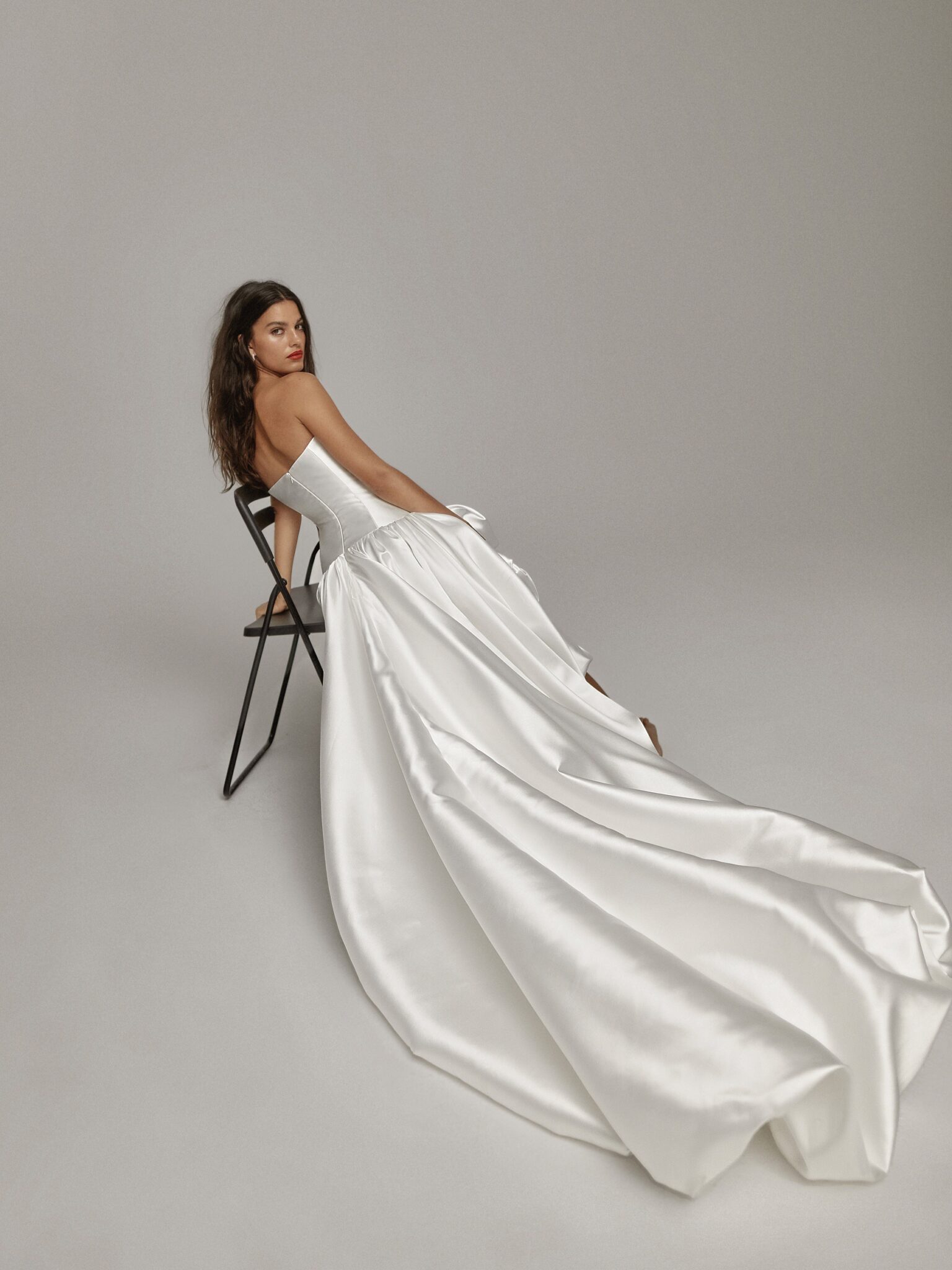 The voluminous asymmetric skirt adds a touch of drama and movement, featuring artfully folded edges turned inward for a refined, couture-inspired finish. A perfect balance of structure and grace — ideal for the modern bride who appreciates timeless design with a contemporary twist.