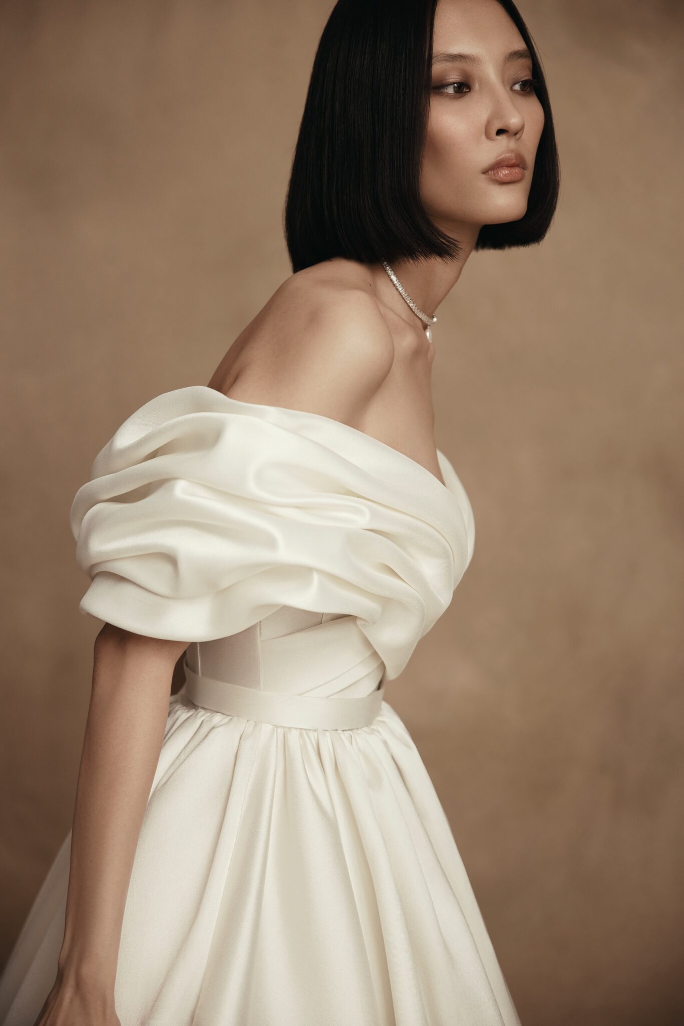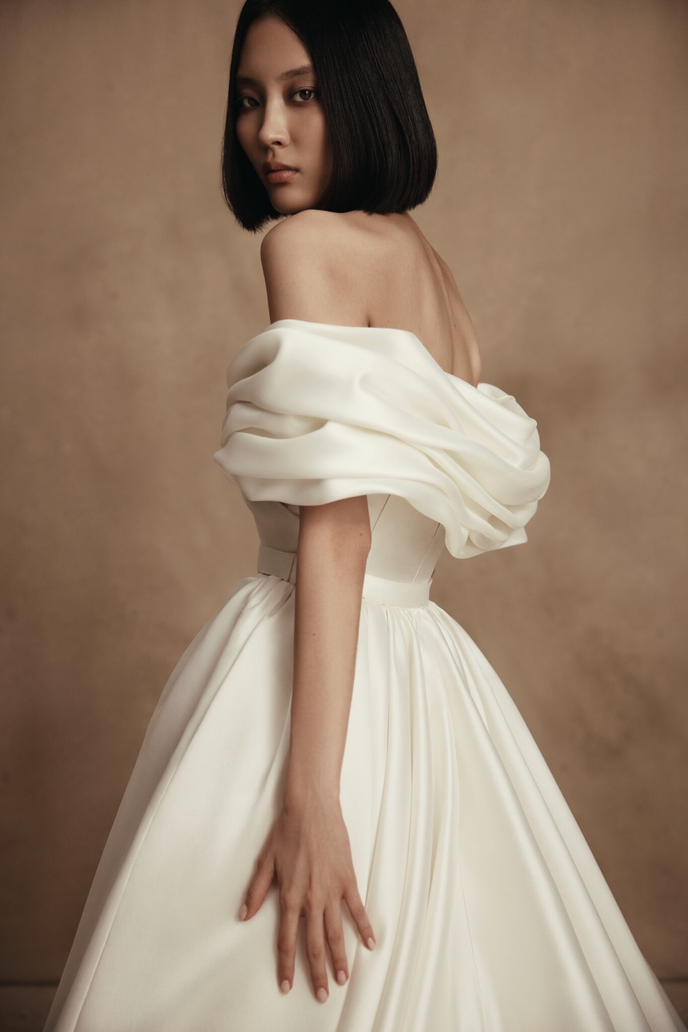 Personality, Plus Size, Sample SaleThis statement satin ballgown is adorned with a gorgeous off-the-shoulder wrap neckline that proceeds to the back with soft folds. A super-fitted chic corset top proceeds to the voluminous full satin skirt completed with a pointed-tail train.