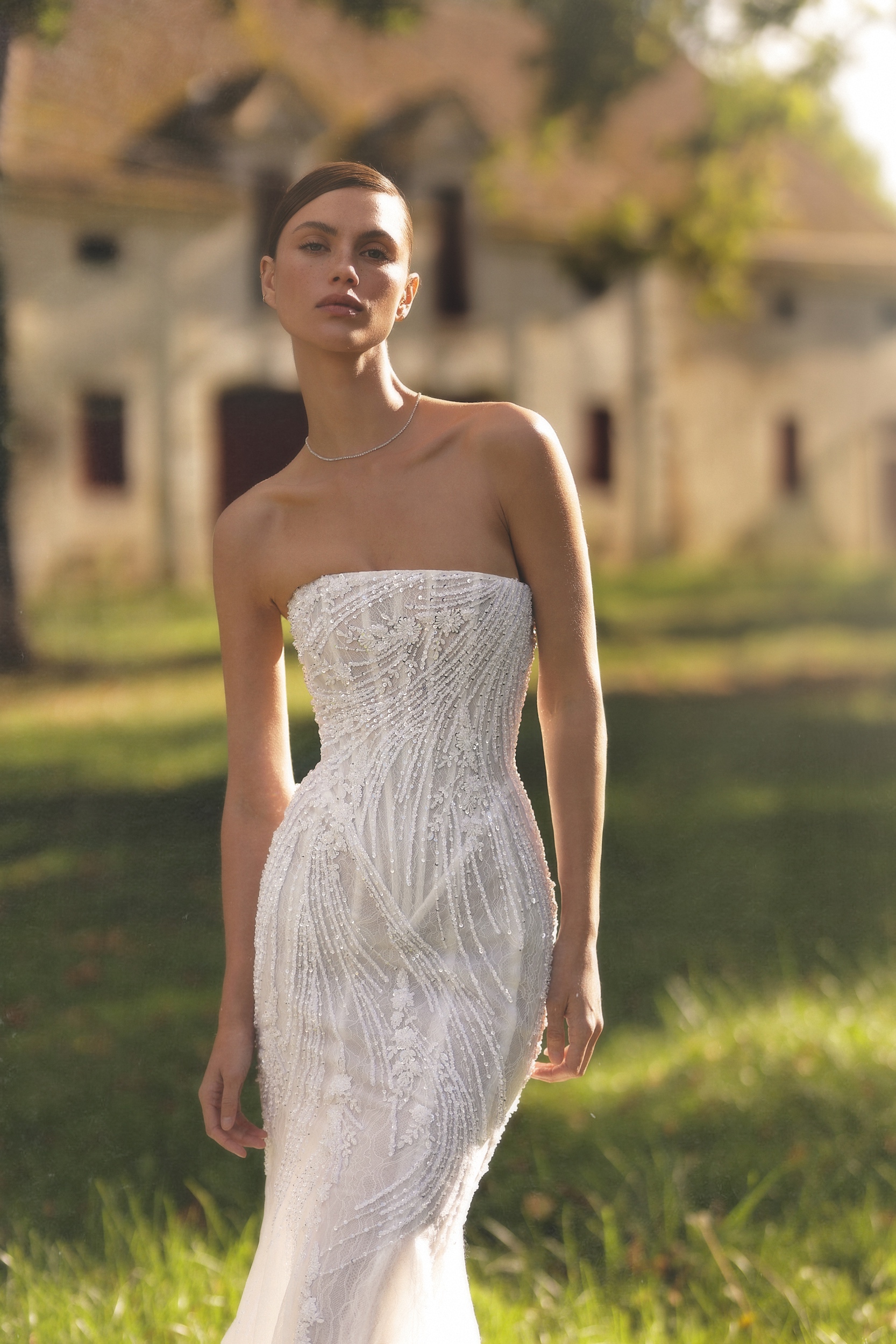 Perfect for brides seeking a sophisticated style with a hint of high-fashion elegance.