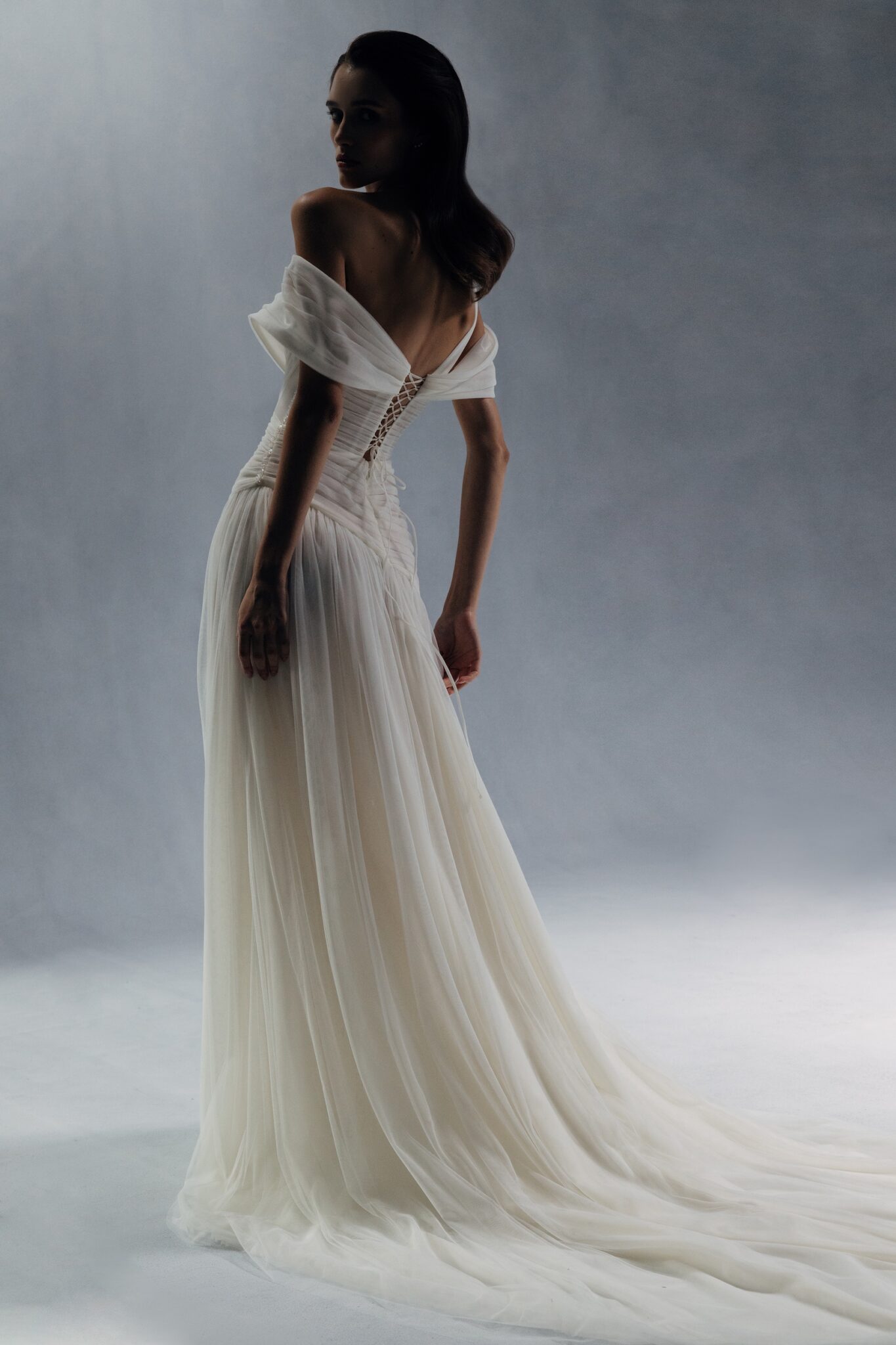 Special Edition, Plus SizeA lightweight and refined dress with a cold-shoulder neckline and an asymmetric tulle strap on one side. The structured corset bodice flows into a diagonally draped skirt that descends into an airy, slit hem.