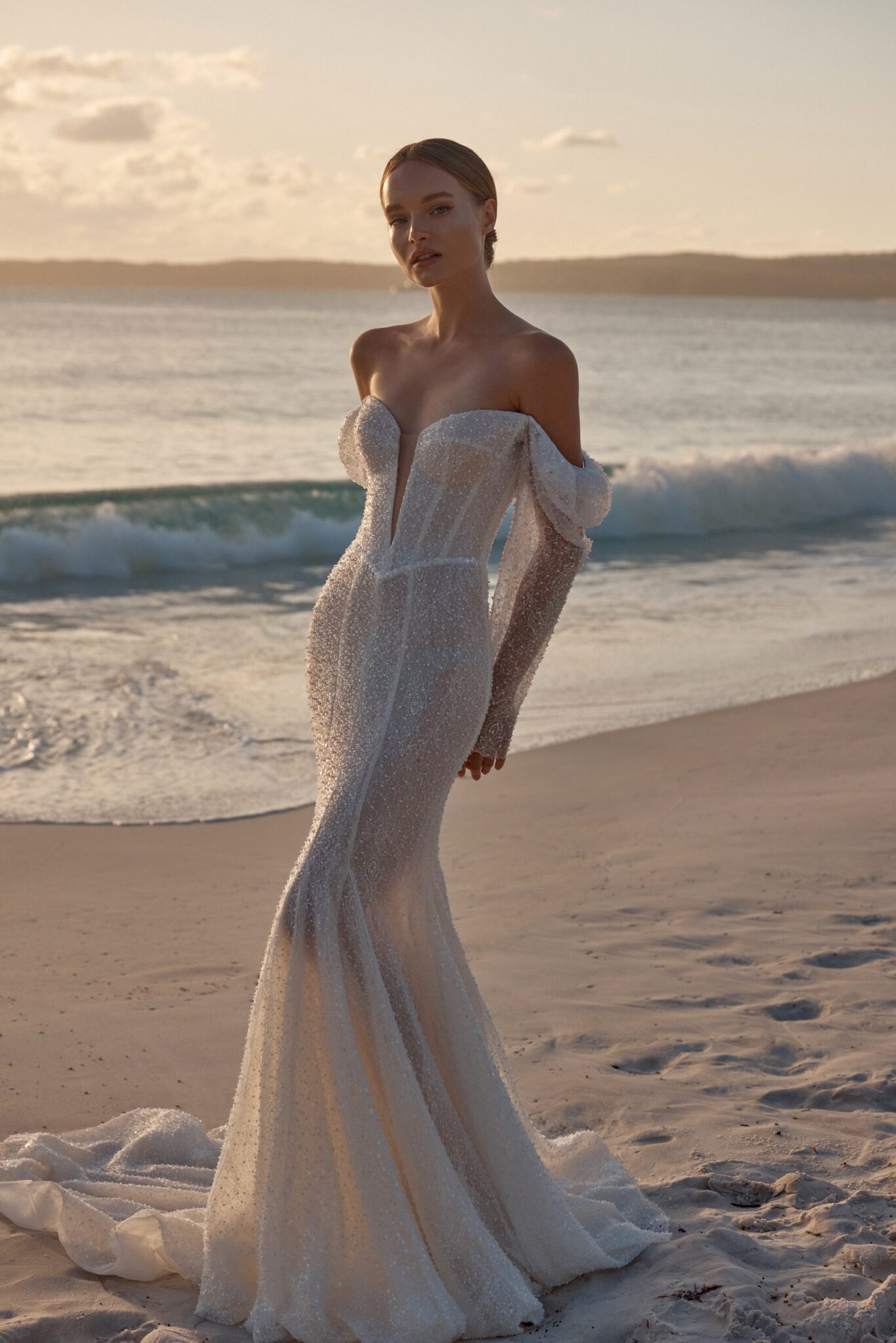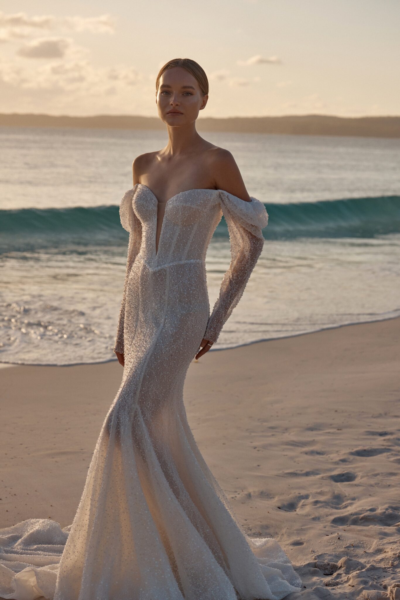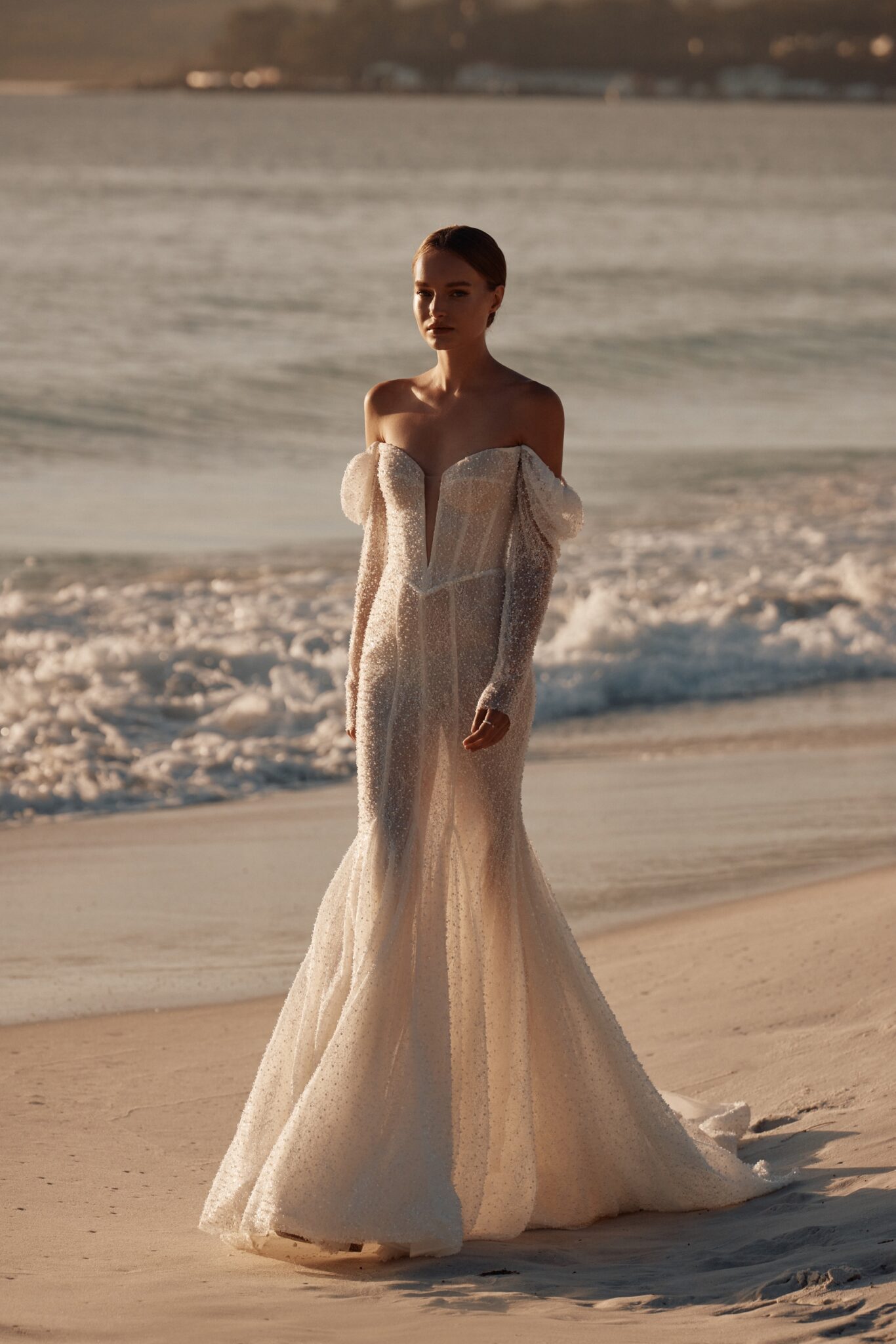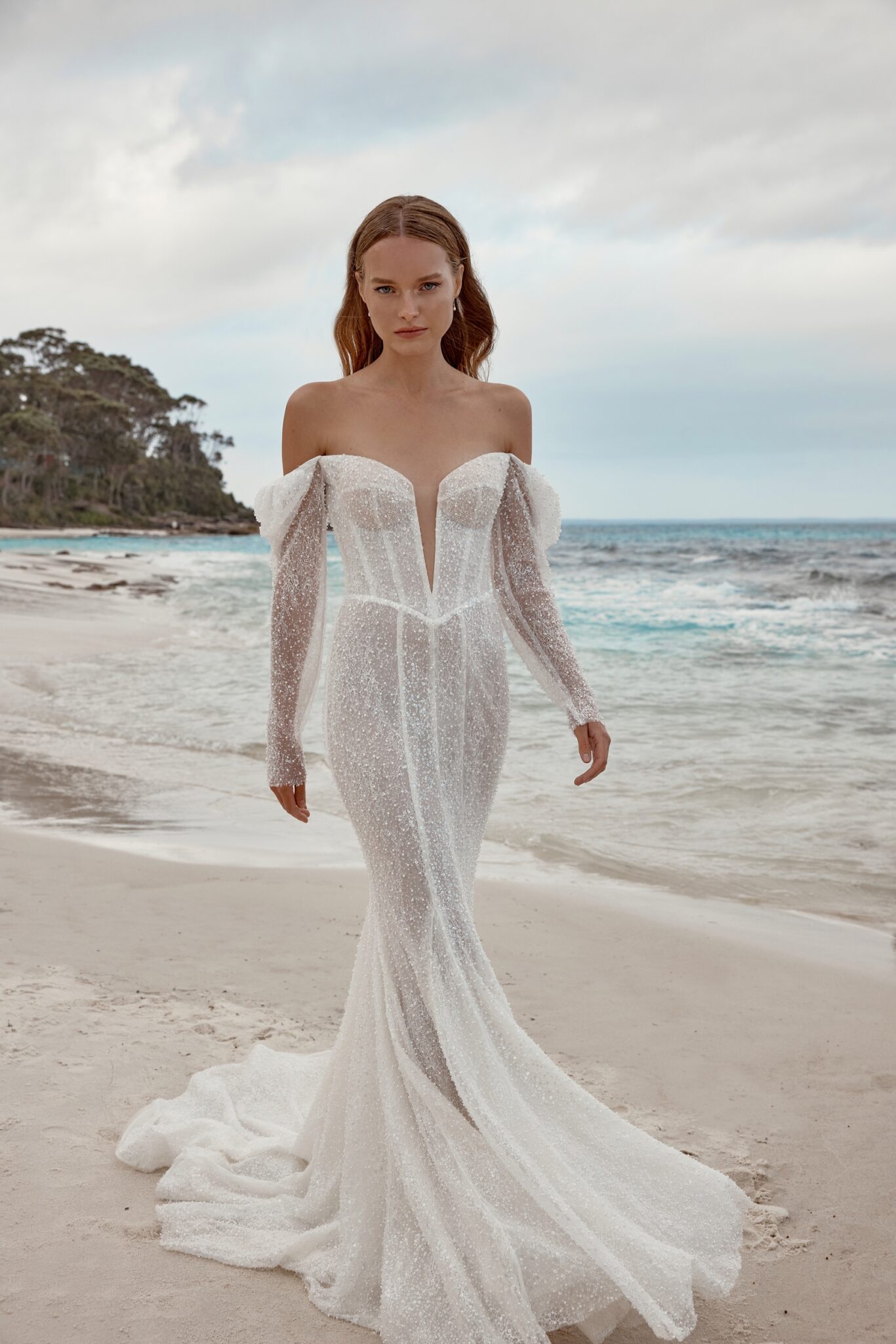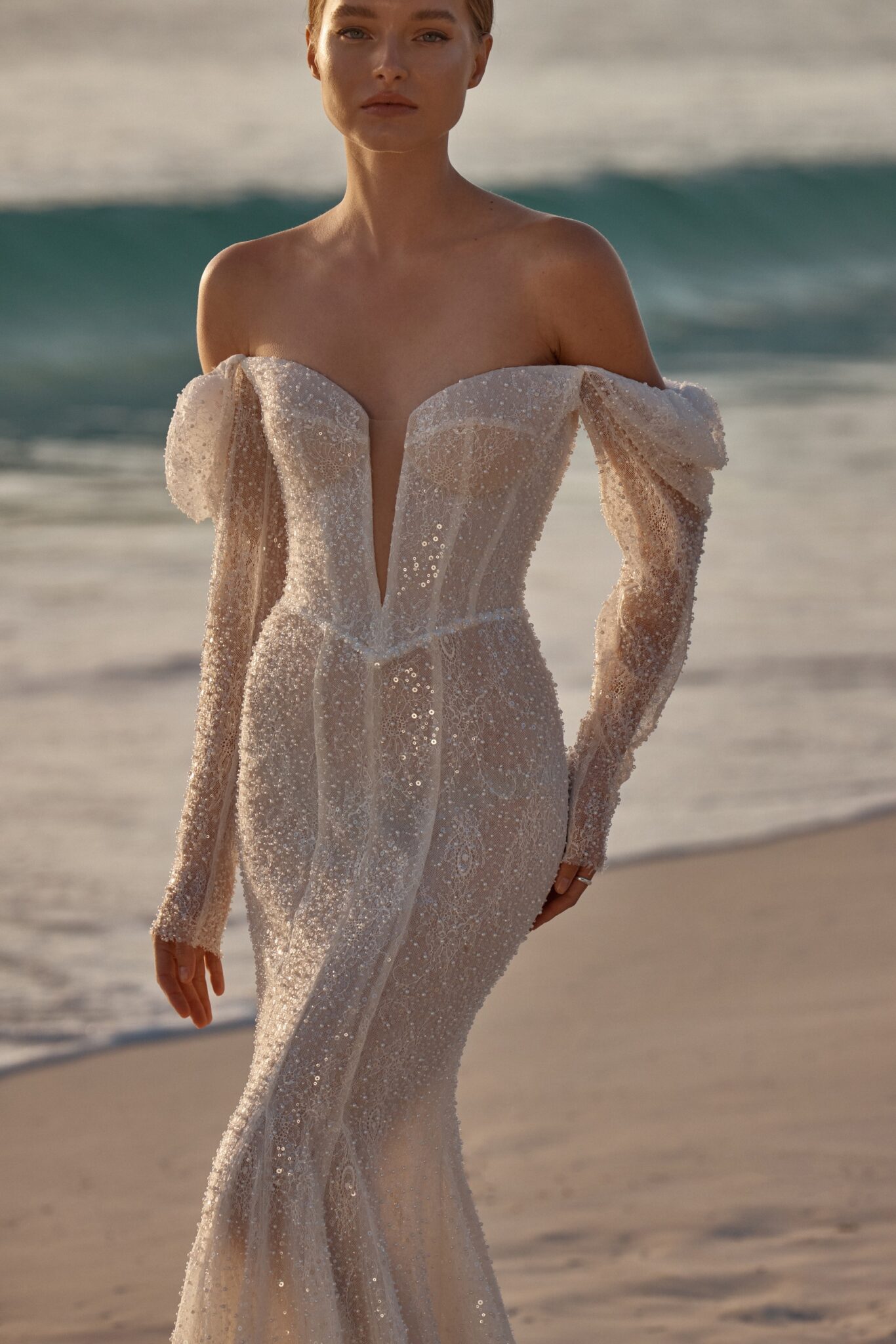 This mesmerizing wedding gown is a true embodiment of grace and glamour. Crafted from exquisite beaded mesh, it boasts a daring deep V-neckline, complemented by elegantly flowing off-the-shoulder sleeves.