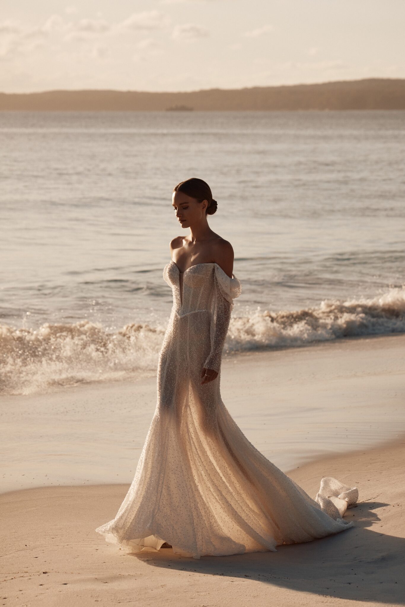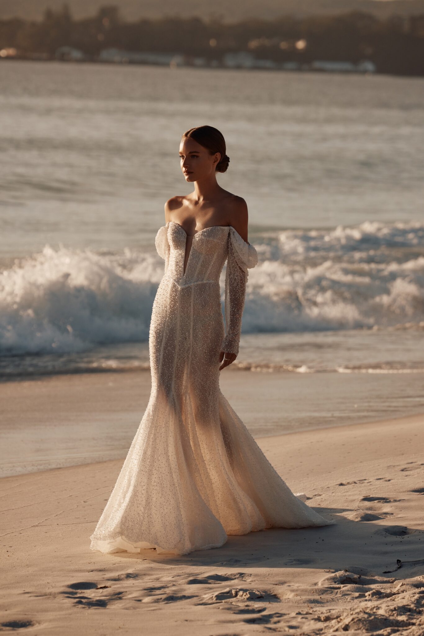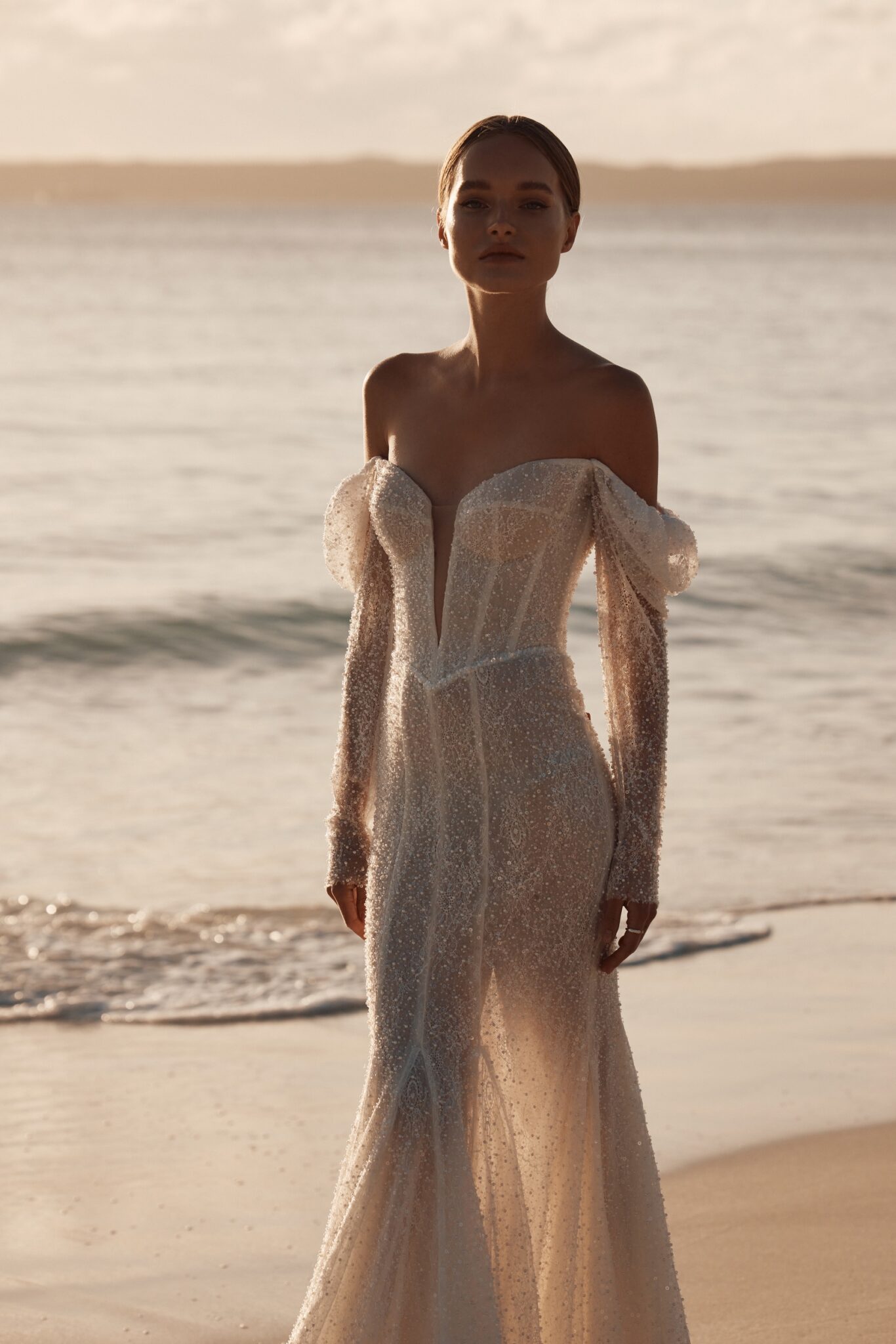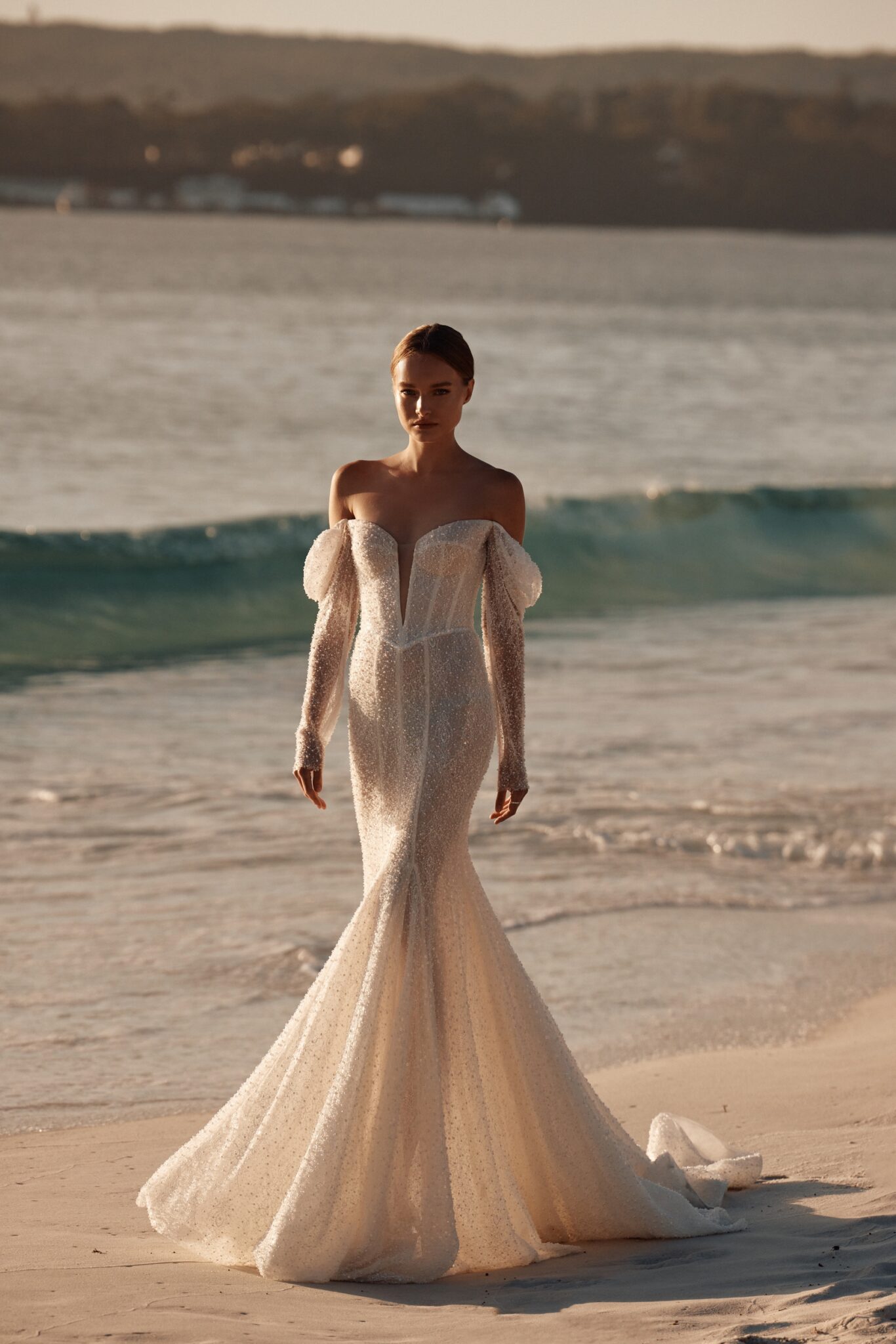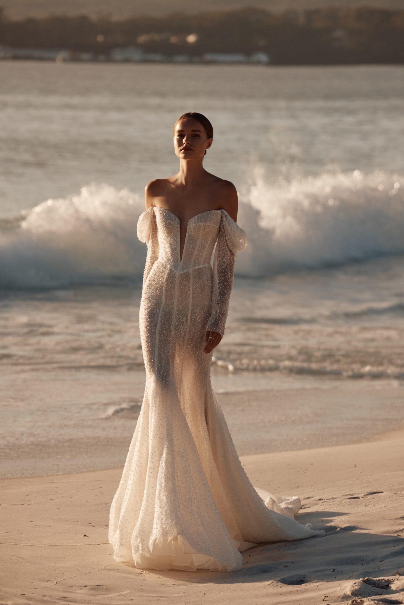 This mesmerizing wedding gown is a true embodiment of grace and glamour. Crafted from exquisite beaded mesh, it boasts a daring deep V-neckline, complemented by elegantly flowing off-the-shoulder sleeves.