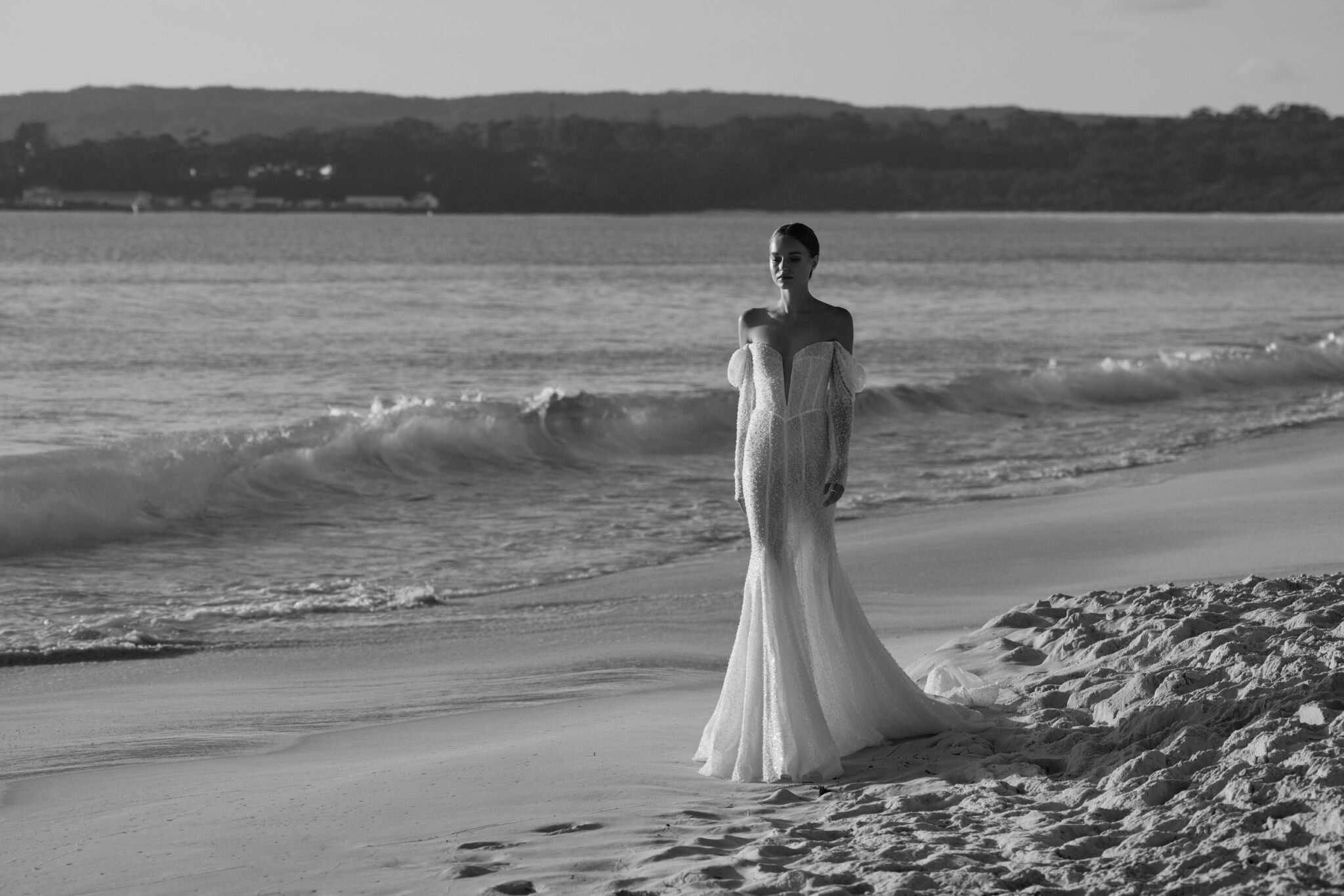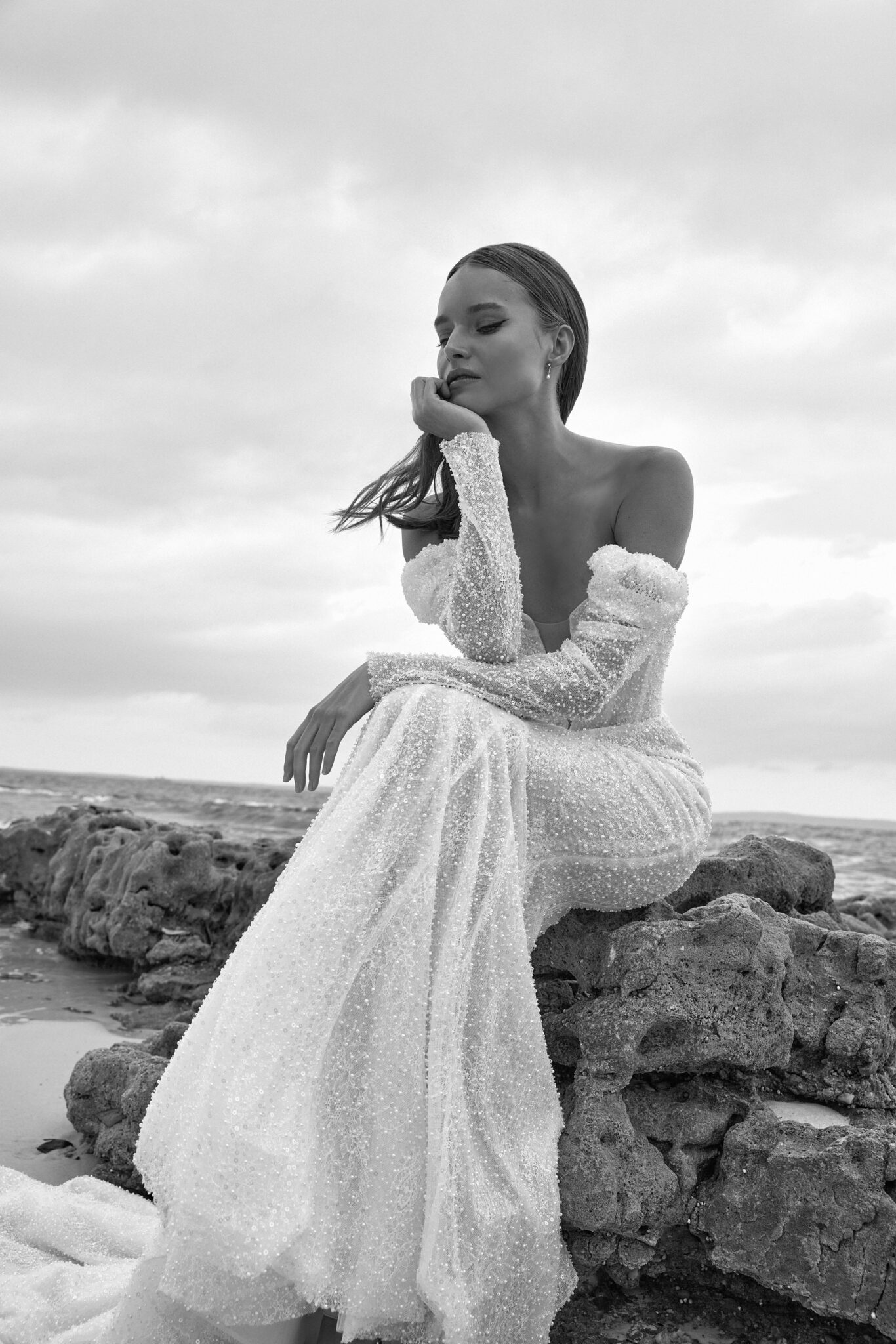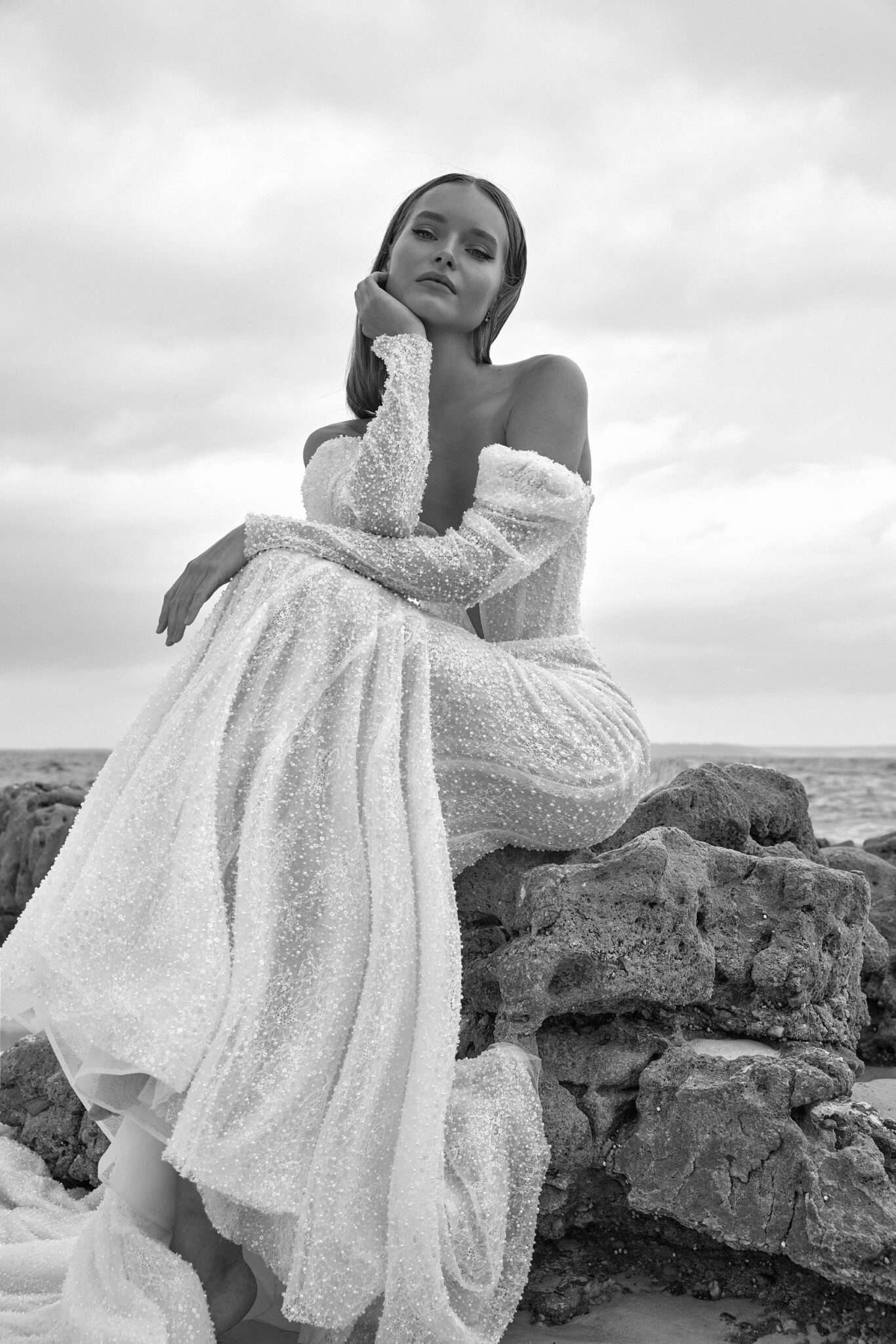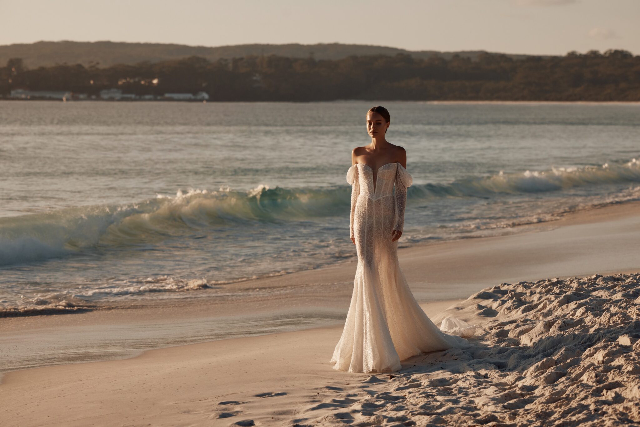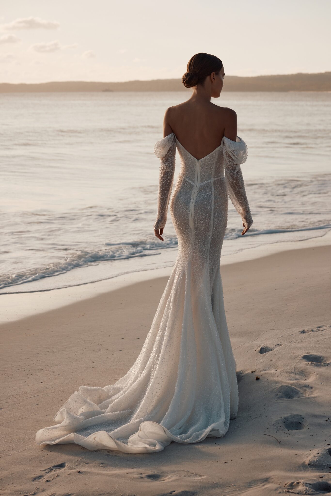 This mesmerizing wedding gown is a true embodiment of grace and glamour. Crafted from exquisite beaded mesh, it boasts a daring deep V-neckline, complemented by elegantly flowing off-the-shoulder sleeves.