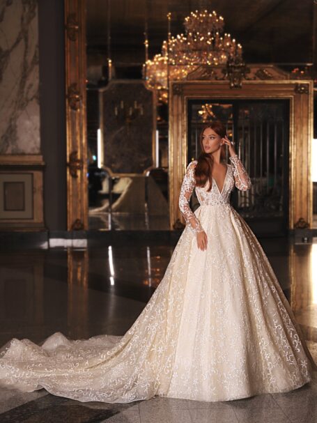 EdemShining and sparkling Azalia gown creates a magnificent wedding look. The dress is decorated with a V-shaped neckline and small cuts under arms. A bodice is decorated with small loose flowers that are also on found the waistline. The skirt is made of shining material with floral motives. It is also decorated with spangles and large flowers at the bottom. The skirt goes into a long train.