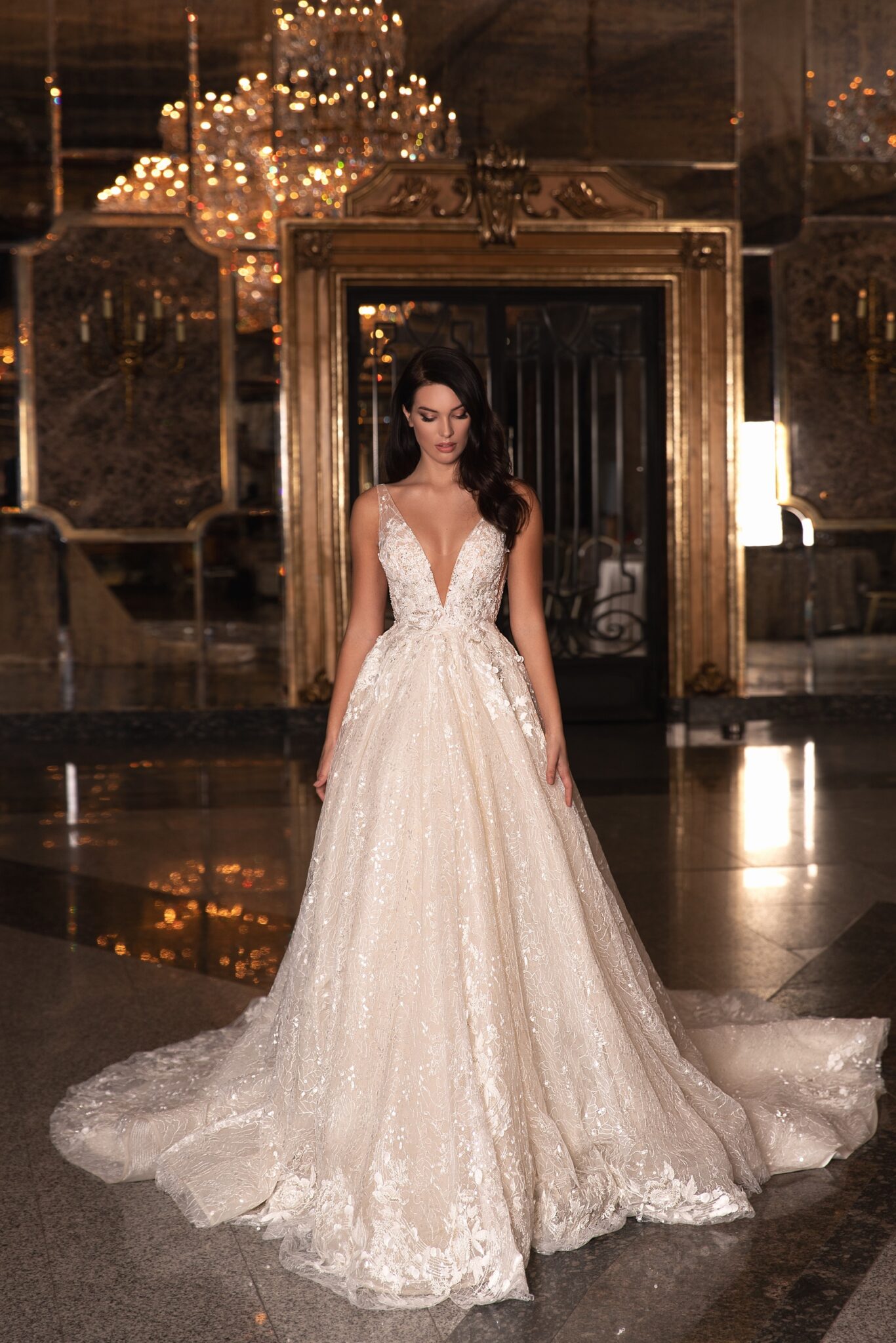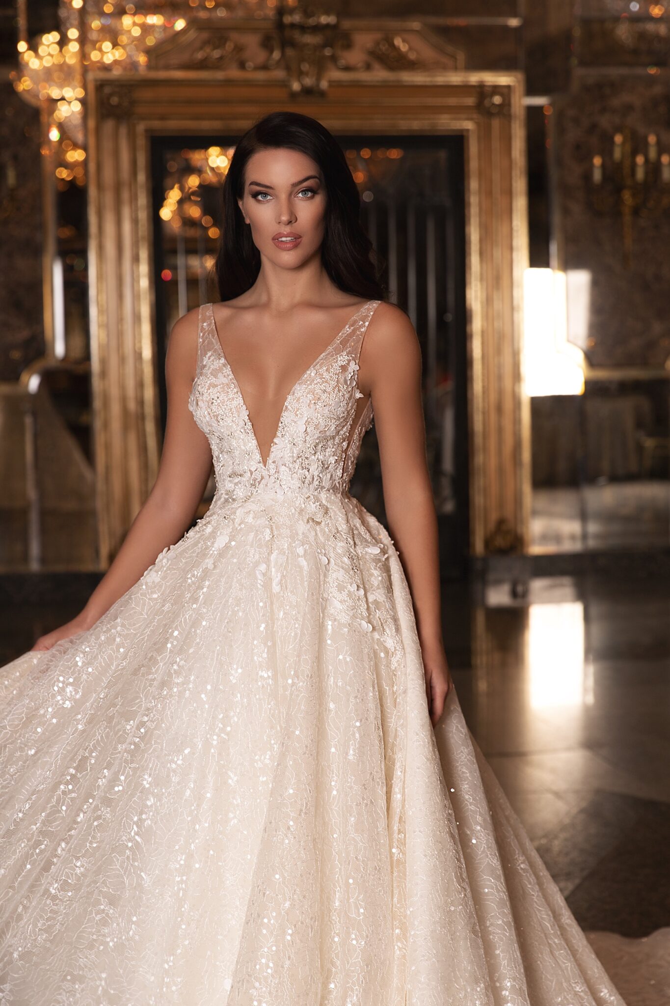 EdemShining and sparkling Azalia gown creates a magnificent wedding look. The dress is decorated with a V-shaped neckline and small cuts under arms. A bodice is decorated with small loose flowers that are also on found the waistline. The skirt is made of shining material with floral motives. It is also decorated with spangles and large flowers at the bottom. The skirt goes into a long train.
