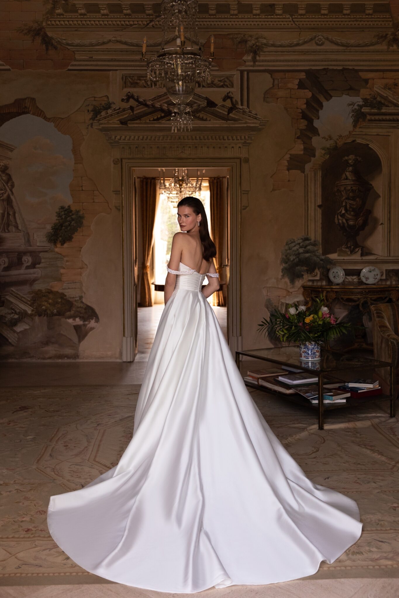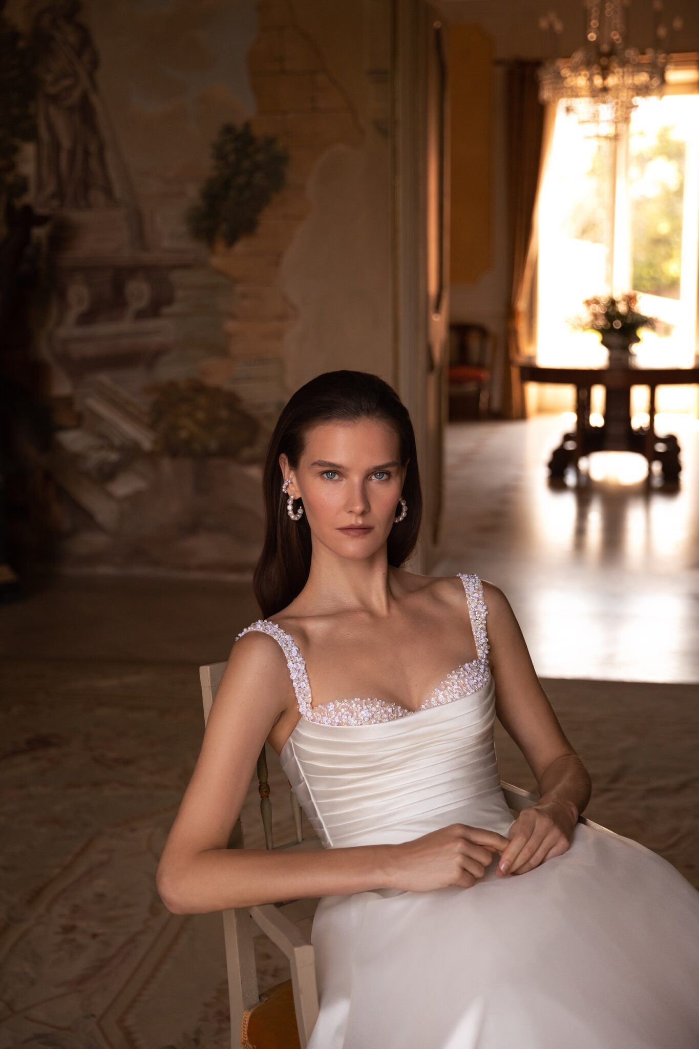 Palermo, Plus SizeAlluring and romantic this ball dress is made of soft satin with a fantastic decorated bodice. Geometric draping looks chic together with beatiful pearls that rest on the straps and sweetheart neckline. Clean, creamy Tulle A-line princess skirt features a soft cathedral-length train.