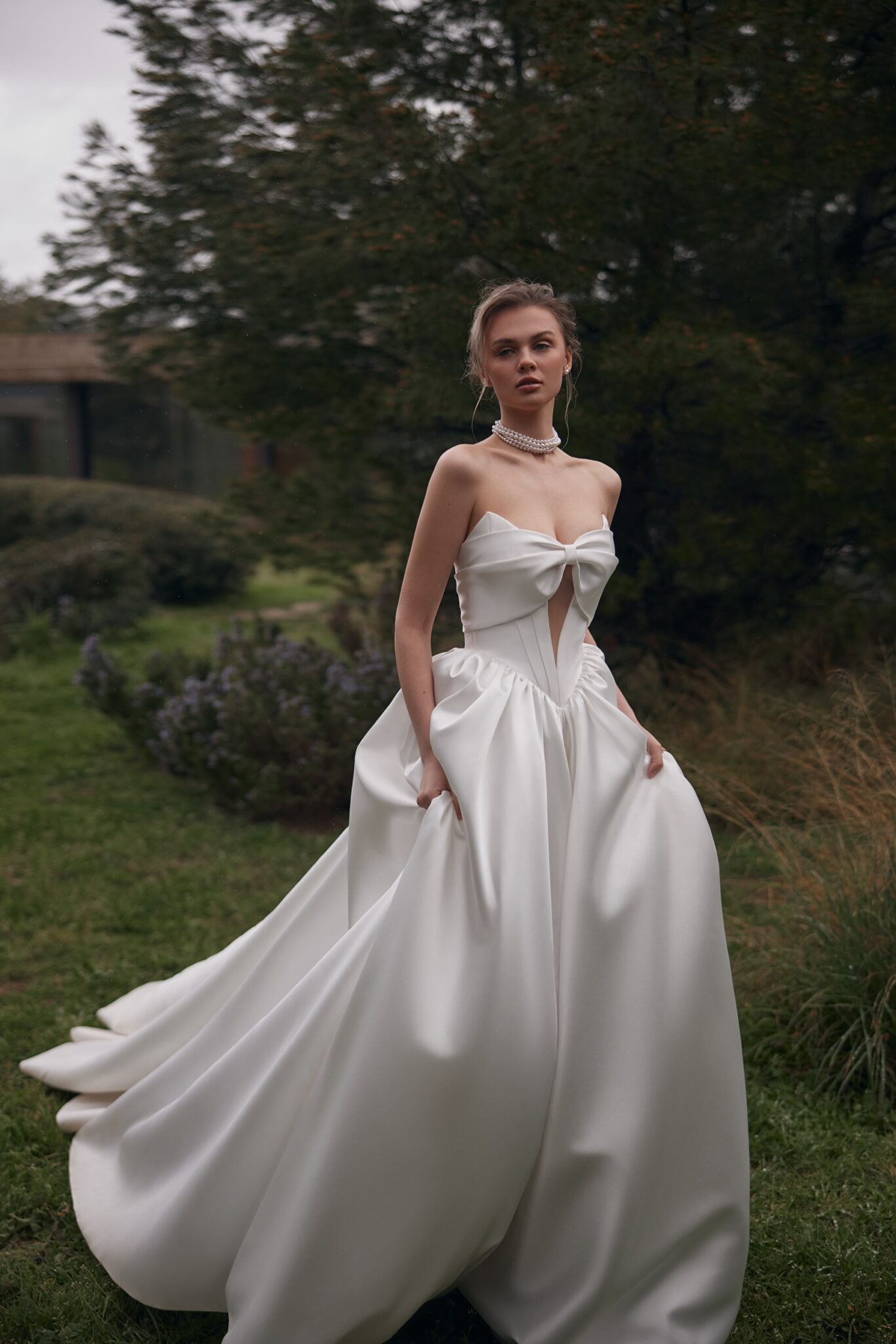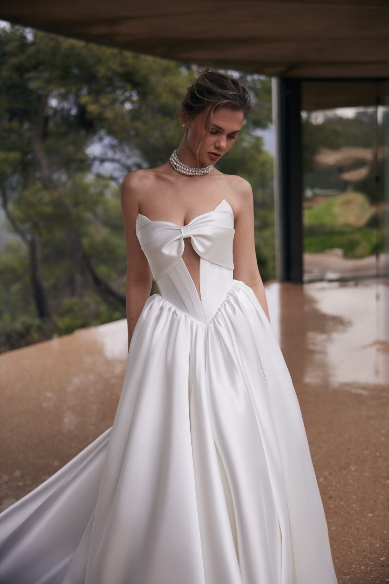 Additionally, the structured Mikado fabric ensures a flawless silhouette, while the minimalistic yet stylish design makes it perfect for both classic and modern brides. The bow detail enhances the romantic charm, making the dress a timeless choice for a wedding look.