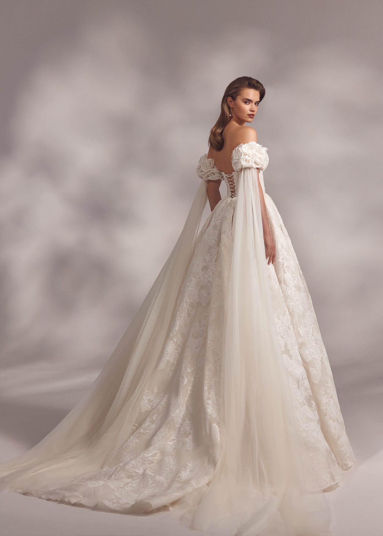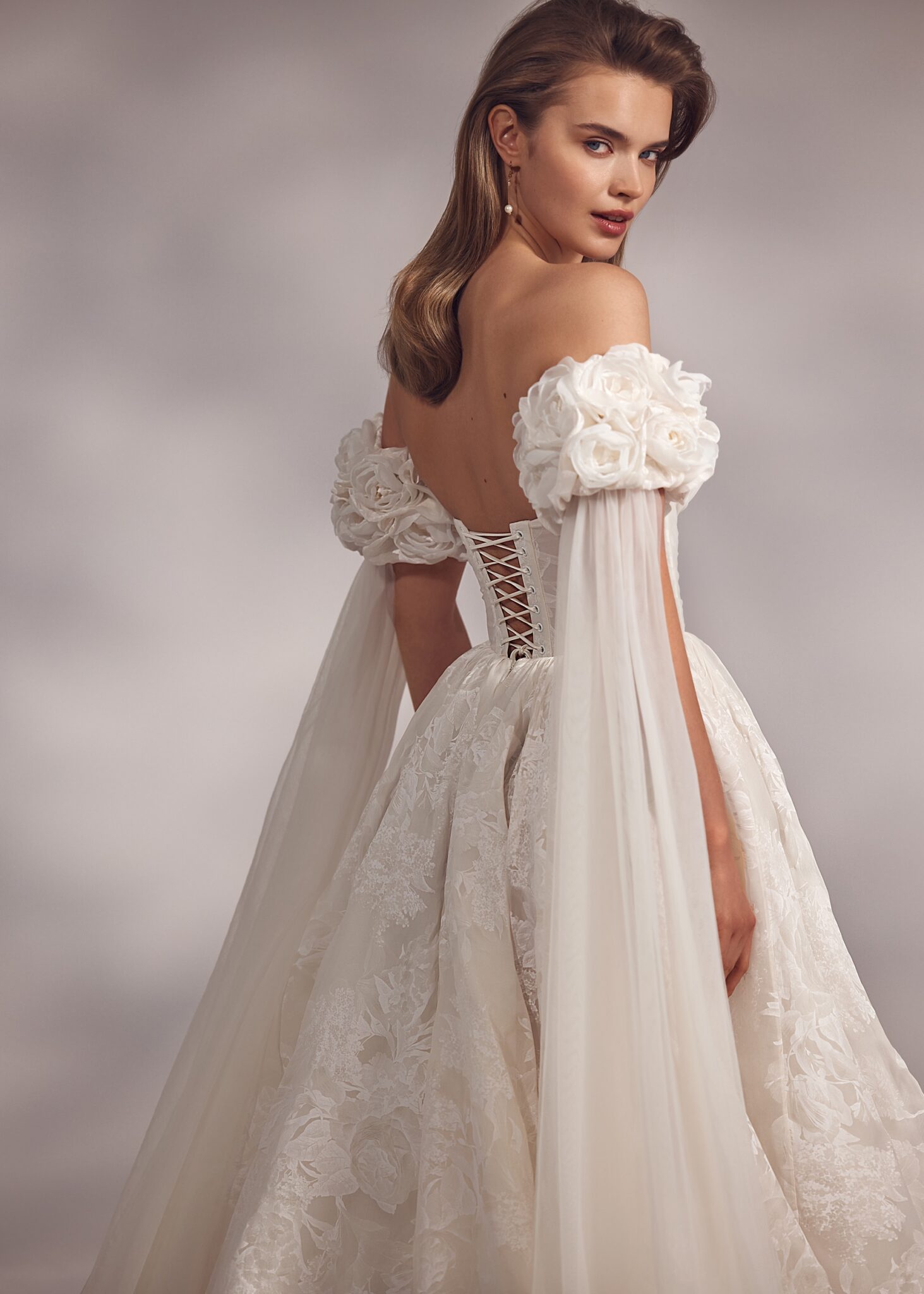 Less is More IV, Sample SaleBavaria – corset based detailed corset gown with firm cups covered with a translucent mesh layer adding lightness and elegance. The skirt is also layered and featured floral embroideries all over the length. Bavaria is complemented by detachable floral trailed sleeves.