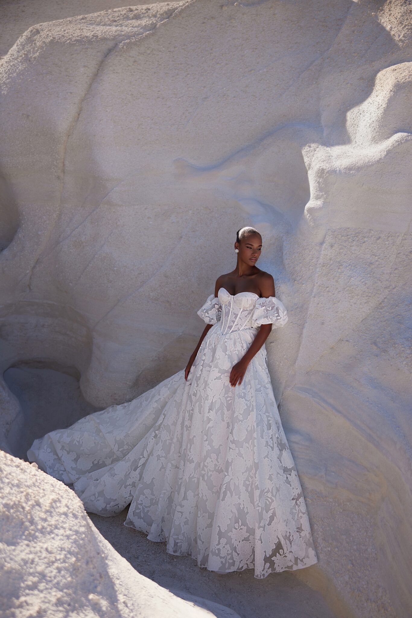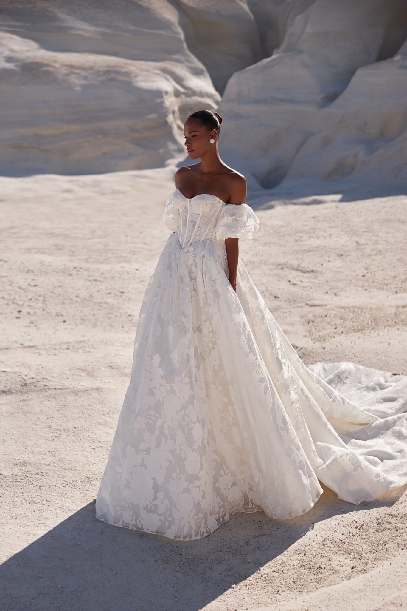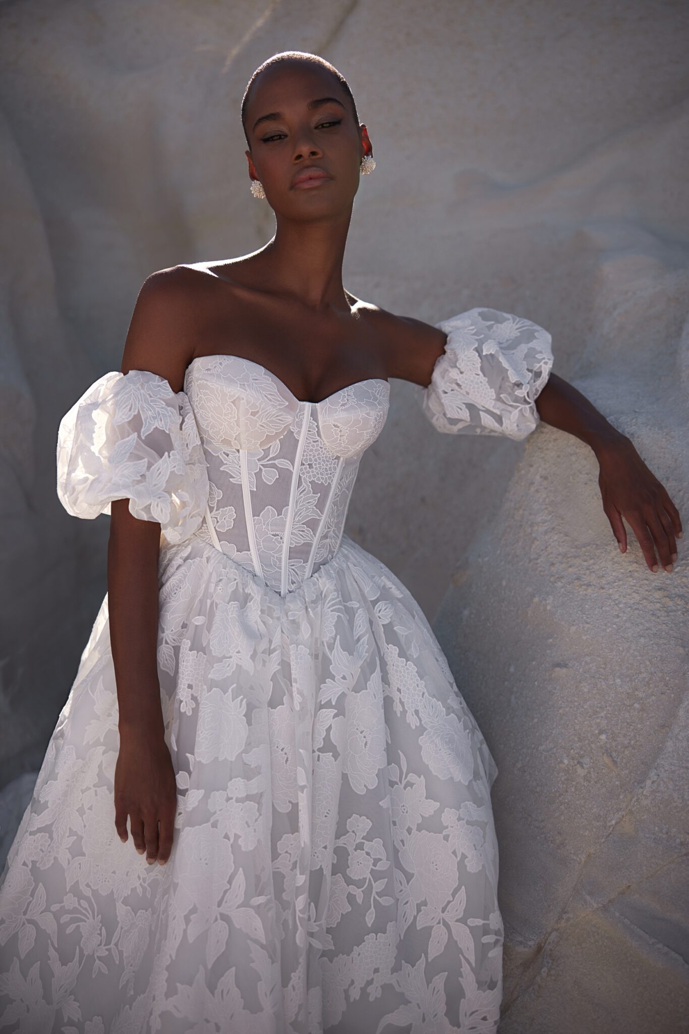 Venus, Plus SizeTender corset gown made of semi-sheer fabric with silky floral ornaments. The base of the dress is a firm corset featuring a sweetheart neckline, while the bottom is a classic gown descending freely from the basque waistline. Detachable puff sleeves add lightness and playfulness to the ensemble.