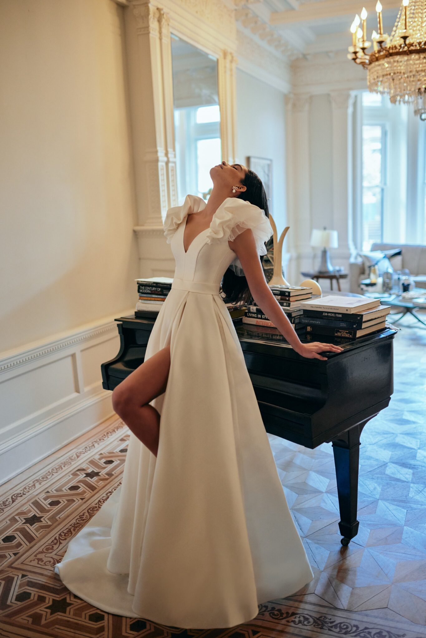 Love in the CityThis fantastic A-line dress is made if glossy satin and has classic silhouette. The top of the dress is featured with deep V-neckline and volumetric sleeves. The delicate belt of the same fabric accentuates the waistline and the back of the dress is opened through the V-neckline. The skirt falls loosely, has a high cut on one legg and a long royal train.