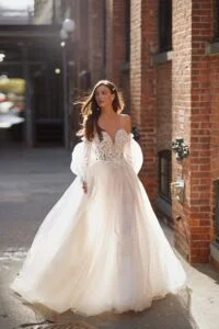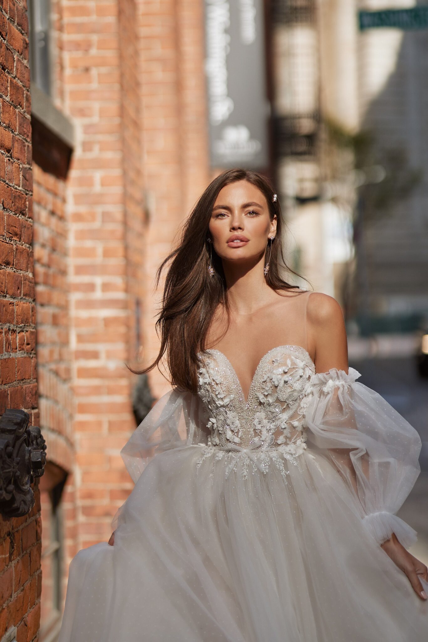 Love in the CityBelmont is a romantic A-silhouette gown created of weightless fabrics. The shoulders of the bride are completely opened as the corset is strapless, held on the transparent netting. A delicate corsage is decorated with lowered shoulders and transparent sleeves. The skirt is made of weightless Tulle and has long train.