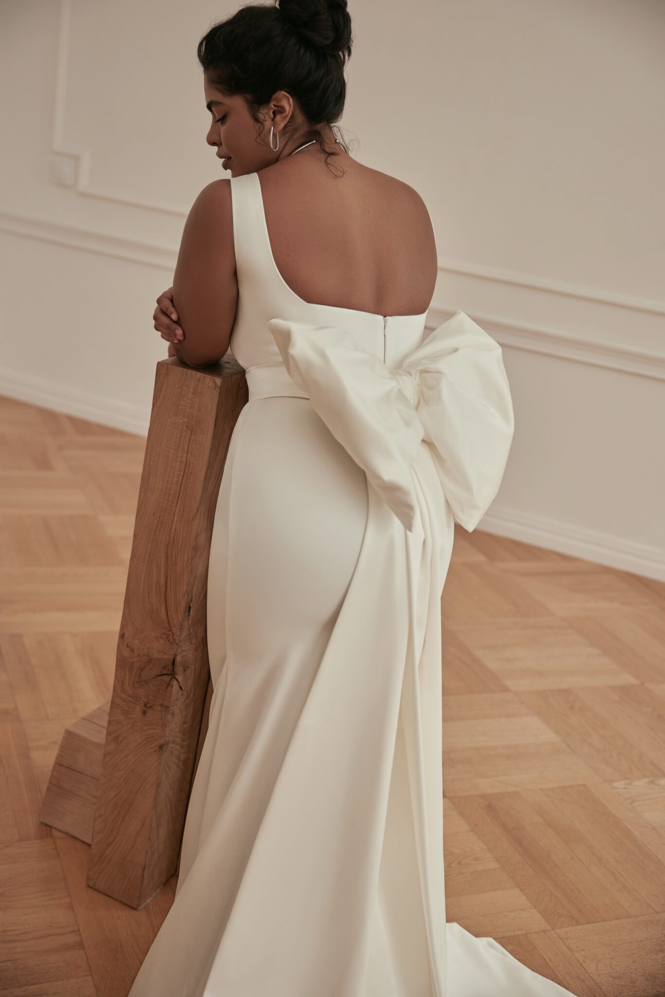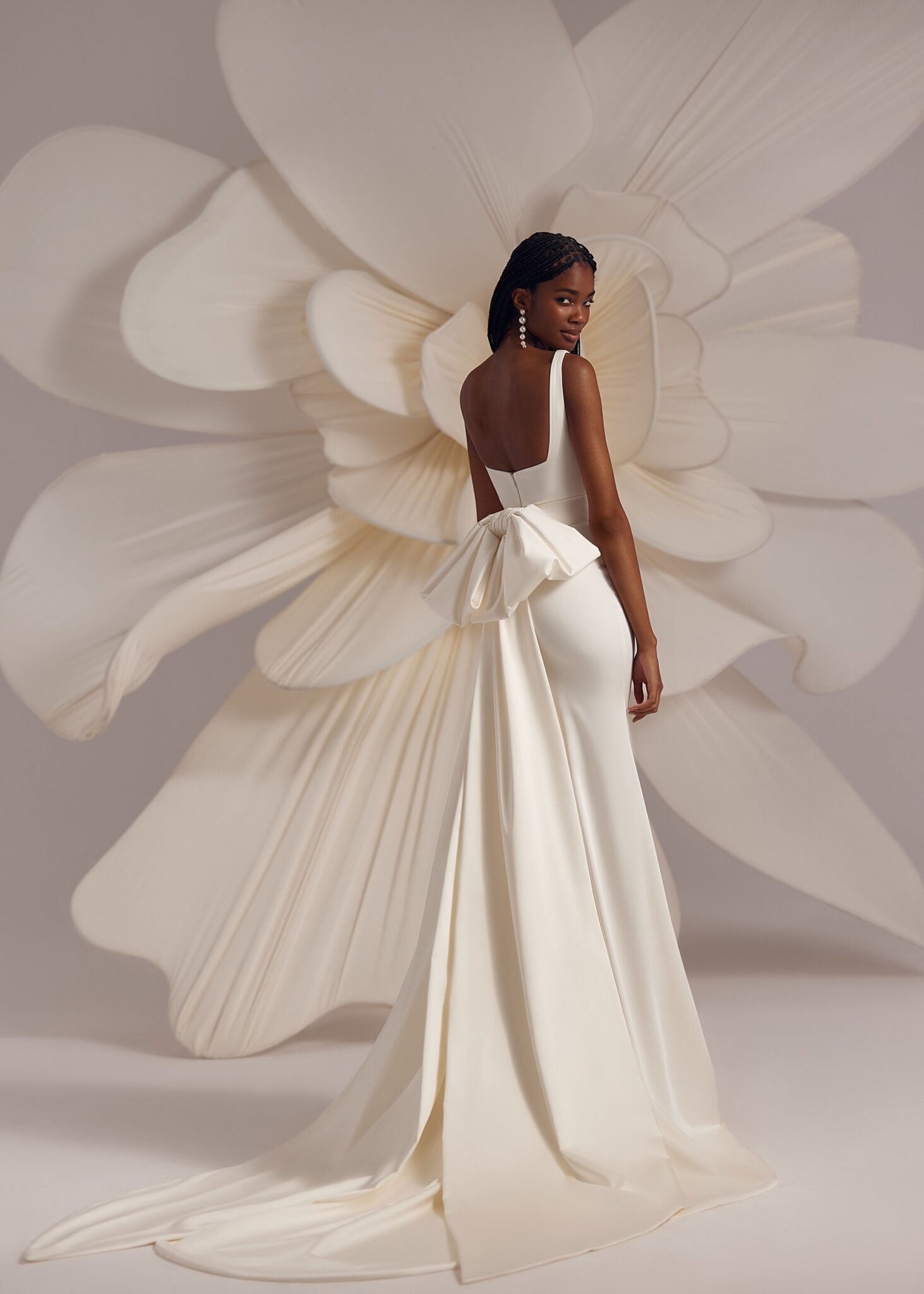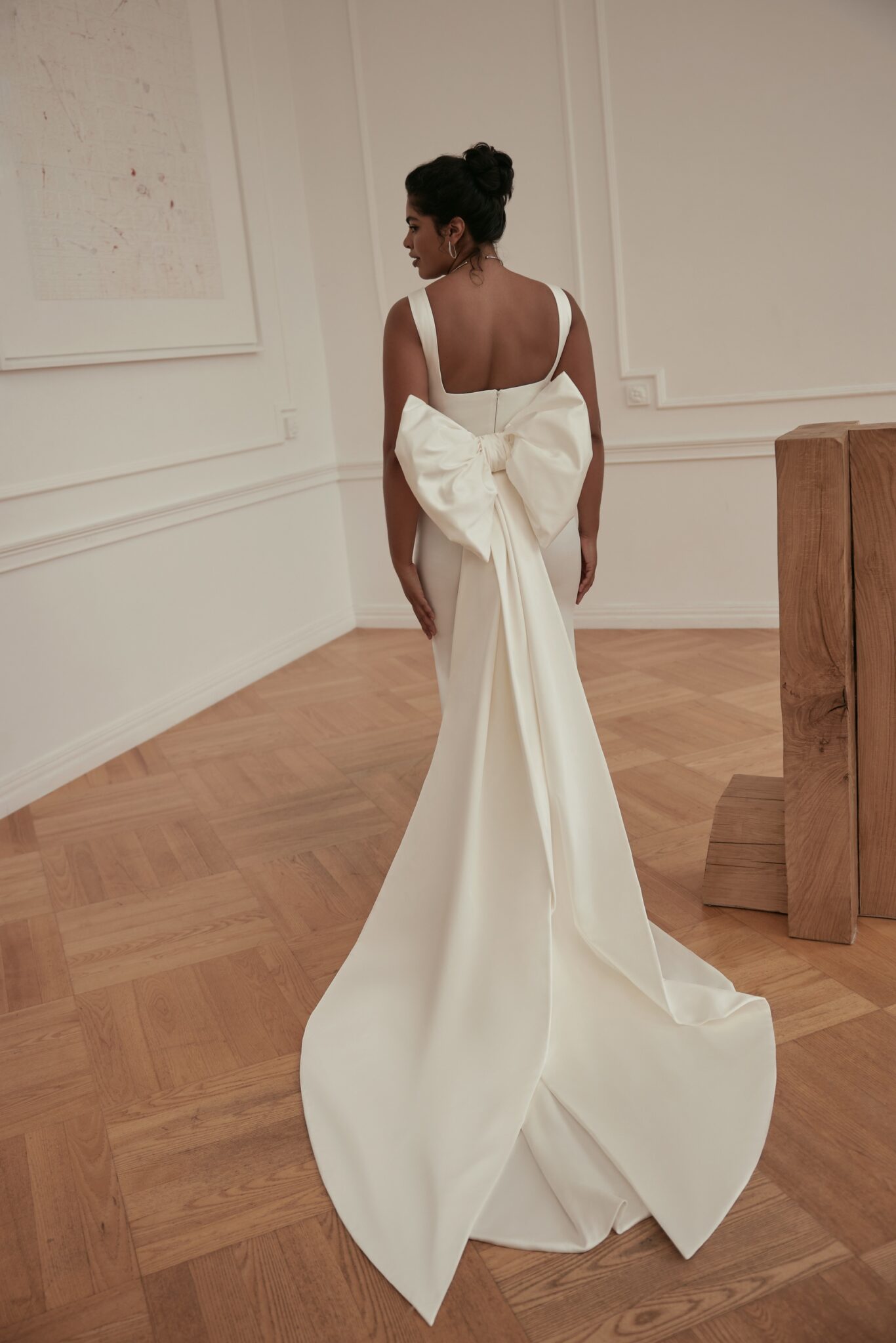 Less is More IVBertie – strapped square neckline fitted dress with elongated skirt and a detachable wide ribbon bow on the back. Complemented with a transparent veil decorated with voluminous flowers on the edge.