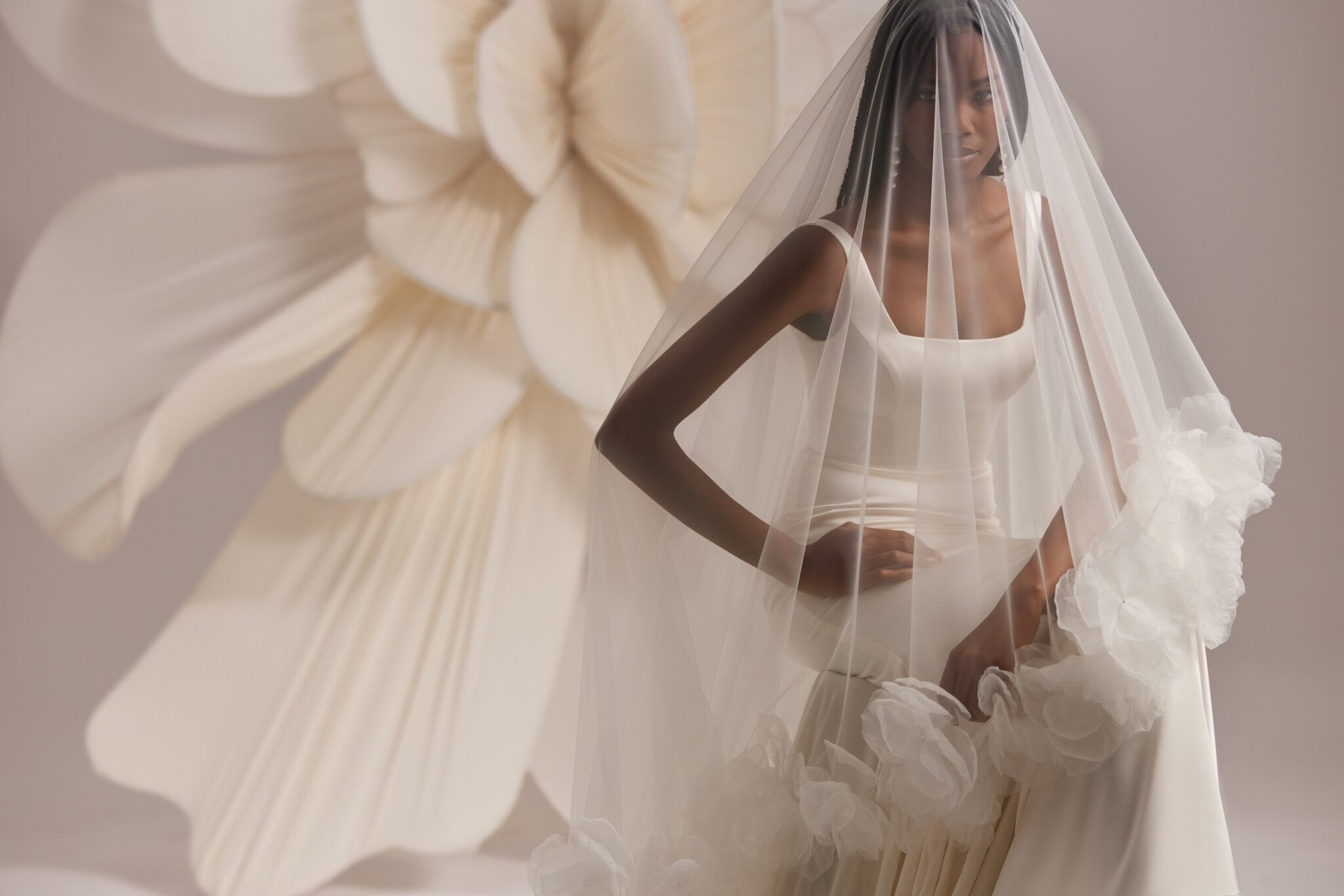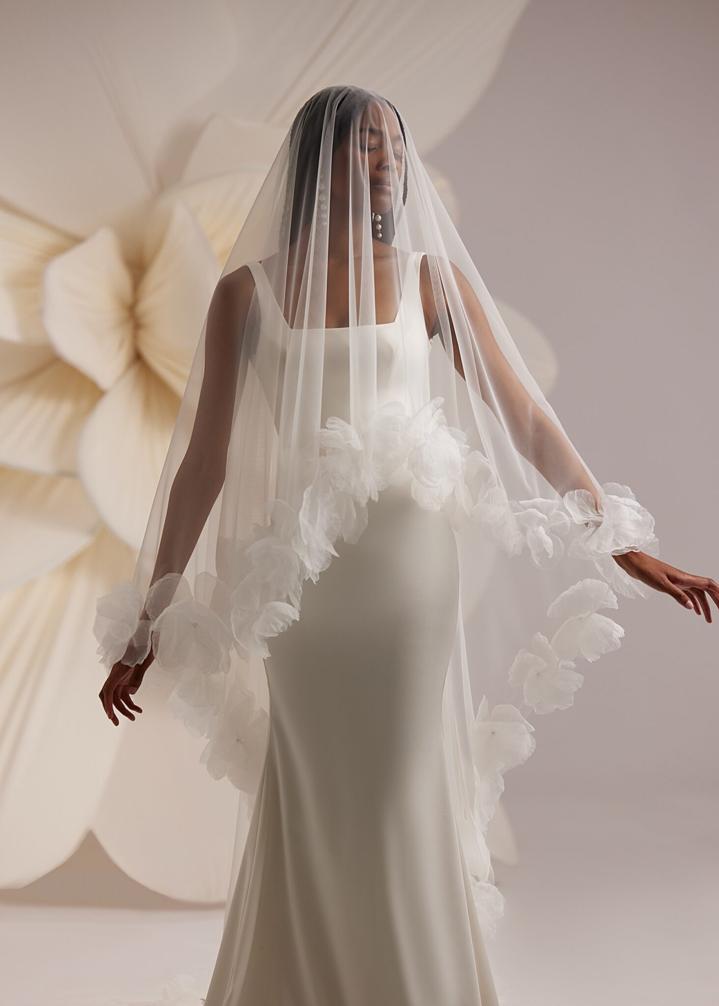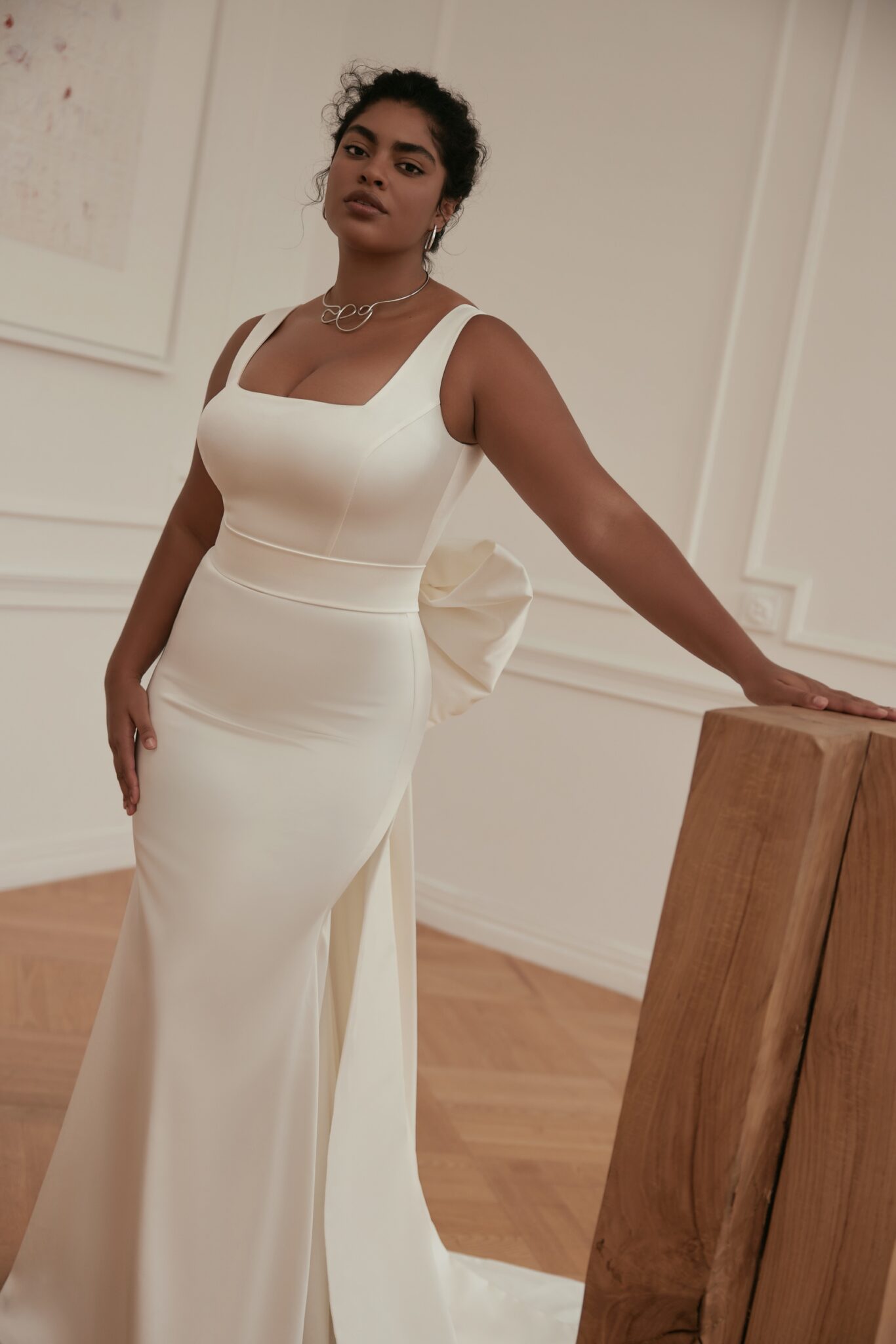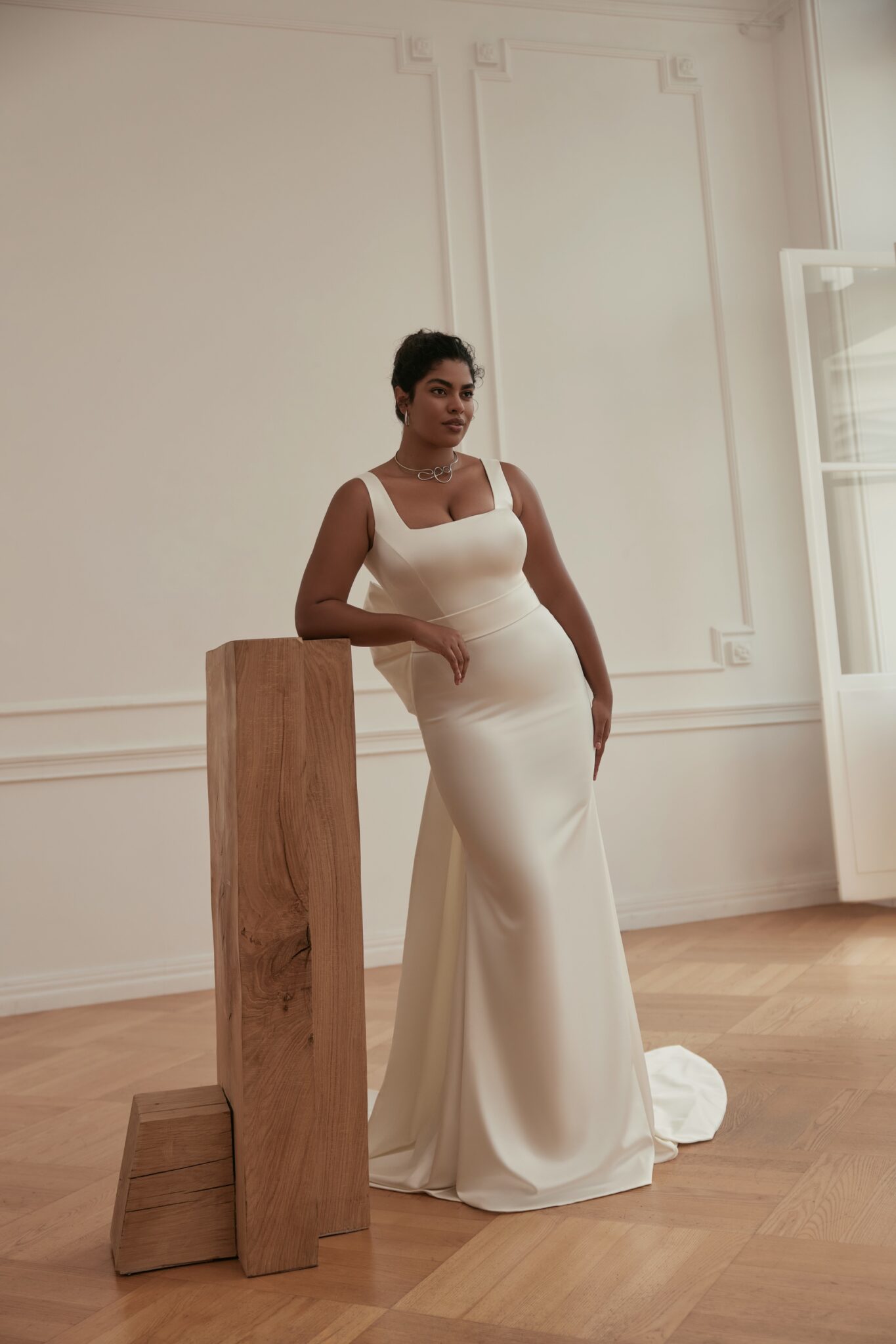 Less is More IVBertie – strapped square neckline fitted dress with elongated skirt and a detachable wide ribbon bow on the back. Complemented with a transparent veil decorated with voluminous flowers on the edge.