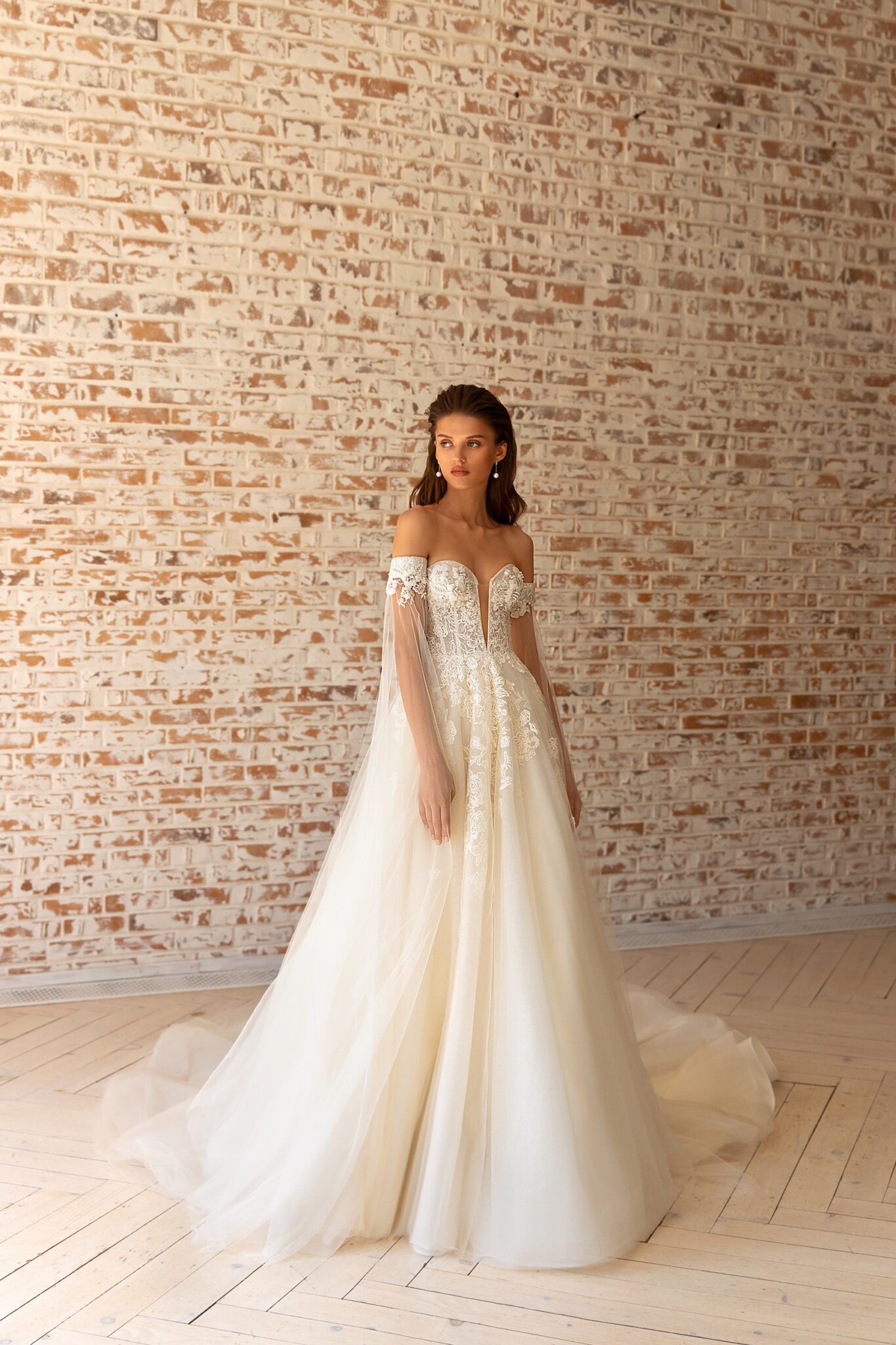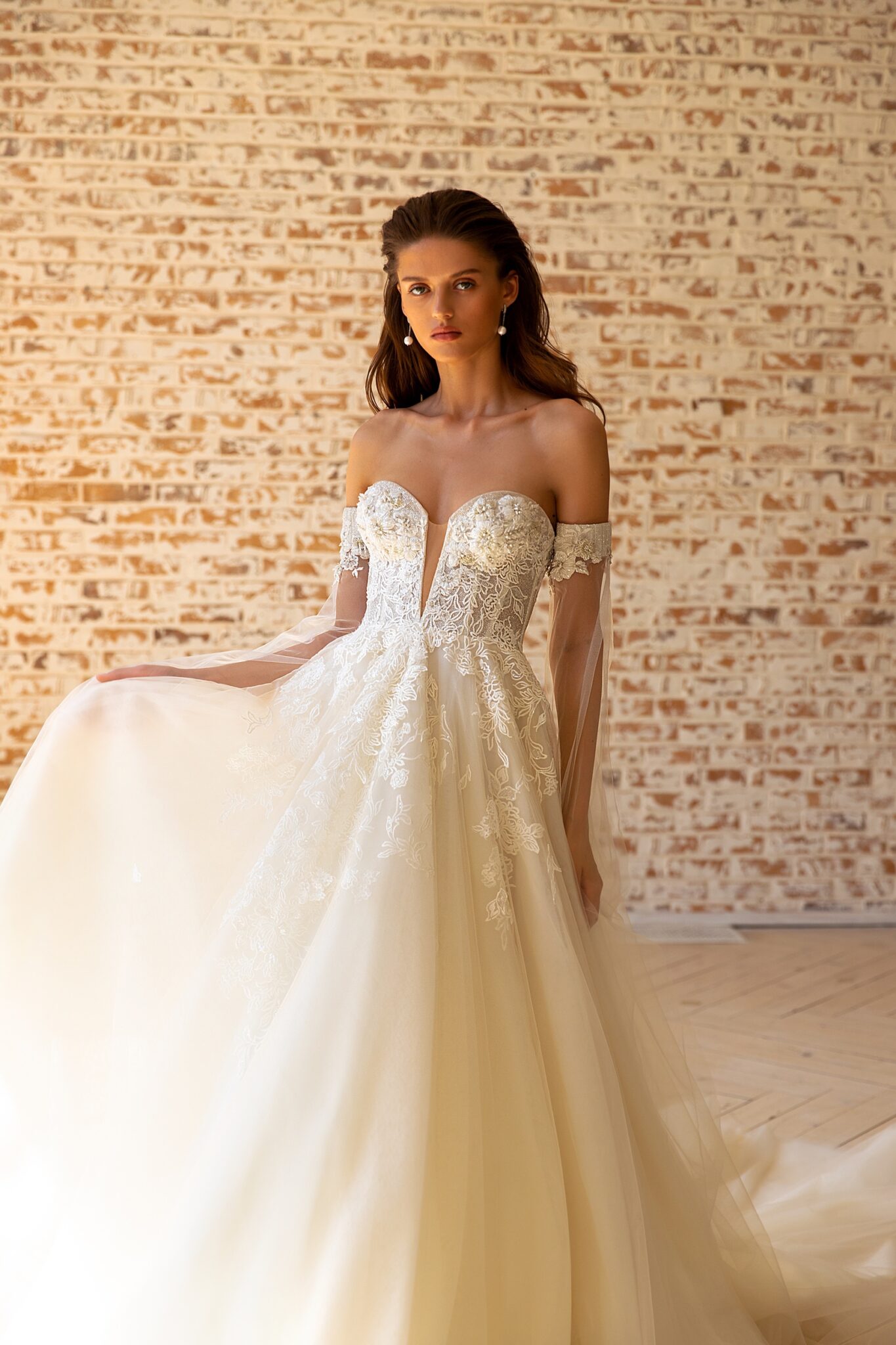 RomanceLace Betsy A-line wedding gown looks fabulous. Lowered shoulders and a low neck look tender and romantic. The dress is decorated with small flowers and leaves. The long magnificent tail is worth noticing. An upper part is made of a small lace leaves that are embellished with beads and crystals. Deep low neck and courage lines are decorated with pearls. The skirt is made of high-quality fabric.