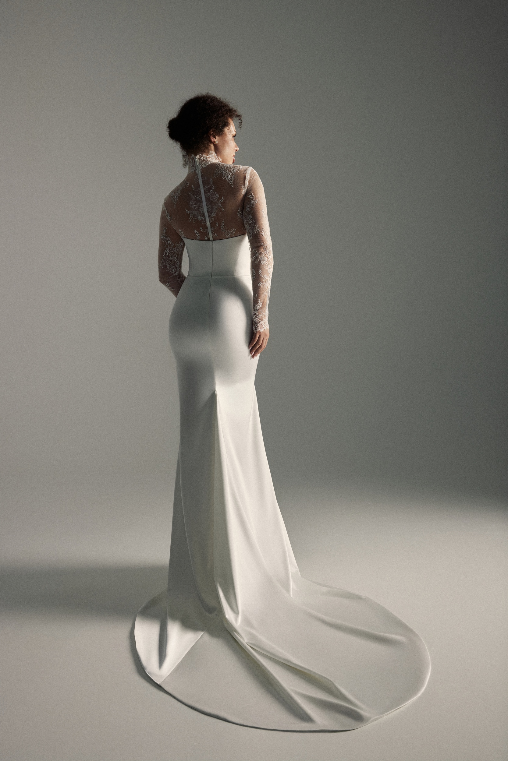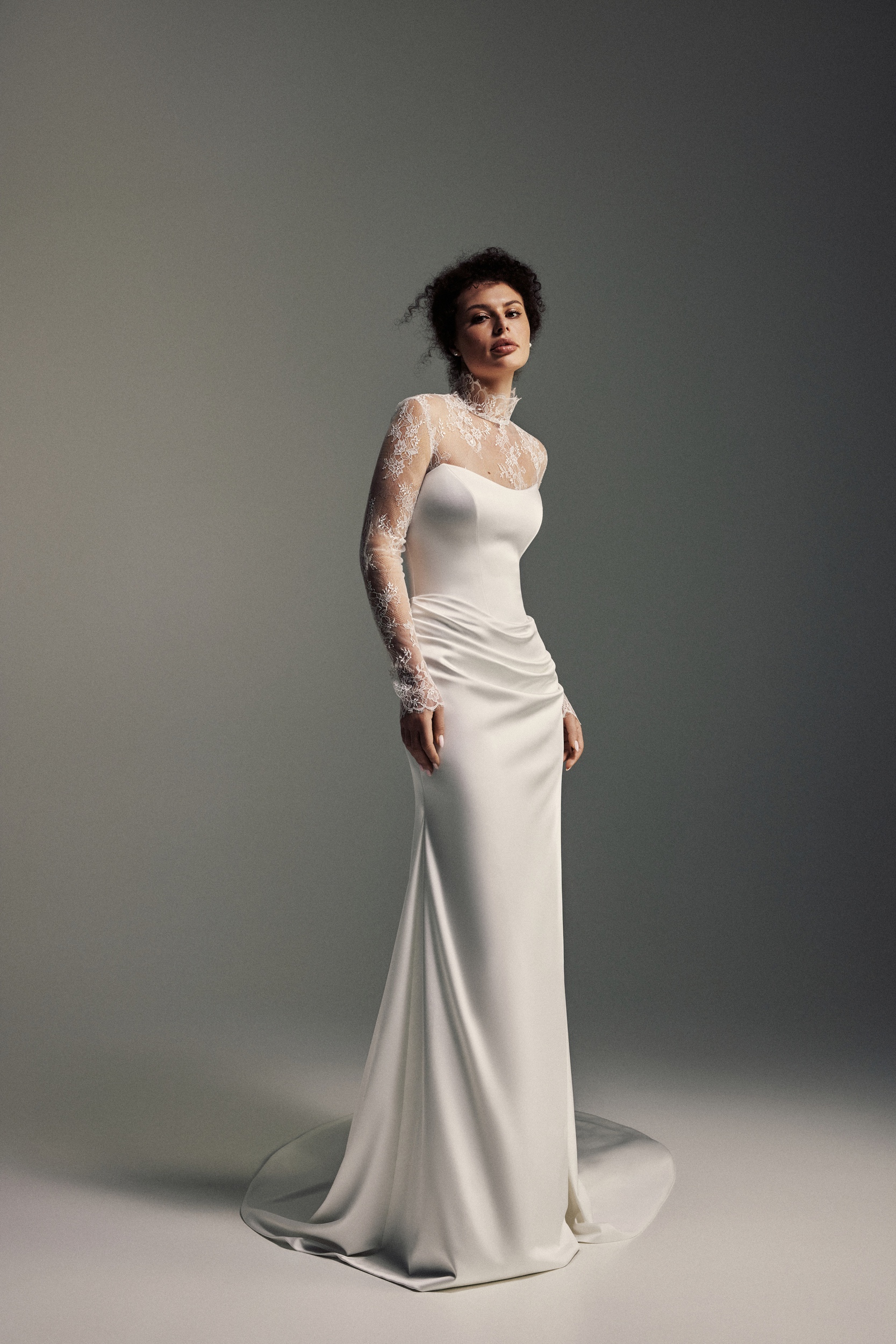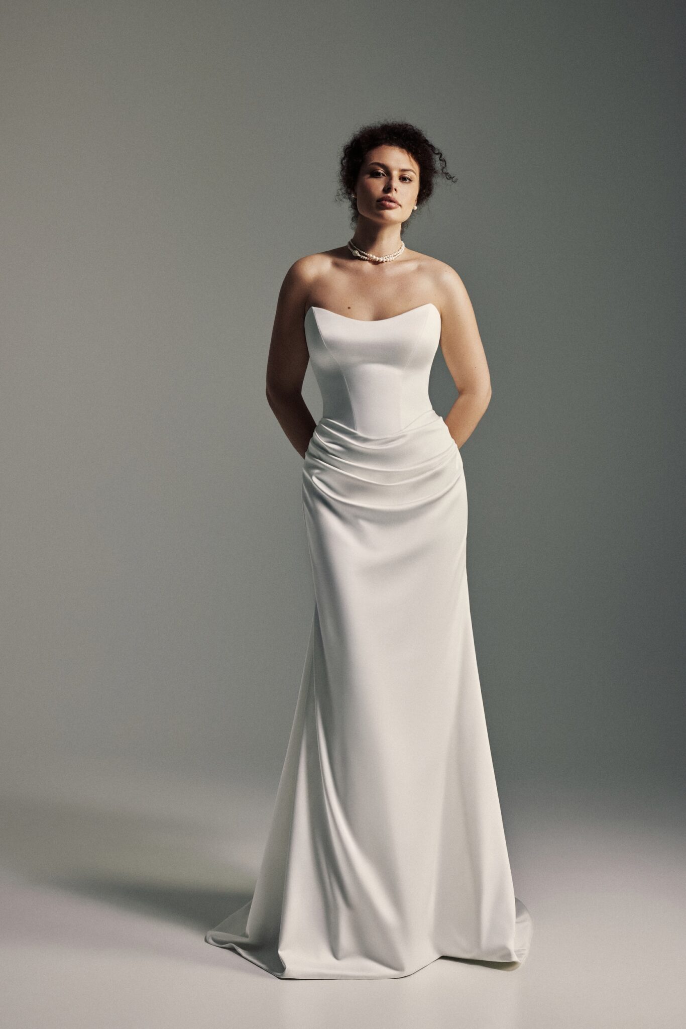 Blooming LoveBillie is a sleek and confident gown that highlights the beauty of clean lines and modern femininity, featuring a sheath silhouette with soft draping at the waist that enhances the figure and creates an effortless flow. A sculpted strapless corset defines the bodice, while a low back adds subtle allure, complemented by a graceful chapel-length train; for a versatile bridal look, Billie can be styled with an optional lace bolero, offering a refined transition from ceremony to celebration.