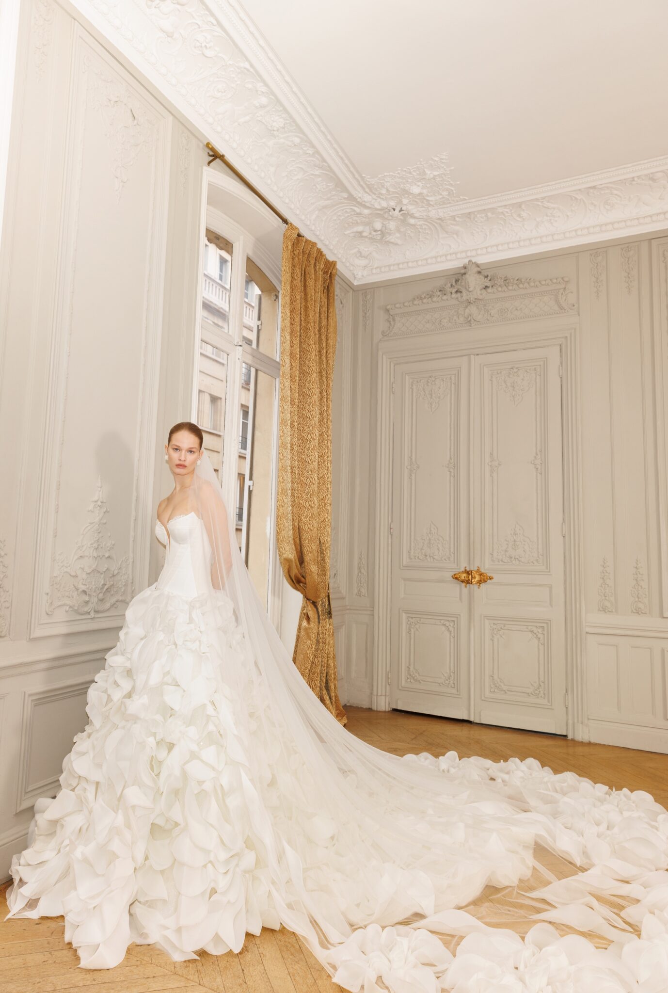 Atelier Lumiére, Plus SizeOne of the most elaborated designs: hand-crafted floral appliqués adorning the whole dress from the heart-shaped open-shoulder neckline to the very bottom of the train. Long sleeves feature frilled cuffs being an extra touch of tenderness to the meticulous yet deeply feminine piece. The dress also features a veil decorated with the same floral appliquès.