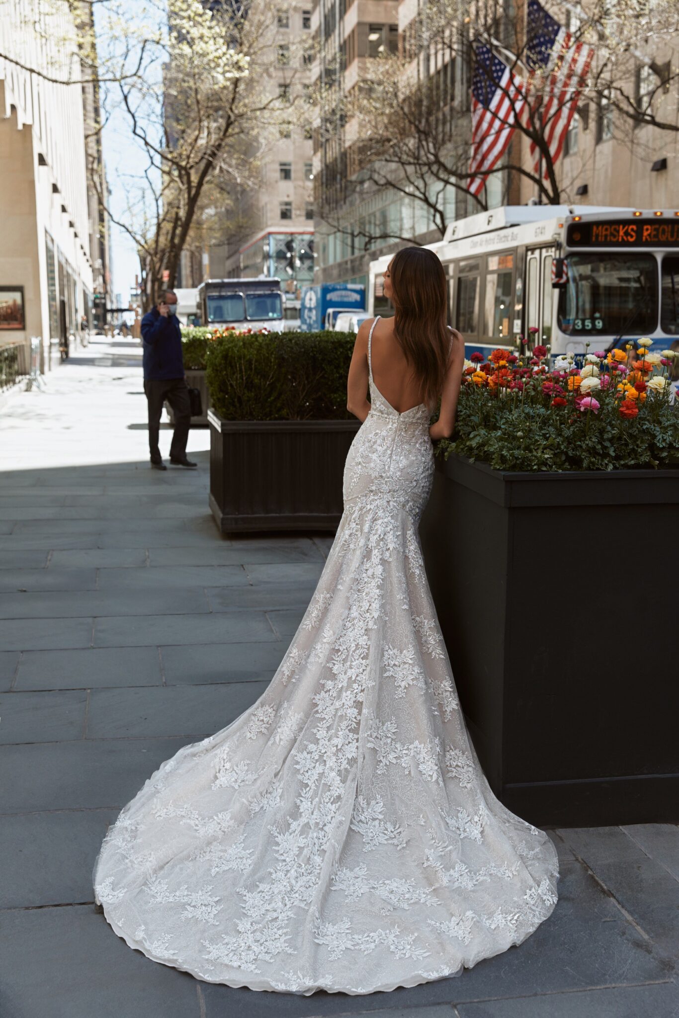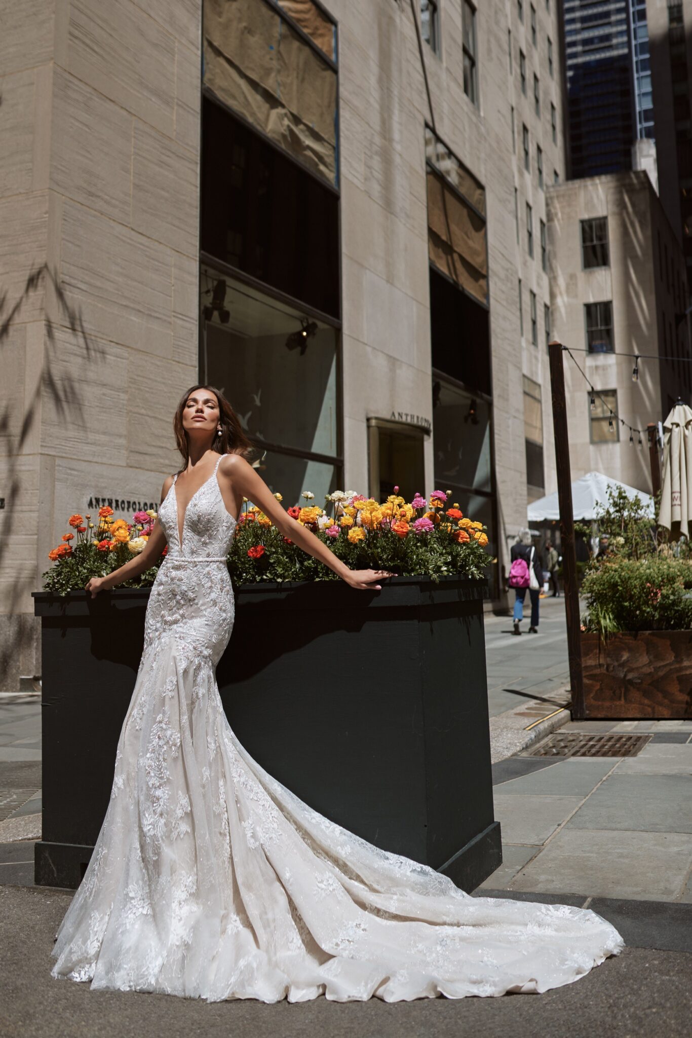 Love in the CityBlair is a classic mermaid-silhouette gown decorated with embroidered lace along the whole length. The coset is embellished with deep V-neckline with thin straps and waistbelt. The skirt widens down from the hips and has a long train.