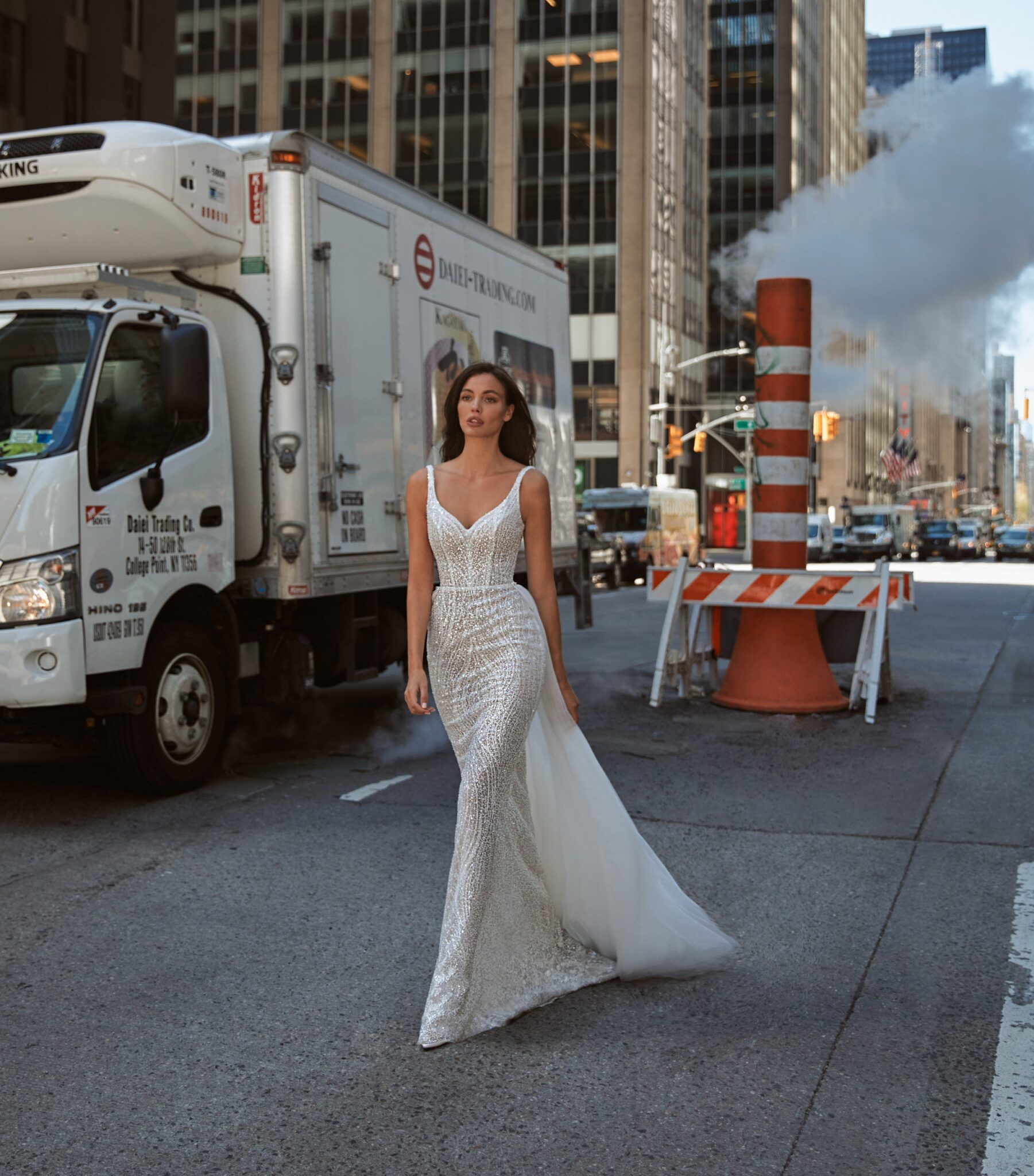 Love in the City, Plus Size, Sample SaleBlanche is a sparkling and shining bridal gown, the sheath dress is decorated with sequins and beads and has a delicate V-neckline. The additional skirt is made of semi-transparent Tulle and is fixed on the waistline. The skirt is detachable and ends with an elegant train.