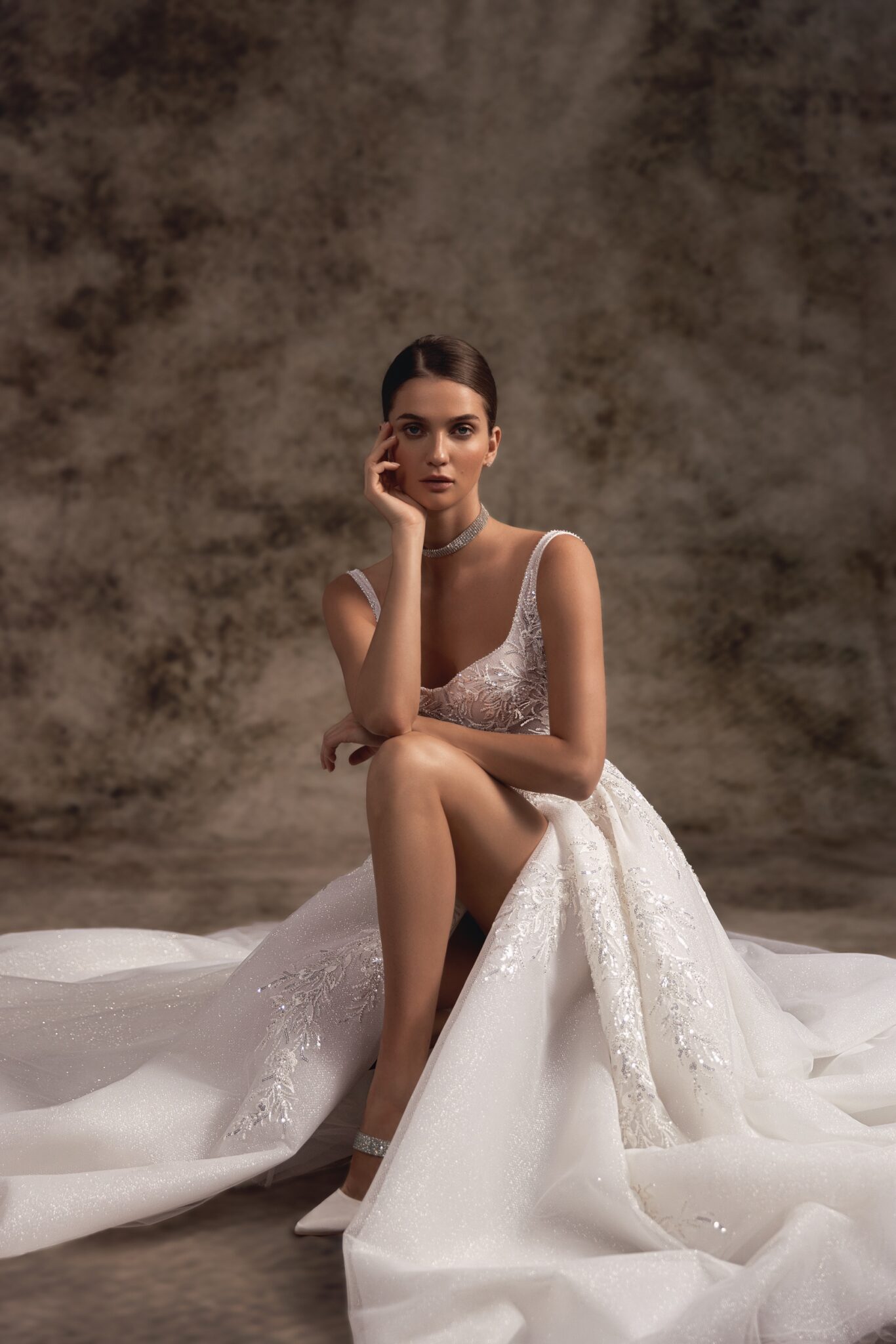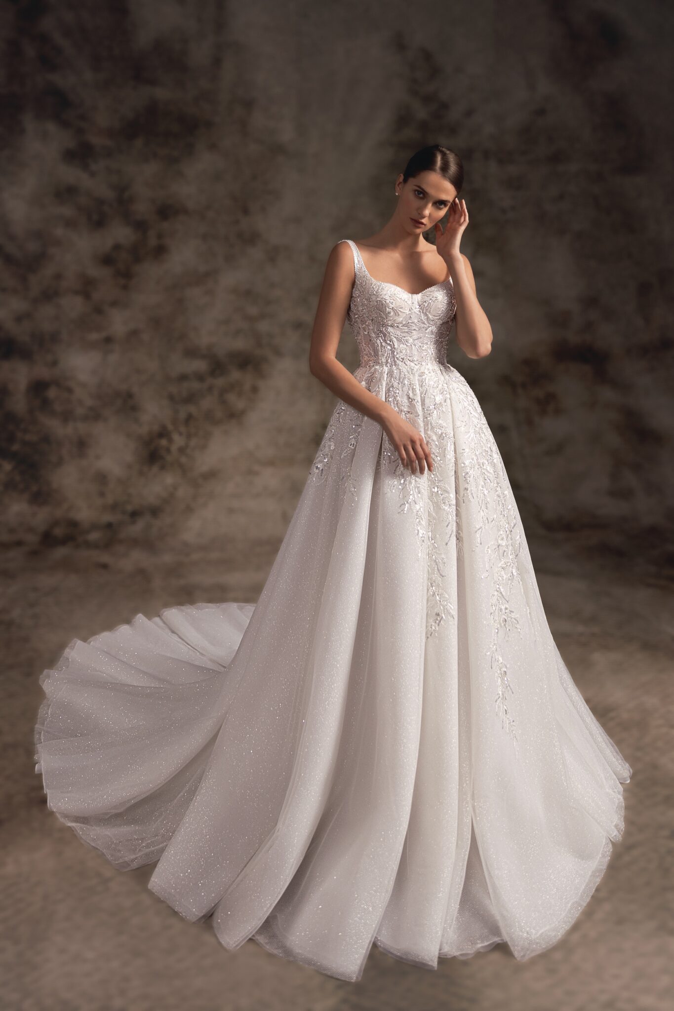 Notte d'OperaA femininely structured A-line wedding gown with soft sweetheart neckline with delicate shoulder straps with exposed boning. The spectacular embroidered glitter Tulle covers the skirt from the waistline and the wow-worthy aspect is hidden in a high slit on one leg. The skirt is embellished with an extra-long train.