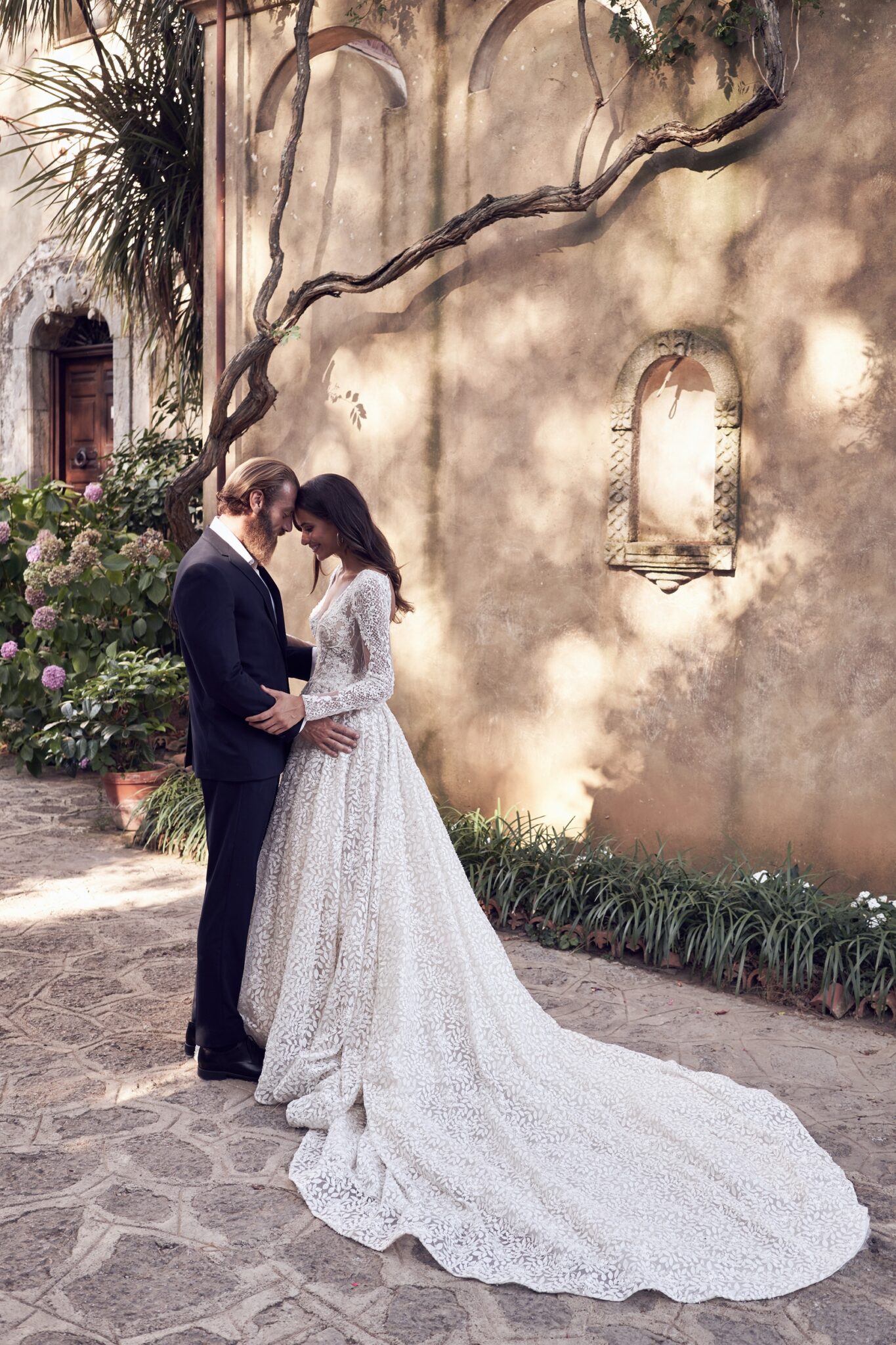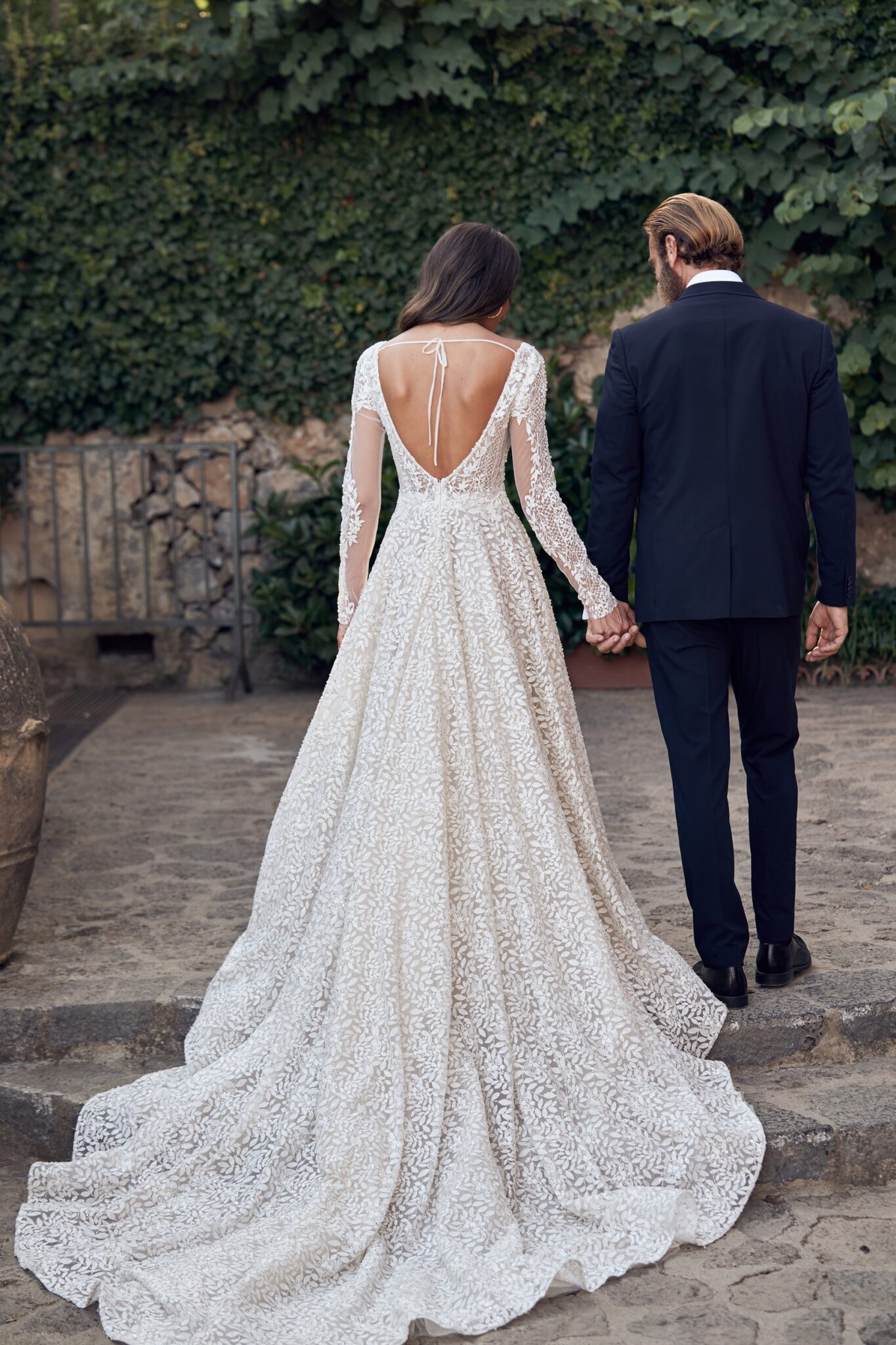 Love storiesA-line Brenda wedding dress is made of high-quality fabric. Hug shoulder runs into a big neckline at the back of a dress. Small lace leaves ornament the whole dress. Long sleeves are decorated with small lace flowers and sheer insets. A tail gives the finishing touches.